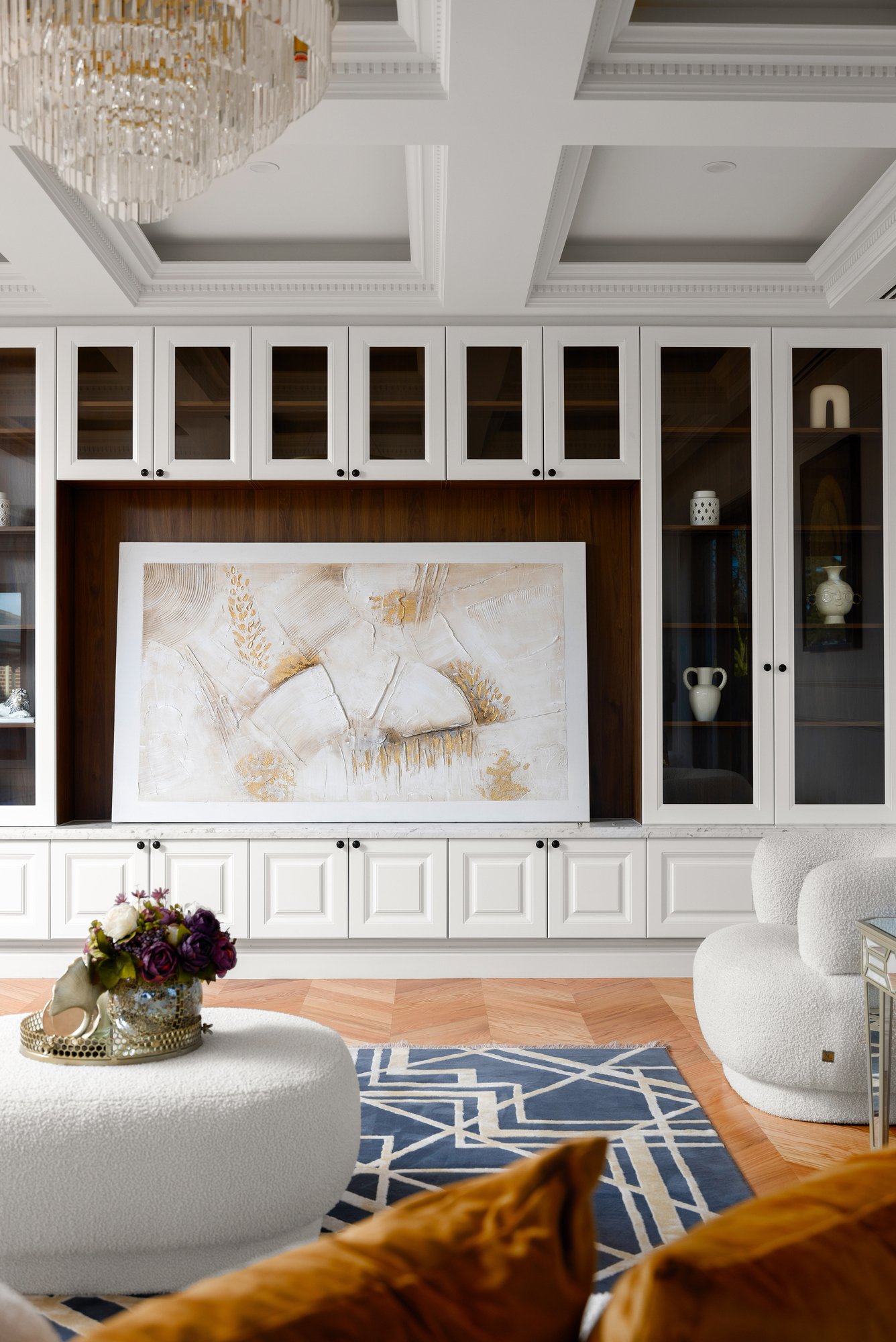 Every element of this home reflects precision, quality, and intent—from the designer light fittings and soaring ceilings to the carefully selected materials that bring warmth and texture to the interiors. The wide hallways, chandelier-lit voids, and timeless monochrome palette enhance the sense of space and drama at every turn.