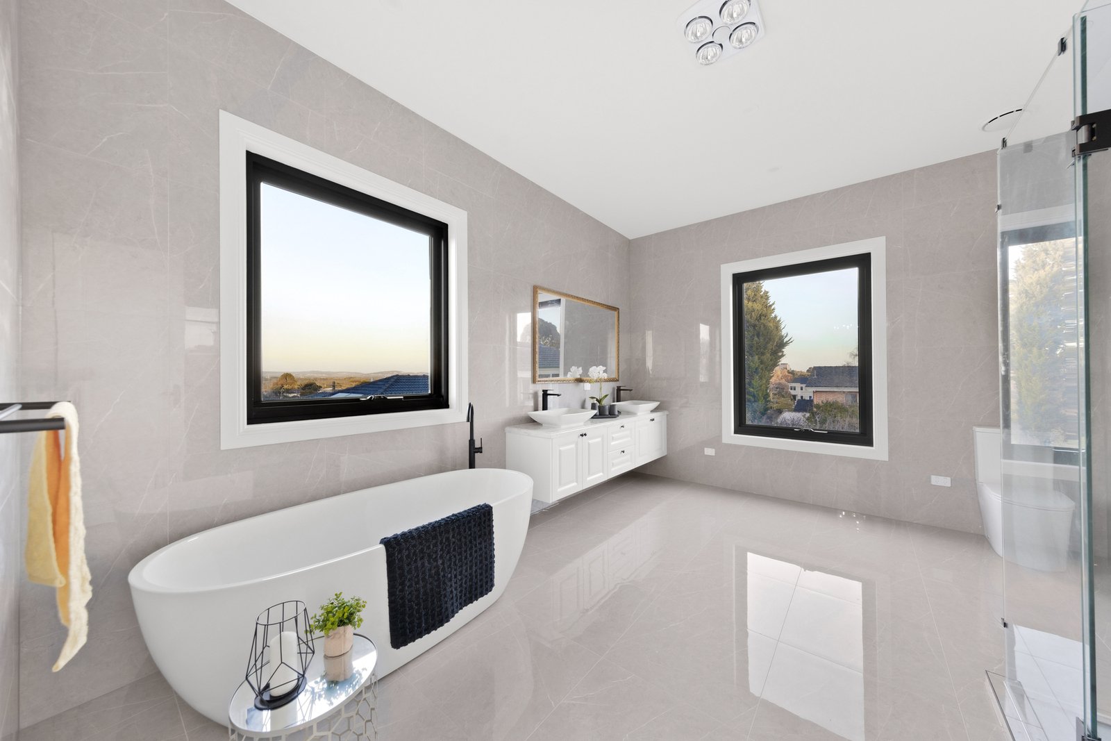 Upstairs, every bedroom is a private sanctuary, each with its own fully tiled designer ensuite. The expansive master suite is a private haven, complete with dual walk-in robes, a sumptuous dressing area, and a luxurious ensuite with freestanding tub, double vanity, and sweeping views toward the distant ranges. An open retreat lounge with custom bar and cabinetry creates the ideal setting for family relaxation, while the adjoining study—with wall-to-wall cabinetry and custom shelving—makes working from home a genuine pleasure.
