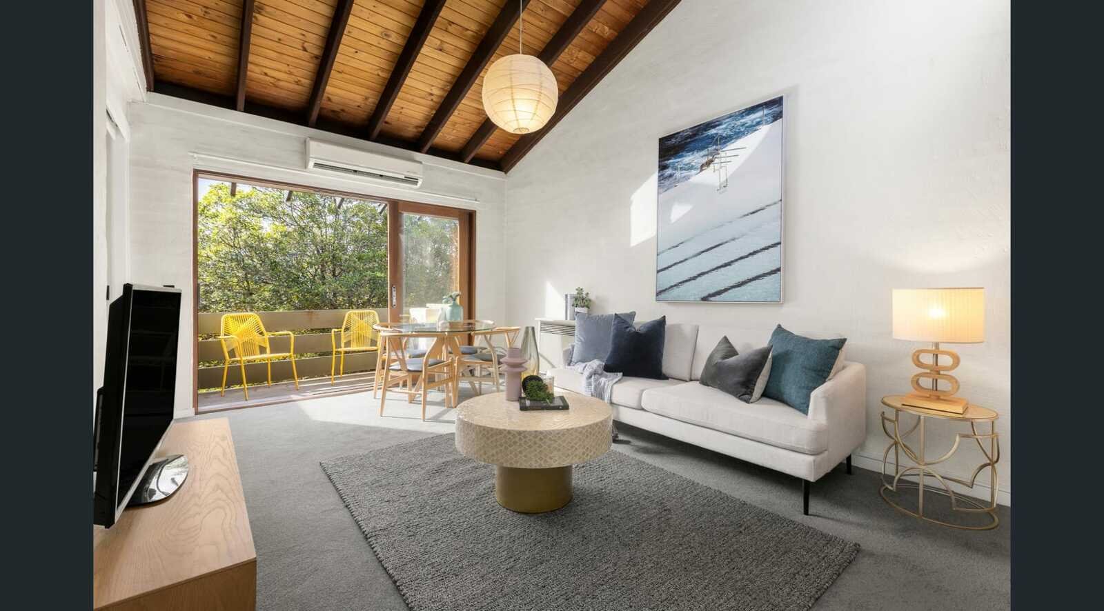 Set privately to the rear with no shared walls and secure entry, this sunlit abode captures a perfect sense of elevation and escape. Soaring raked ceilings, a leafy treetop outlook, and bright north-facing living enhance its vintage vibe, while the Blanco-equipped kitchen and updated bathroom add comfort and convenience. One of the robed bedrooms catches the northern sun and offers flexible use as a light-filled sitting or dining room, while the other is peacefully zoned with a sleek bathroom, laundry facilities, and separate WC.