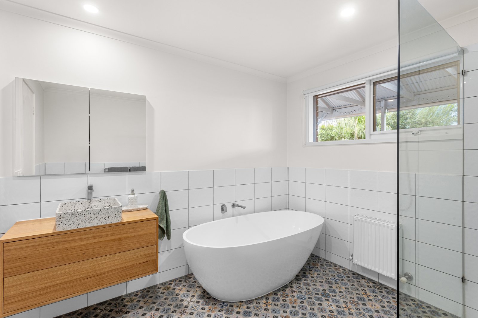Meanwhile, the lower-level living area features a wood fire for winter warmth, opening to a second alfresco zone and an immaculate rear garden with a fire pit, offering room to roam for children and low-maintenance ease for downsizers. Four bedrooms with robes include a main bedroom with a modern en-suite, walk-in robe, and split system. Three additional bedrooms share a stunningly renovated bathroom with a freestanding bath, whilst extras include hydronic heating, split-system air conditioning, ceiling fans, a stylish laundry, extensive storage, and an external workshop/shed ideal for storing surfboards and paddleboards.
