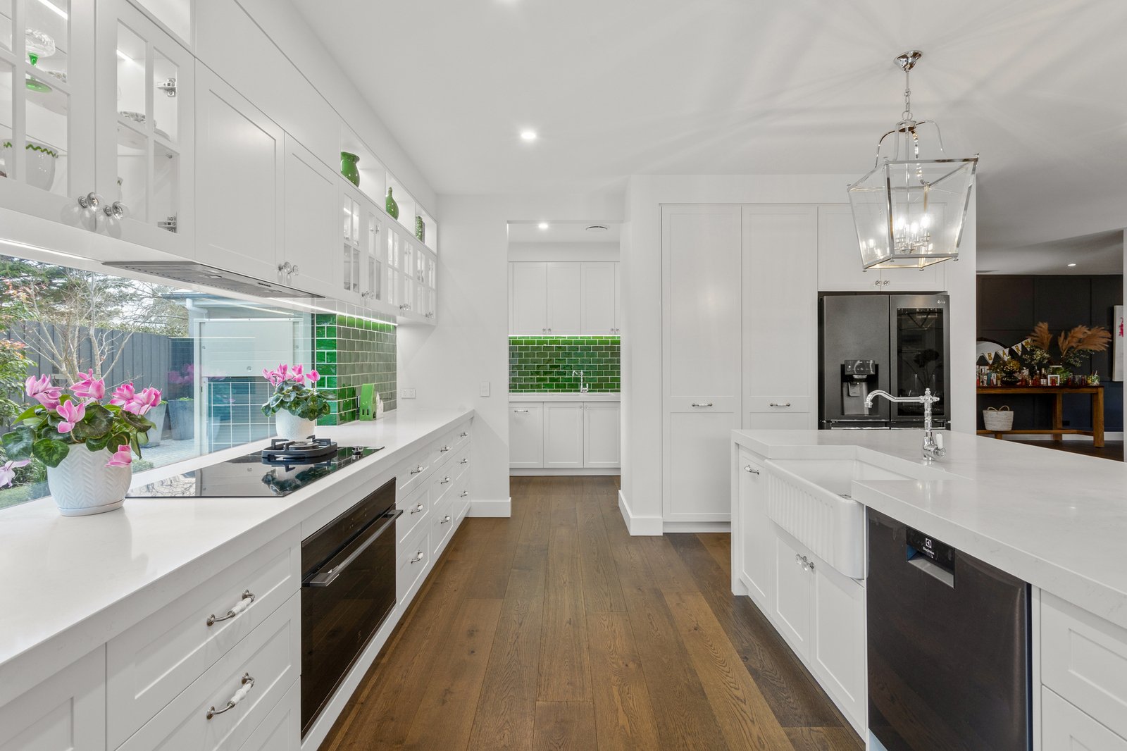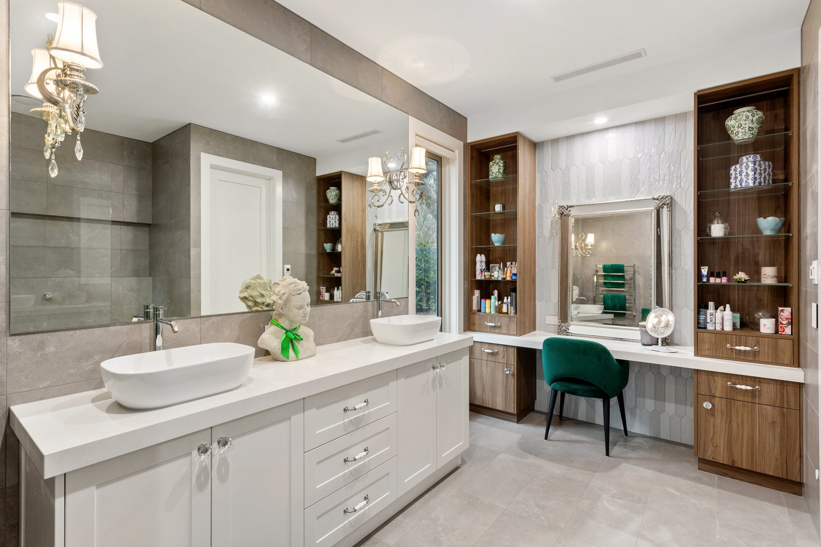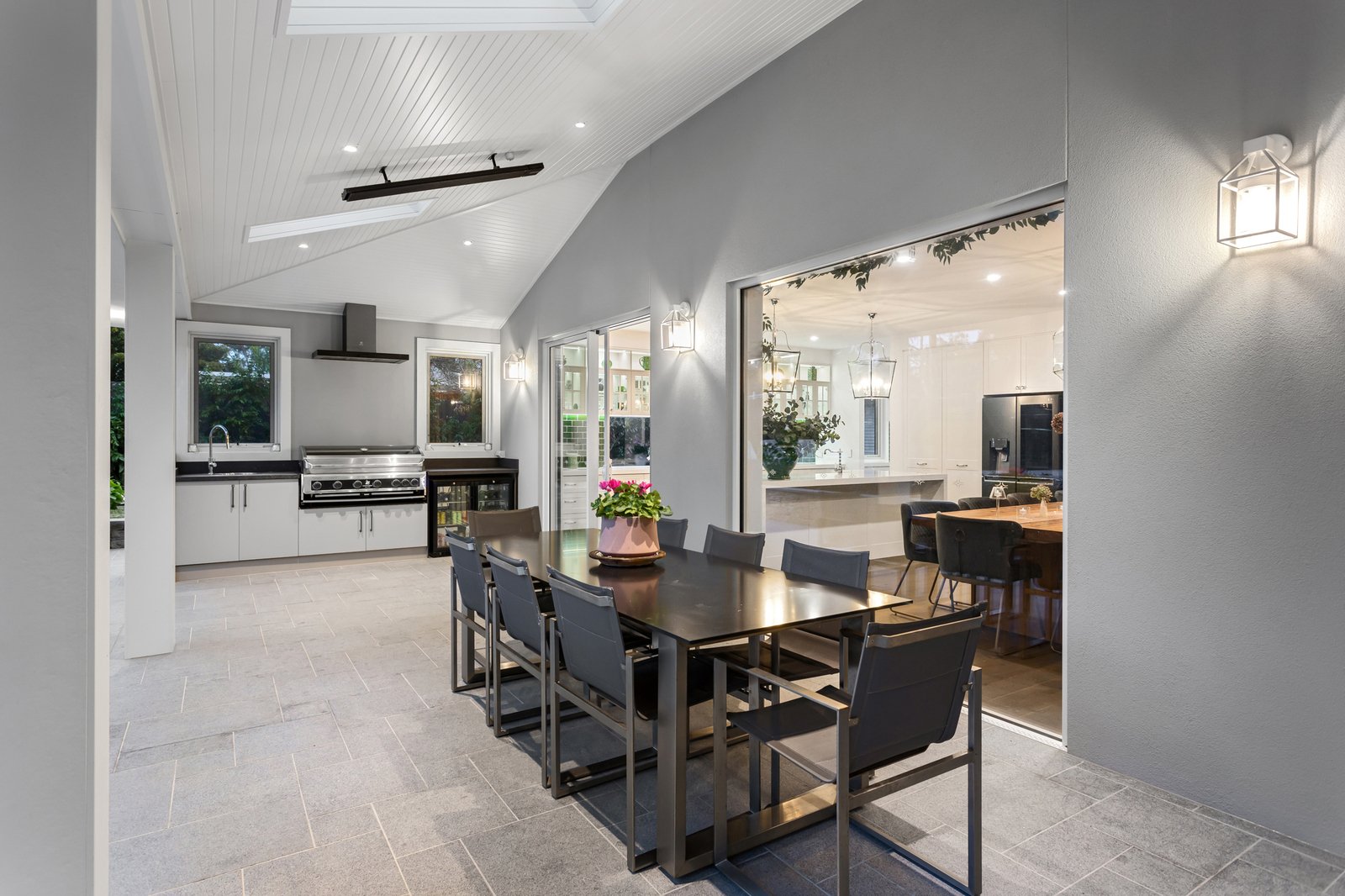 Stone surfaces with a waterfall-edge island complement premium Electrolux appliances in the custom Vogue-style kitchen and storage-rich butler’s pantry, appointed with three ovens, two dishwashers, a warming drawer, and an induction cooktop with a dedicated wok burner. A window splashback sits between bold green gloss tiles, drawing in leafy garden views and adding colour and contrast to a space consciously designed to inspire culinary creativity. Light moves through the living and dining domain via picture windows, amplified by a theatrical backdrop of navy panelling, a 1.5-metre Escea gas fireplace, and a 300-bottle wine cellar.