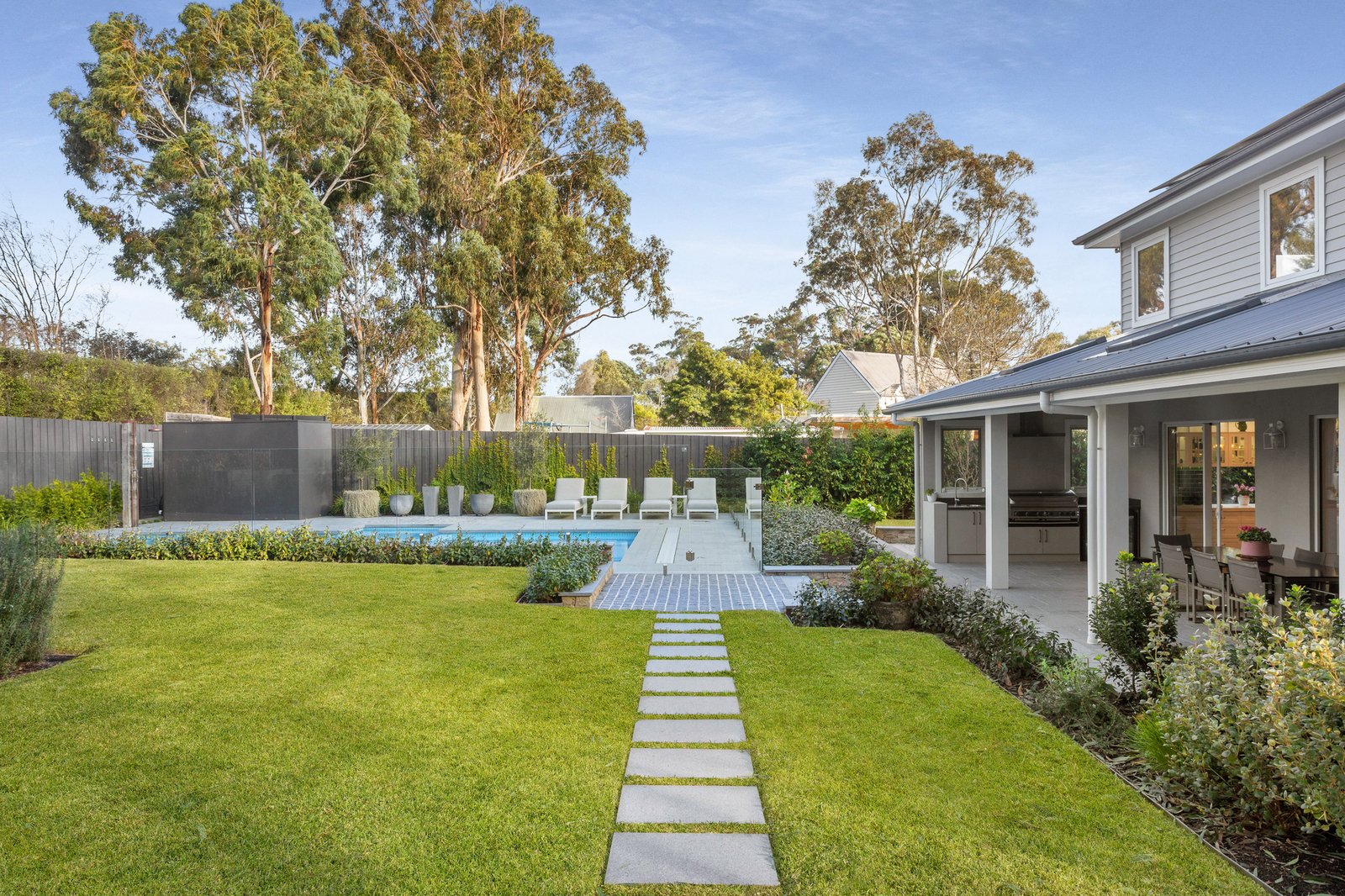 A duo of glass sliders extends to a skylit alfresco, complete with a fully equipped outdoor kitchen and overhead heating for year-round entertaining. Framed by stacked stone borders and lush plantings in the signature style of landscape architect Nadia Gill, the ambience unfolds toward a tiled, self-cleaning pool and spa, which forms the centrepiece of the resort-style grounds, often graced with koalas and birdlife. Set across 1,150 sqm (approx), the gardens feature automatic irrigation, modular veggie patches, mature trees, citrus plants, and an outdoor shower.