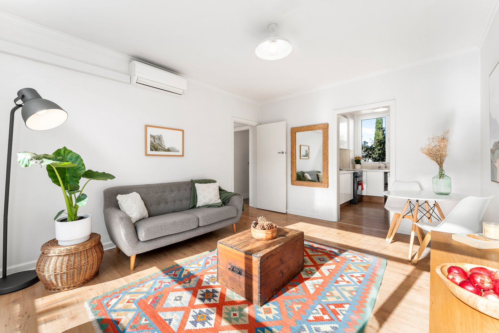 Both bedrooms are well-proportioned, with the second easily accommodating a queen bed, and further enhanced with custom floor-to-ceiling Tasmanian Oak shelving. Ample built-in storage throughout the apartment adds further functionality, whilst industrial light fixtures complement the building’s mid-century architecture. A well-maintained bathroom services the home, complete with laundry facilities, while newly installed double-glazed windows in each south-facing room further enhance the apartment’s warmth and sonic privacy. With secure remote-controlled undercover parking, intercom entry, panel and split-system heating/cooling, every box is ticked for a convenient lifestyle.