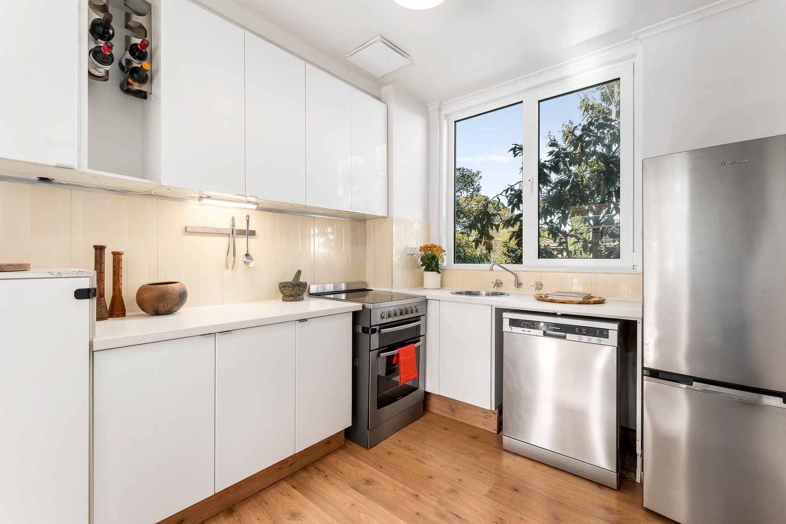 A private entrance and additional front balcony enhance the sense of seclusion, whilst the solid double-brick construction ensures peaceful living and year-round comfort. Step inside to discover a thoughtfully updated interior and an abundance of natural light supplied by floor-to-ceiling north-facing windows. The generous living and dining zone flows to a sun-drenched balcony, whilst a separate, well-appointed kitchen features an electric cooktop/oven, dishwasher, and plenty of storage.