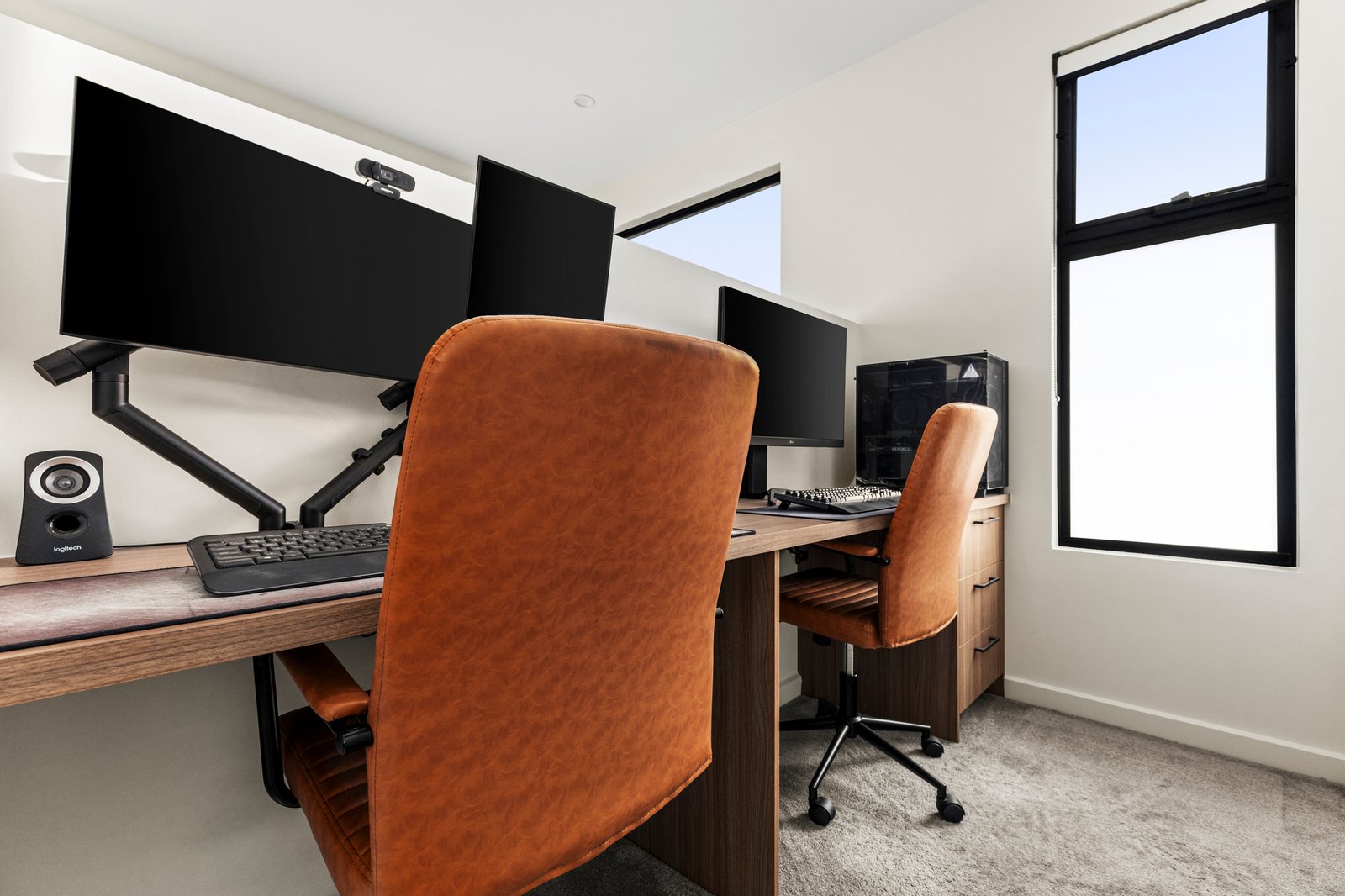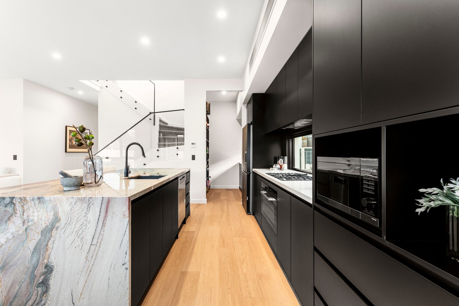 Starring a bold black 2-Pac kitchen with elite Miele appliances, a filtered touch-sensor mixer-tap and an eye-catching dining-bench wrapped in impeccably book-matched Amethyst Wave Quartzite, the home’s innovative architectural specification includes glamorous fully-tiled bathrooms including a dual-vanity ensuite with freestanding bath. Curated with premium stone benchtops, warm European Oak floors and plush carpets, the home provides a uniquely luxurious backdrop to family living with opulent roof-hung sheers backed by automated blinds, custom cabinetry including a luxe master dressing-room, and a warming gas-fireplace as a centre-piece to family living.