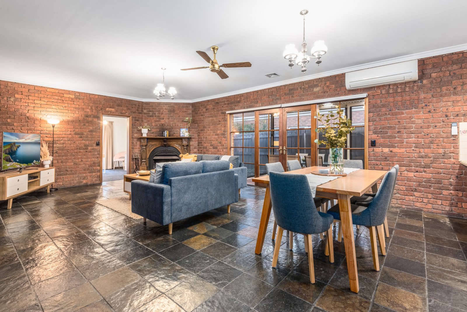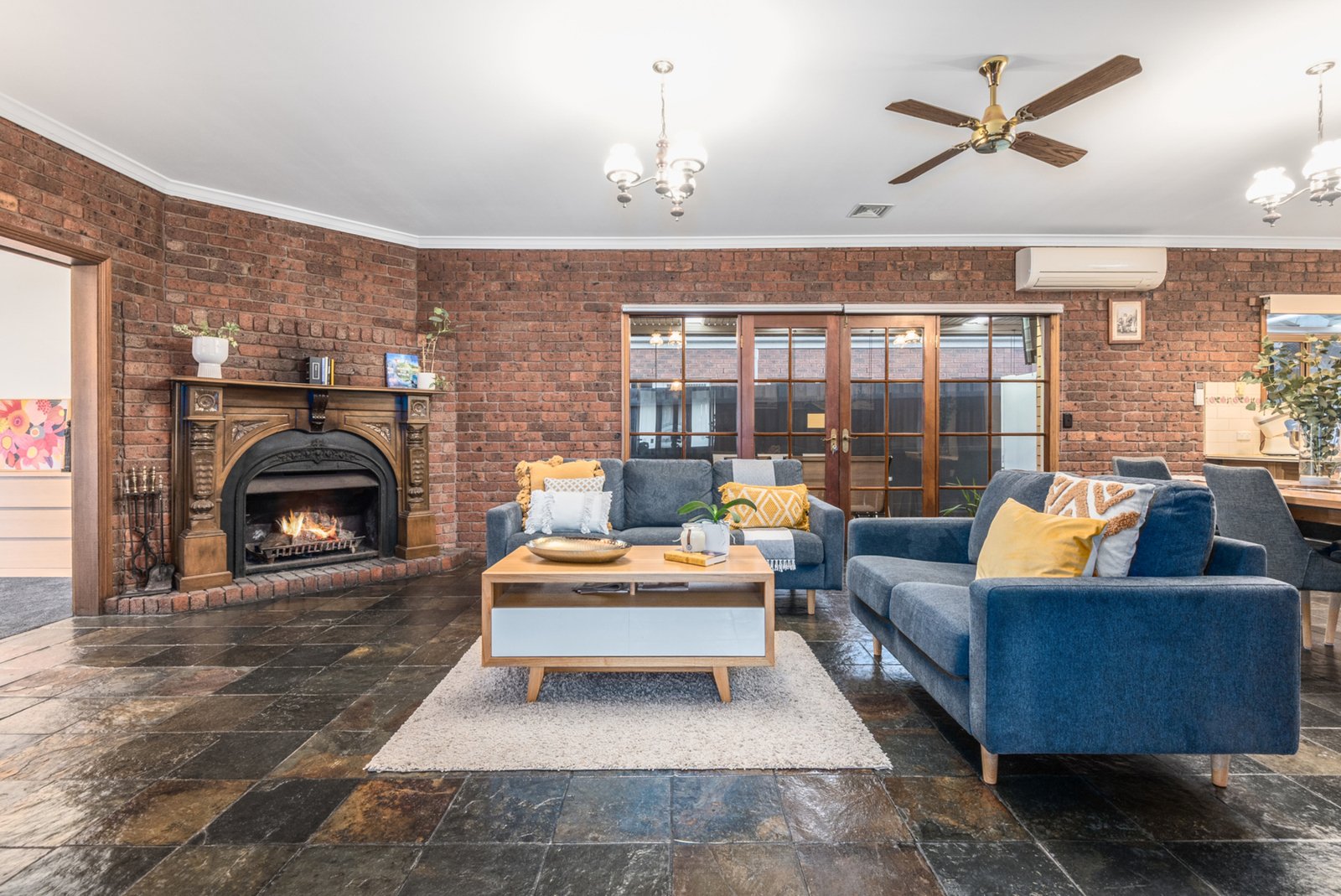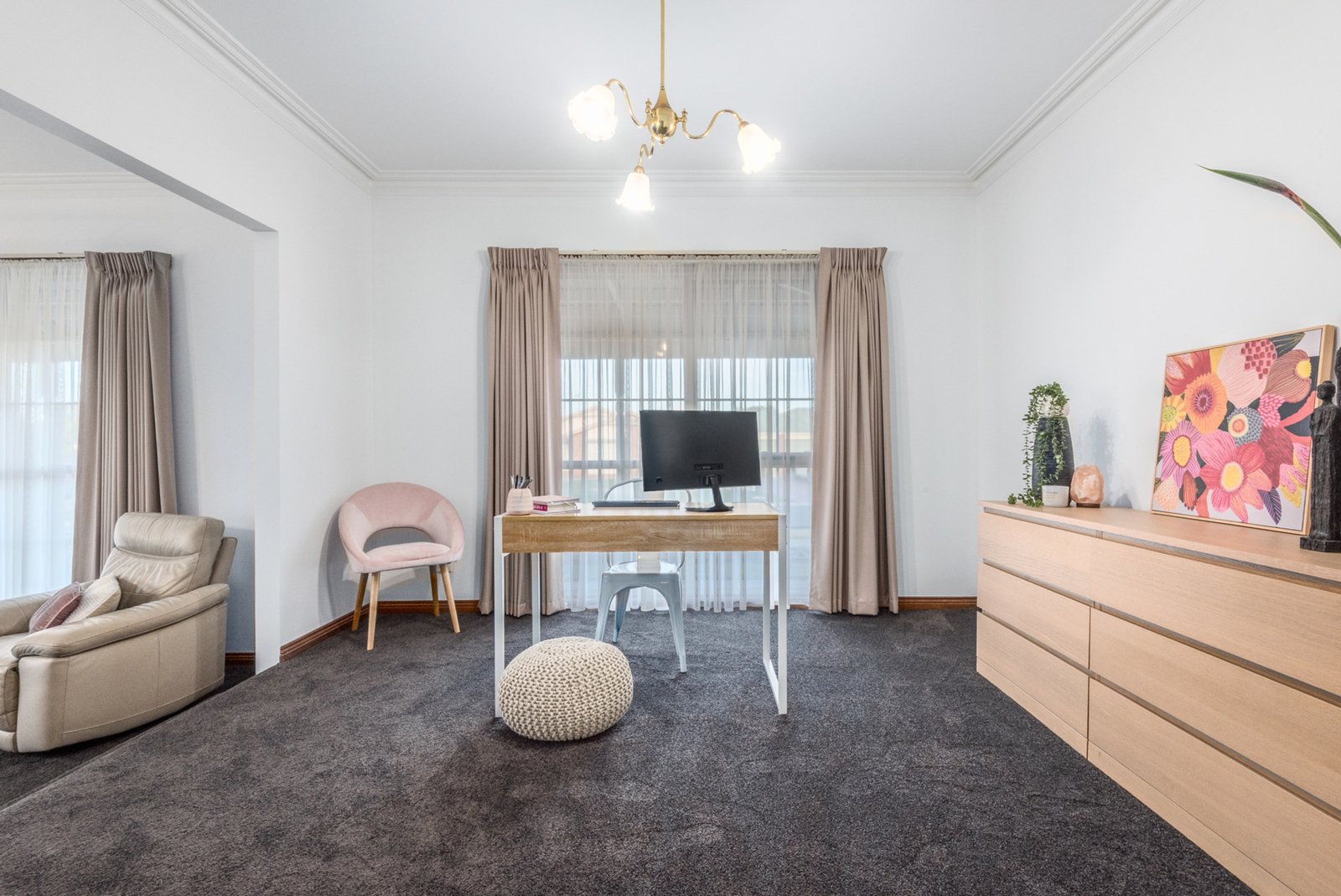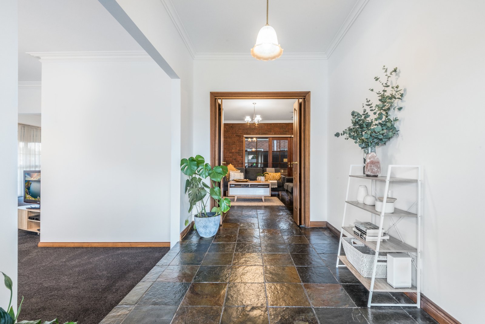 Neatly presented gardens and a traditional façade hold a timeless appeal. From the wide entry hall, a sunken formal lounge features north facing bay windows, offering a light-filled area to retreat or entertain. An adjoining room provides a versatile space, perfect for a home office or formal dining.