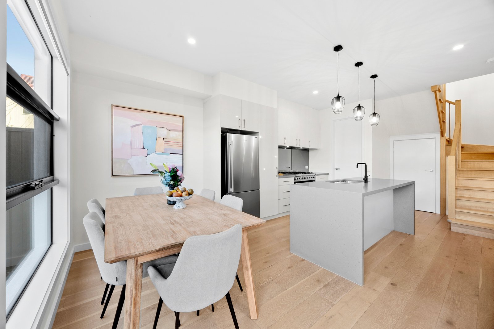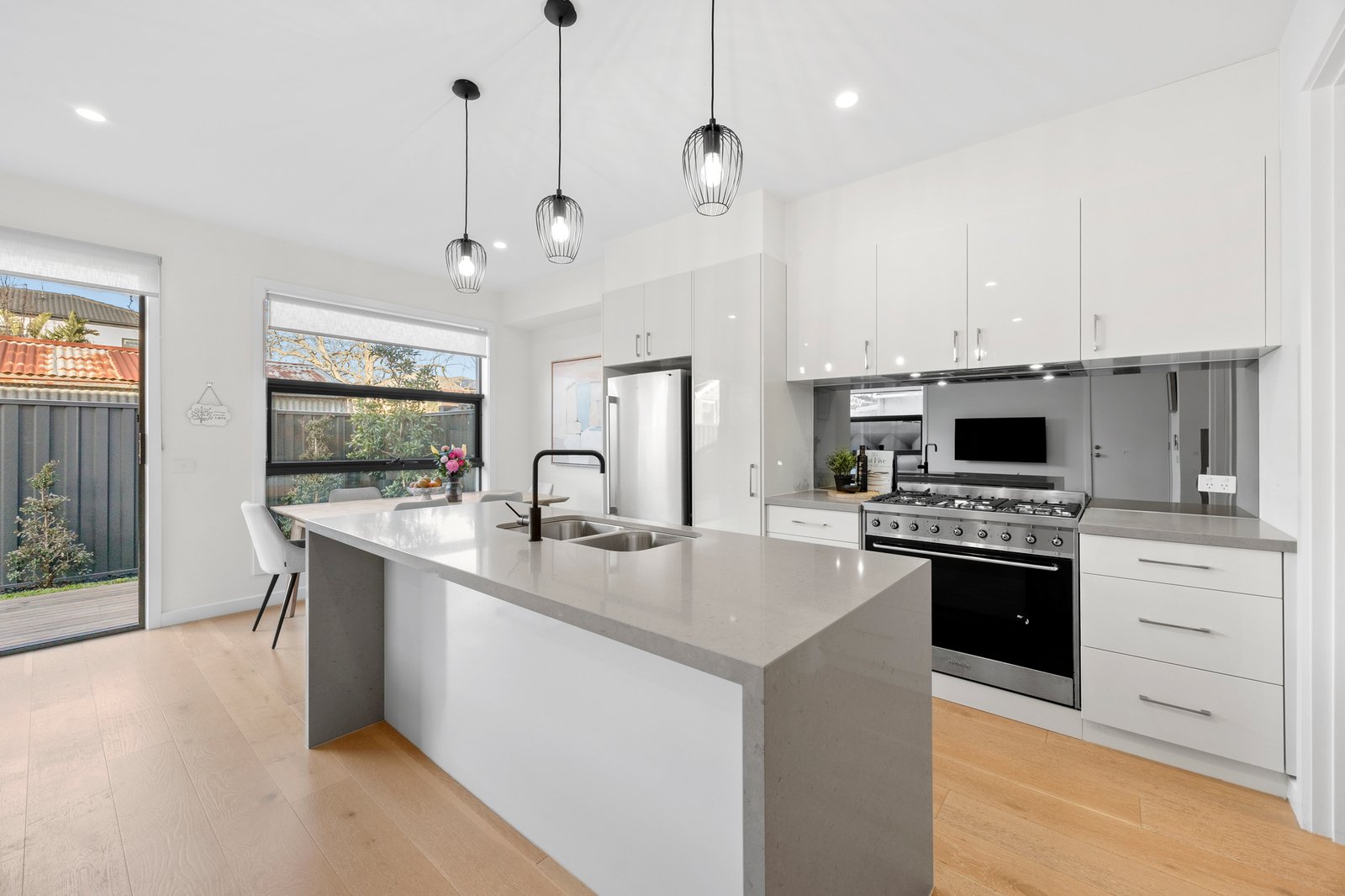 At the rear, the home opens to a bright and airy living and dining domain, where glass sliders connect seamlessly to the garden and draw in natural light. The kitchen is both functional and refined, appointed with stone benchtops, a full suite of Smeg appliances - including a 900mm freestanding cooker, dishwasher and rangehood - ample storage, and a casual breakfast bar ideal for everyday dining.