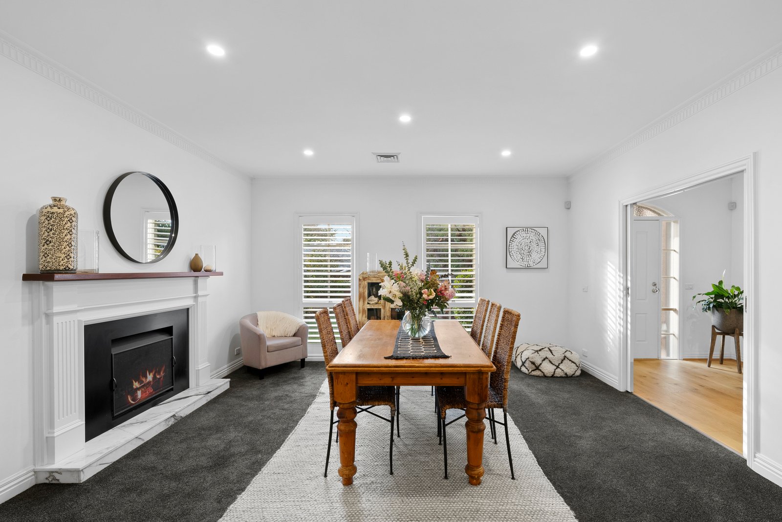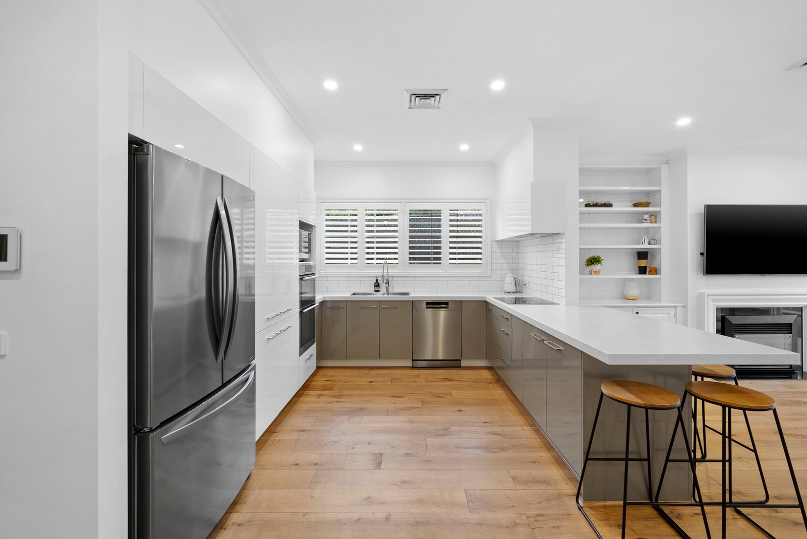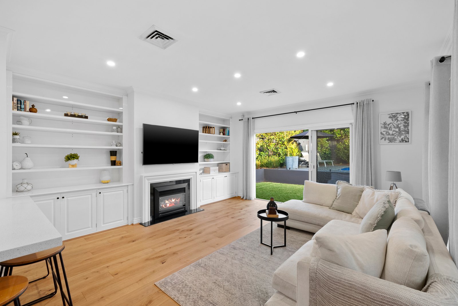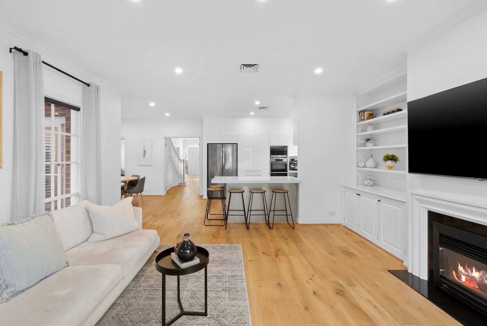 Centrally positioned, a beautifully appointed kitchen balances sleek modernity with functional excellence. Premium appliances - including an Asko induction cooktop, twin AEG wall ovens, and Bosch dishwasher - unite with stone benchtops and a generous breakfast bar, forming a space that is both elegant and intuitive. This family hub connects effortlessly to the meals area on one side and the living room on the other, where bespoke joinery and a gas fireplace provide a warm, textured backdrop for everyday life.