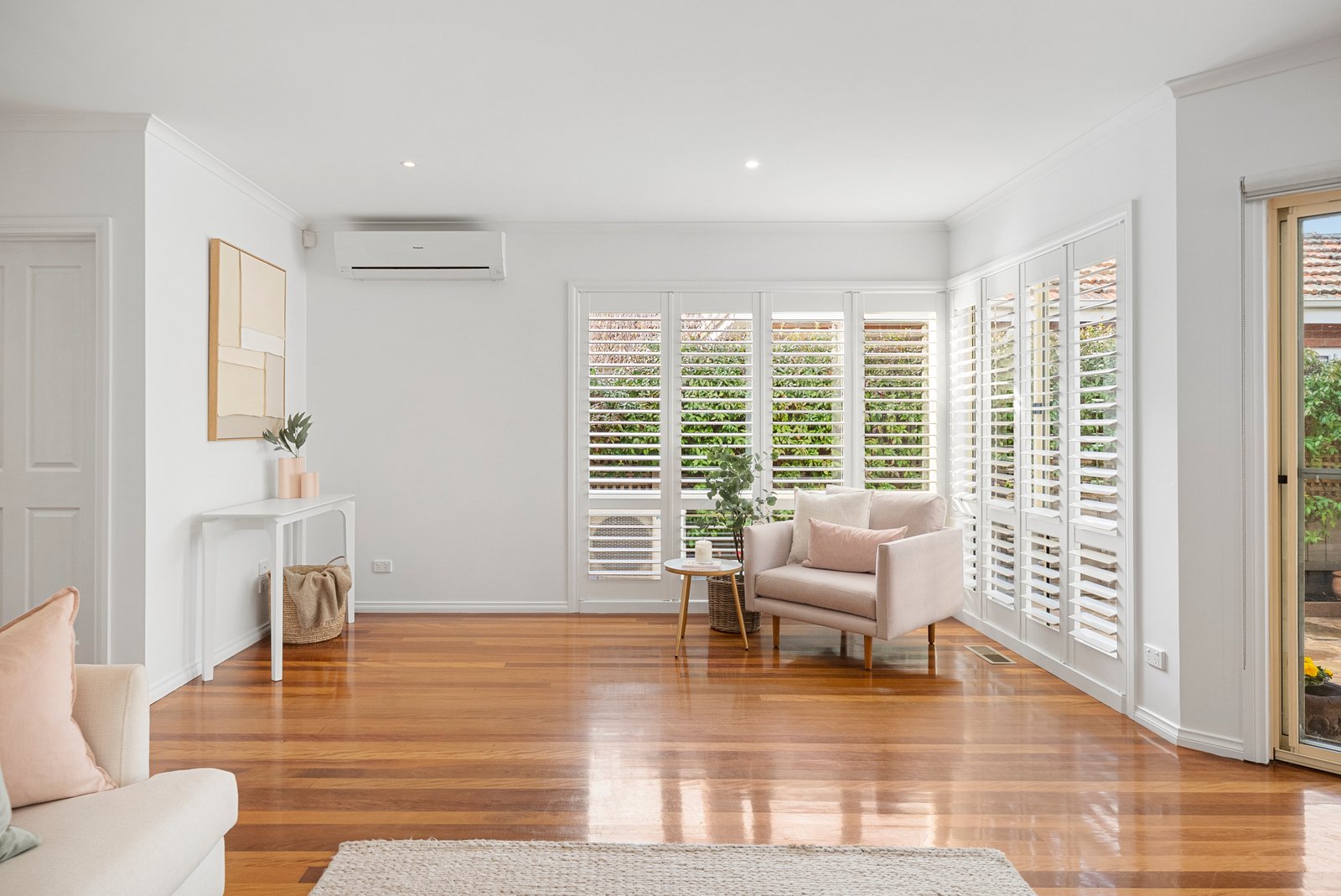 Inside, warm timber floors extend through sun-drenched, spacious rooms, each gently layered with plantation shutters that filter natural...
