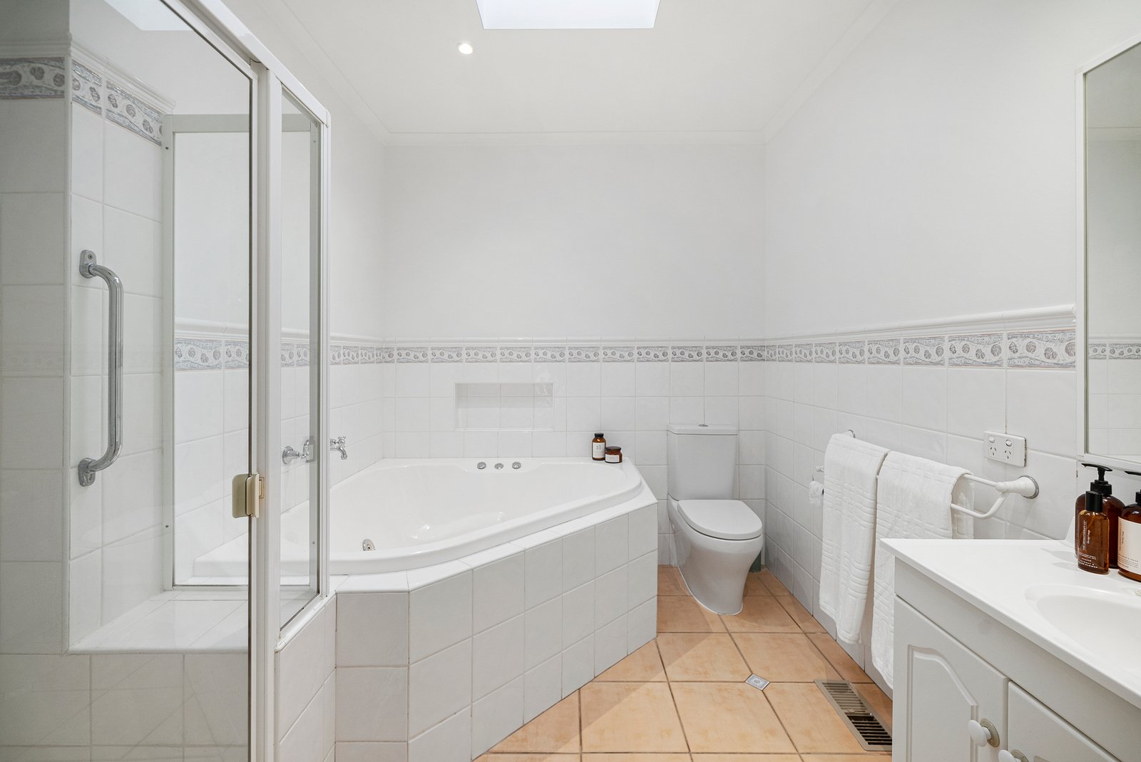 Privately positioned, the master suite is a generous retreat enjoying extensive built-in wardrobes, lush front garden outlooks, and a sky lit ensuite featuring a corner spa bath for indulgent relaxation. The second bedroom is well-appointed and serviced by a bright, skylit bathroom nearby.