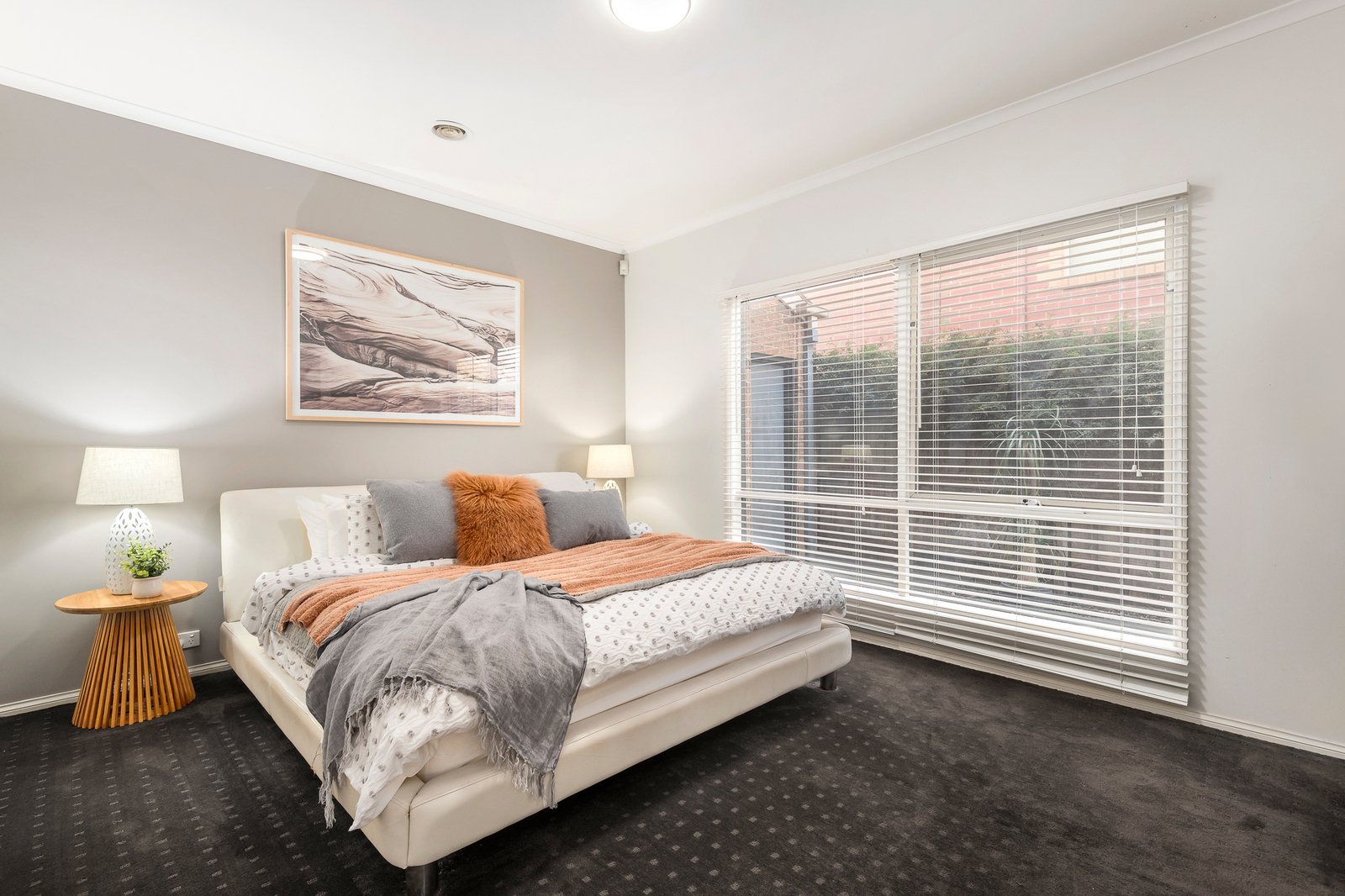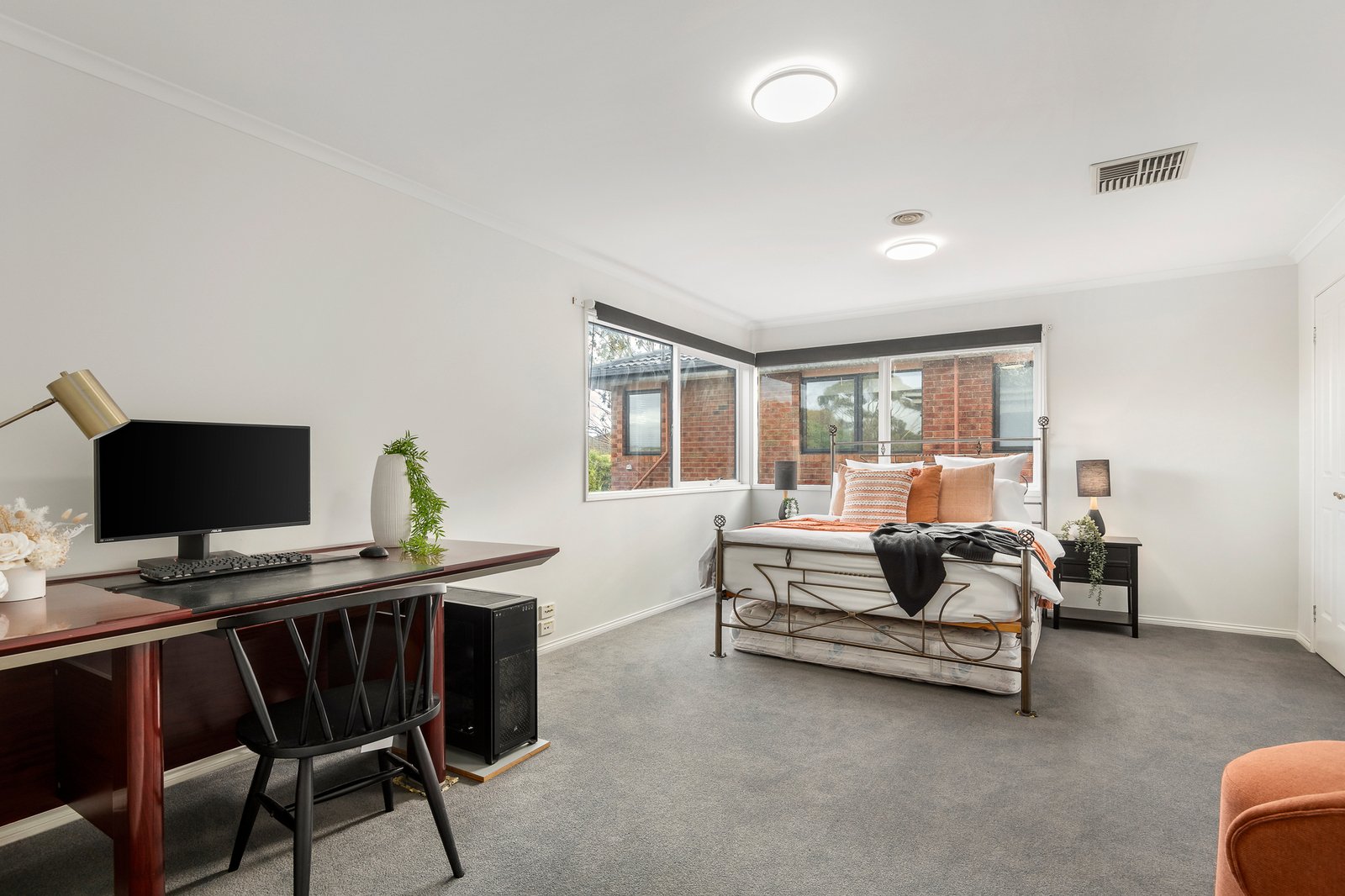 Downstairs features the main or guest bedroom with walk-through robe and ensuite, an oversized living room, a flexible study/playroom, and an entertainer’s kitchen with Caesarstone benches, 900mm stainless steel cooker and breakfast bar. The family/meals area opens to a north-facing alfresco with water feature and lawn – perfect for year-round entertaining.