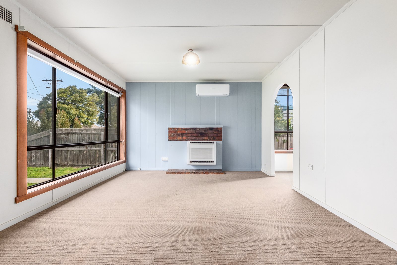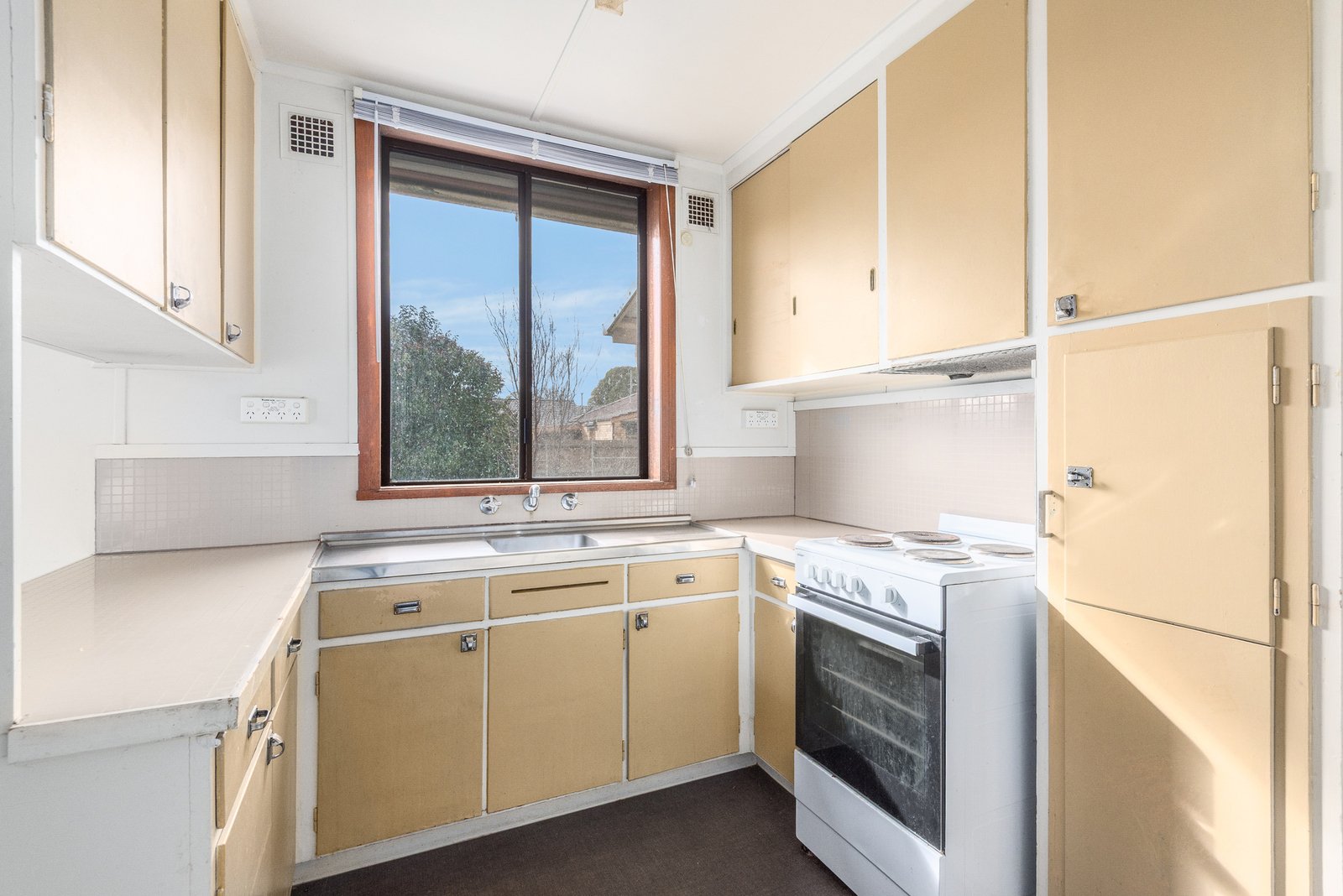The home is set in a peaceful tree-lined street. Inside, the living area features an original brick mantel, gas heating plus split system heating and cooling for modern comfort. The adjoining dining area flows into the kitchen, which retains original retro cabinetry with a 600mm oven and cooktop, and a view to the backyard. Comprising three bedrooms, all include built-in robes, serviced by a central bathroom and separate wc. A laundry at the rear is positioned for direct external access.