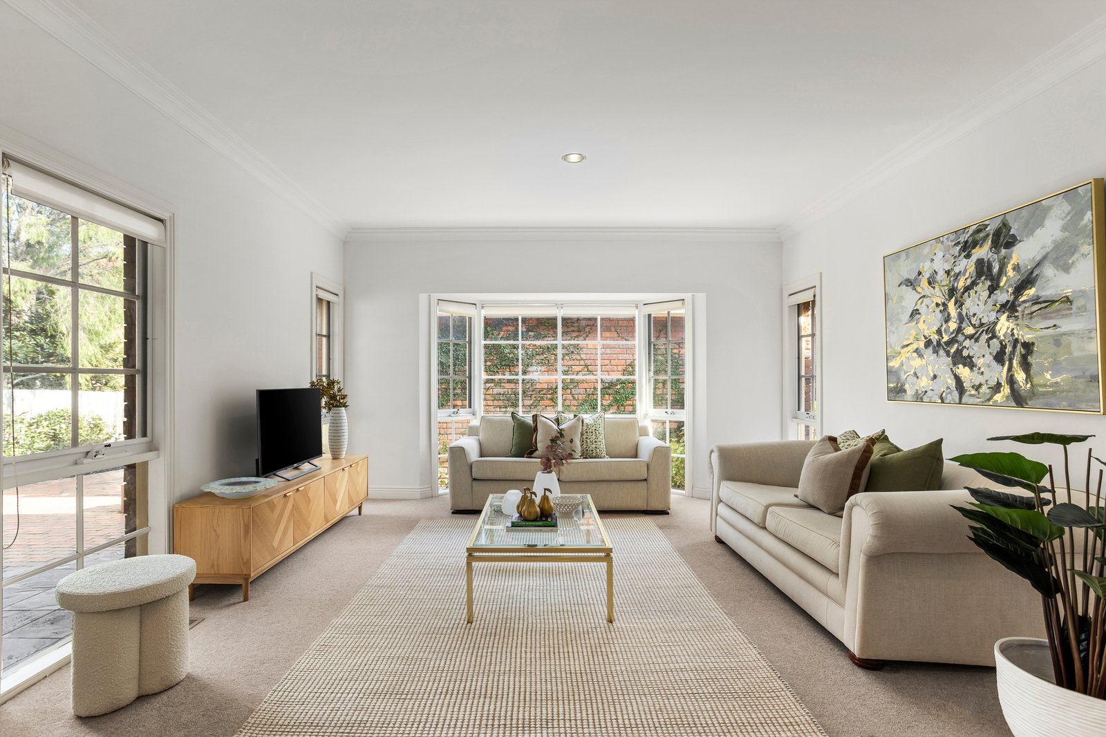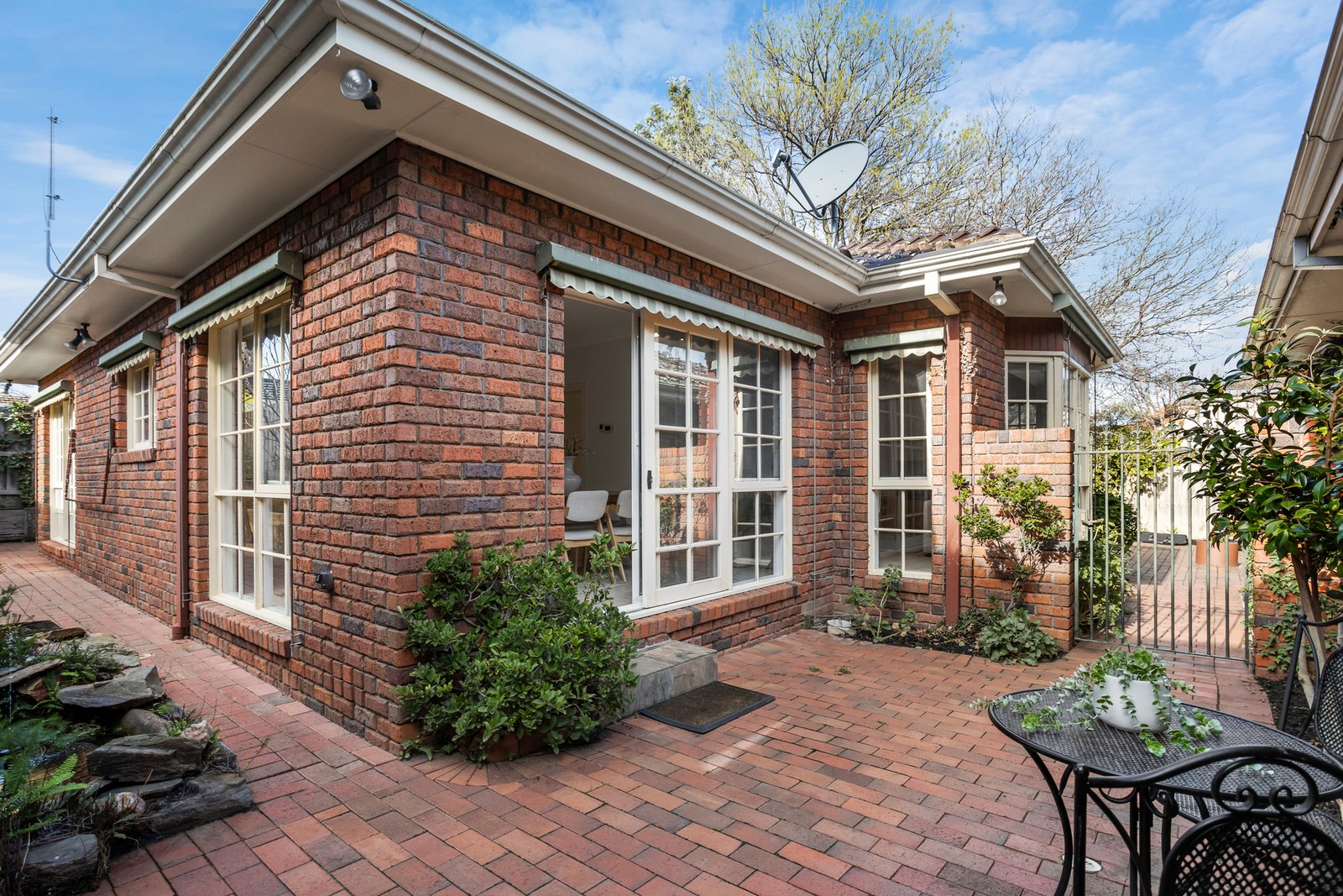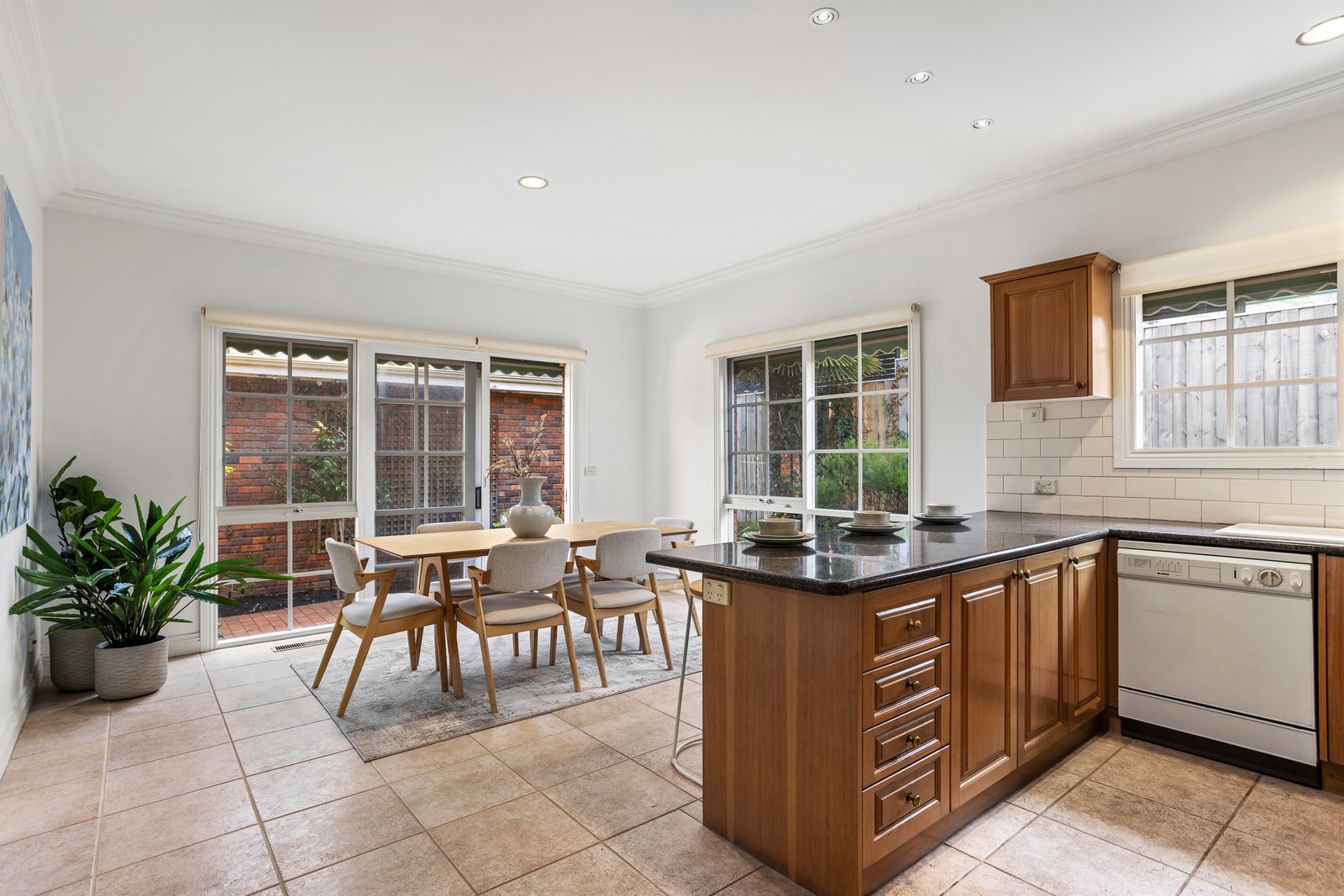 Spacious interiors are matched by the home’s generous outdoor footprint, with a wraparound courtyard offering sunlit serenity for al fresco dining, quiet reflection or entertaining. Inside, natural light streams through a bay window into the living zone, while the bright open-plan kitchen and dining area feature classic timber cabinetry, a breakfast bar and ample bench space. Glass sliders reveal the blissfully private courtyard, bathed in north-west sun and complete with a tranquil pond.