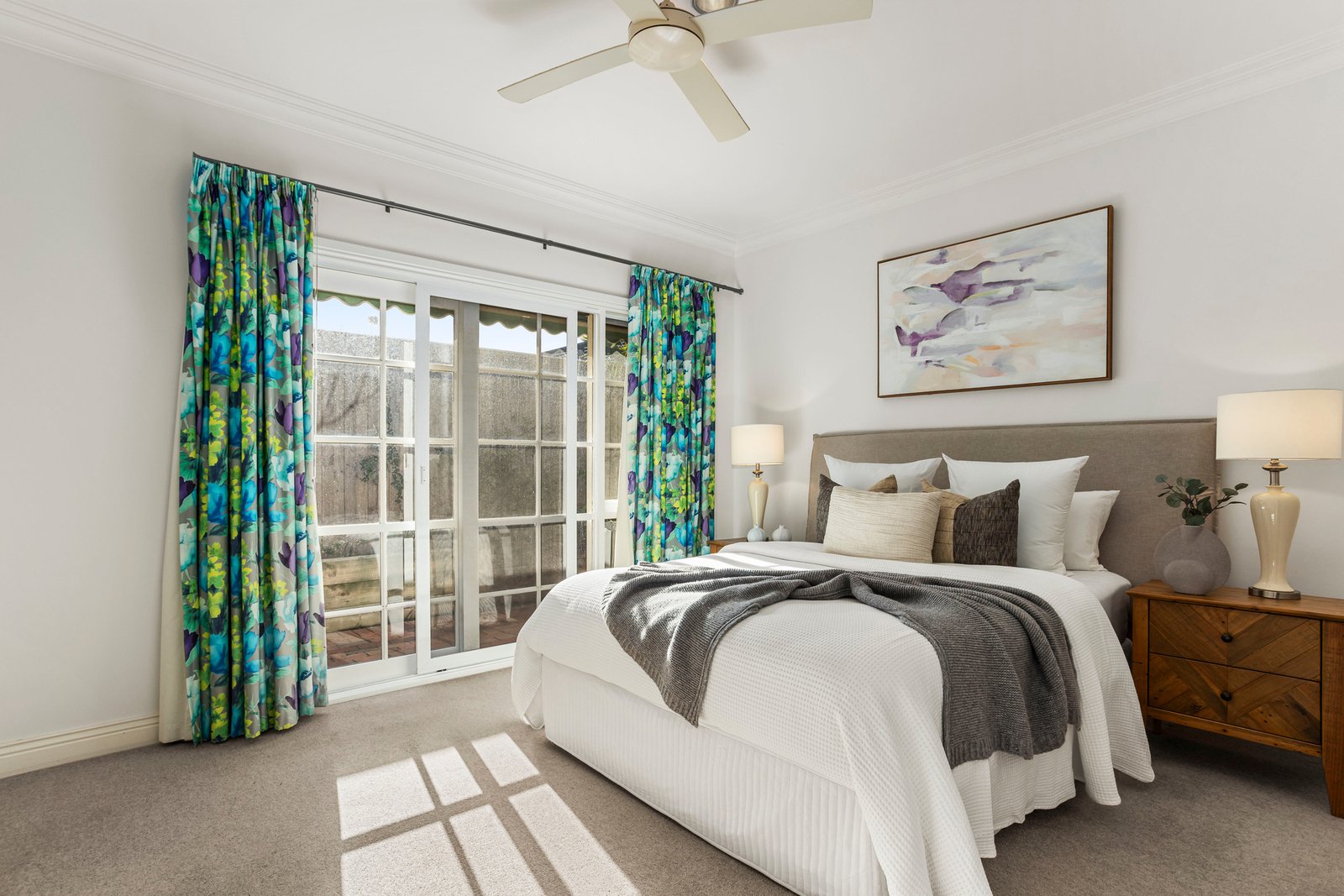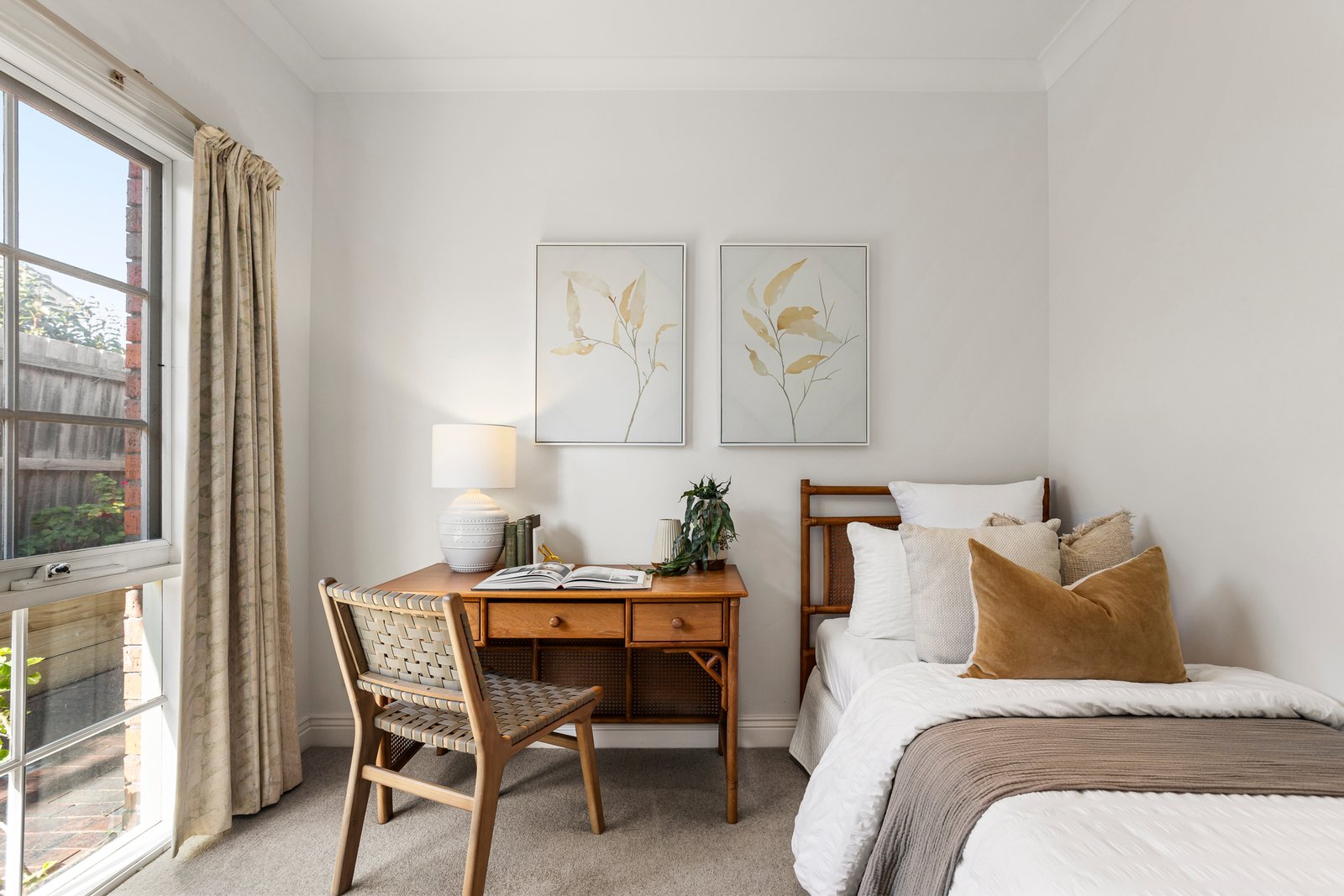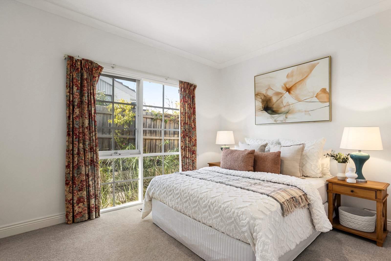Spacious interiors are matched by the home’s generous outdoor footprint, with a wraparound courtyard offering sunlit serenity for al fresco dining, quiet reflection or entertaining. Inside, natural light streams through a bay window into the living zone, while the bright open-plan kitchen and dining area feature classic timber cabinetry, a breakfast bar and ample bench space. Glass sliders reveal the blissfully private courtyard, bathed in north-west sun and complete with a tranquil pond.