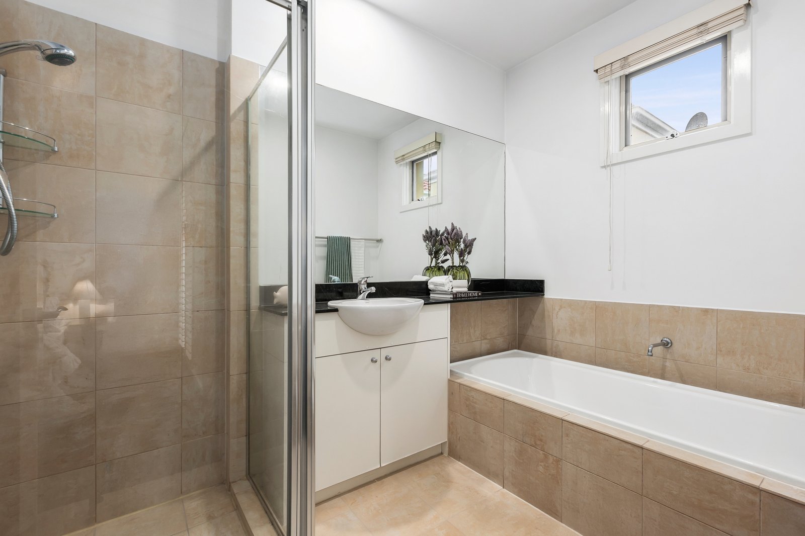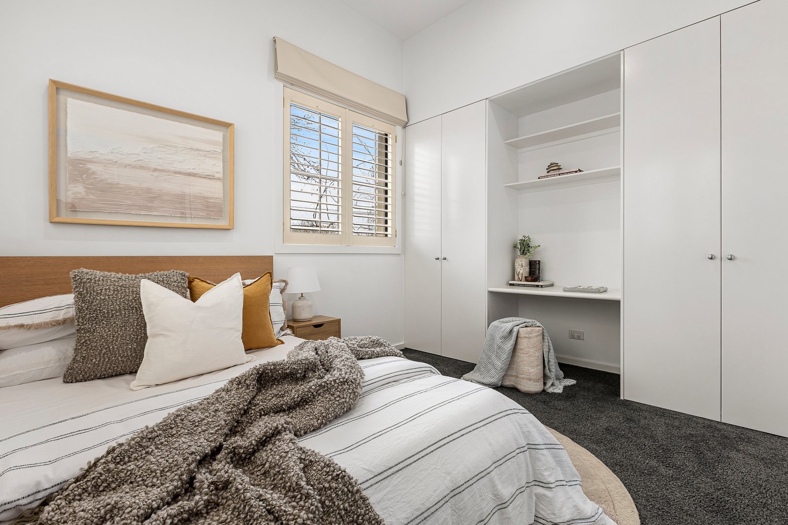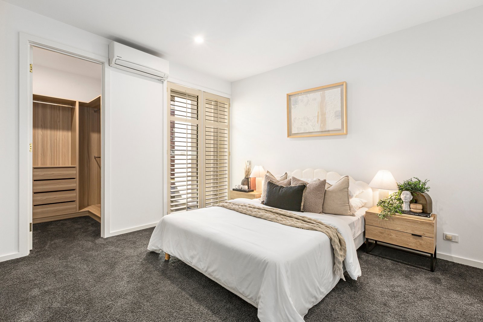 Indulge in the soft, plush carpeting underfoot as you head upstairs to relax and rejuvenate, and enjoy comfort all year round with heating and cooling split systems in each room. The master bedroom delivers your perfect sanctuary with a walk-in robe and marble ensuite with bathtub, while two additional bedrooms boasting built-in robes (one with desk, one with terrace access) share a family bathroom finished in marble.
