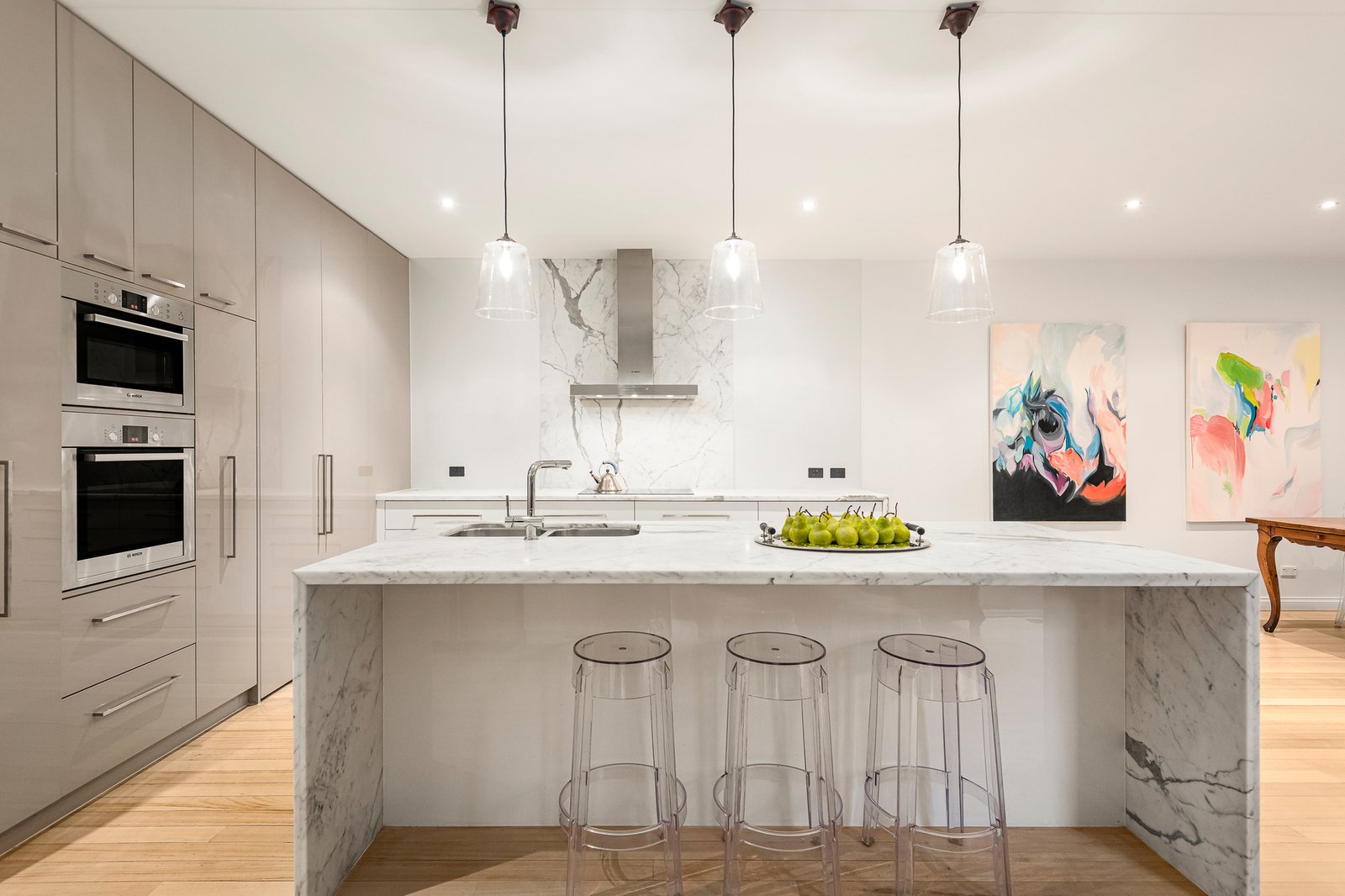 The Carrara marble kitchen is a true focal point, generous in scale and rich in quality. Featuring a waterfall island beneath pendant lighting, it boasts a suite of Bosch appliances (induction cooktop, pyrolytic and convection ovens, integrated dishwasher), marble splashbacks, custom pull-out storage and a walk-in pantry, balancing beauty and practicality with designer finesse.