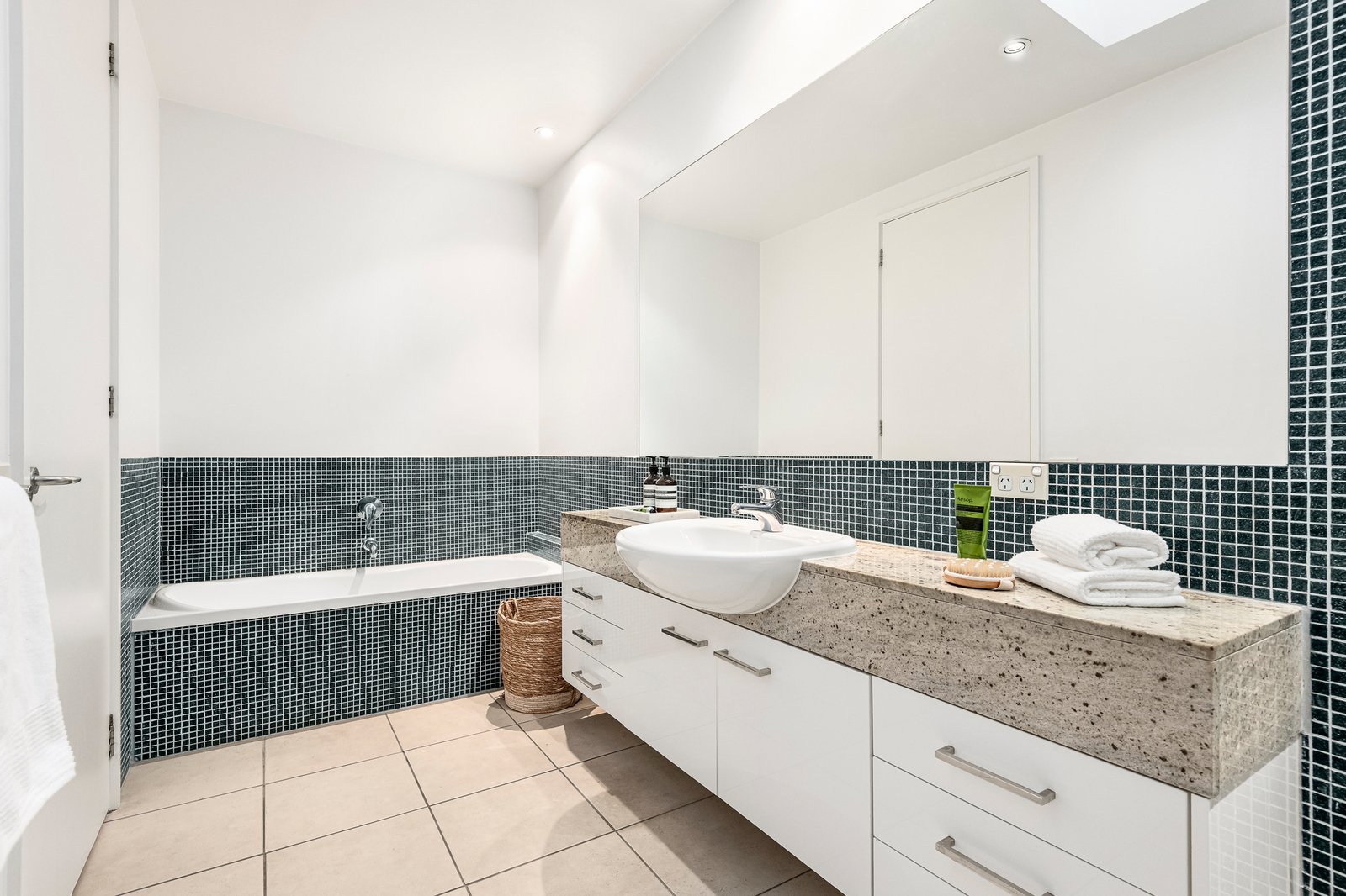 Upstairs, the main suite is a sumptuous sanctuary with its own private treetop terrace, walk-in robe, built-in cabinetry and a mosaic-tiled, granite-finished ensuite. A light-filled retreat/study zone connects two further bedrooms, each with robes and terrace access, served by a skylit family bathroom with a deep soaking tub.