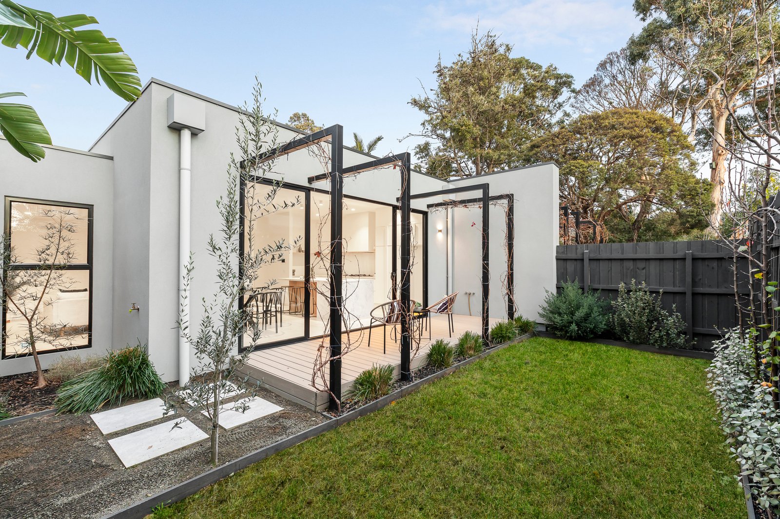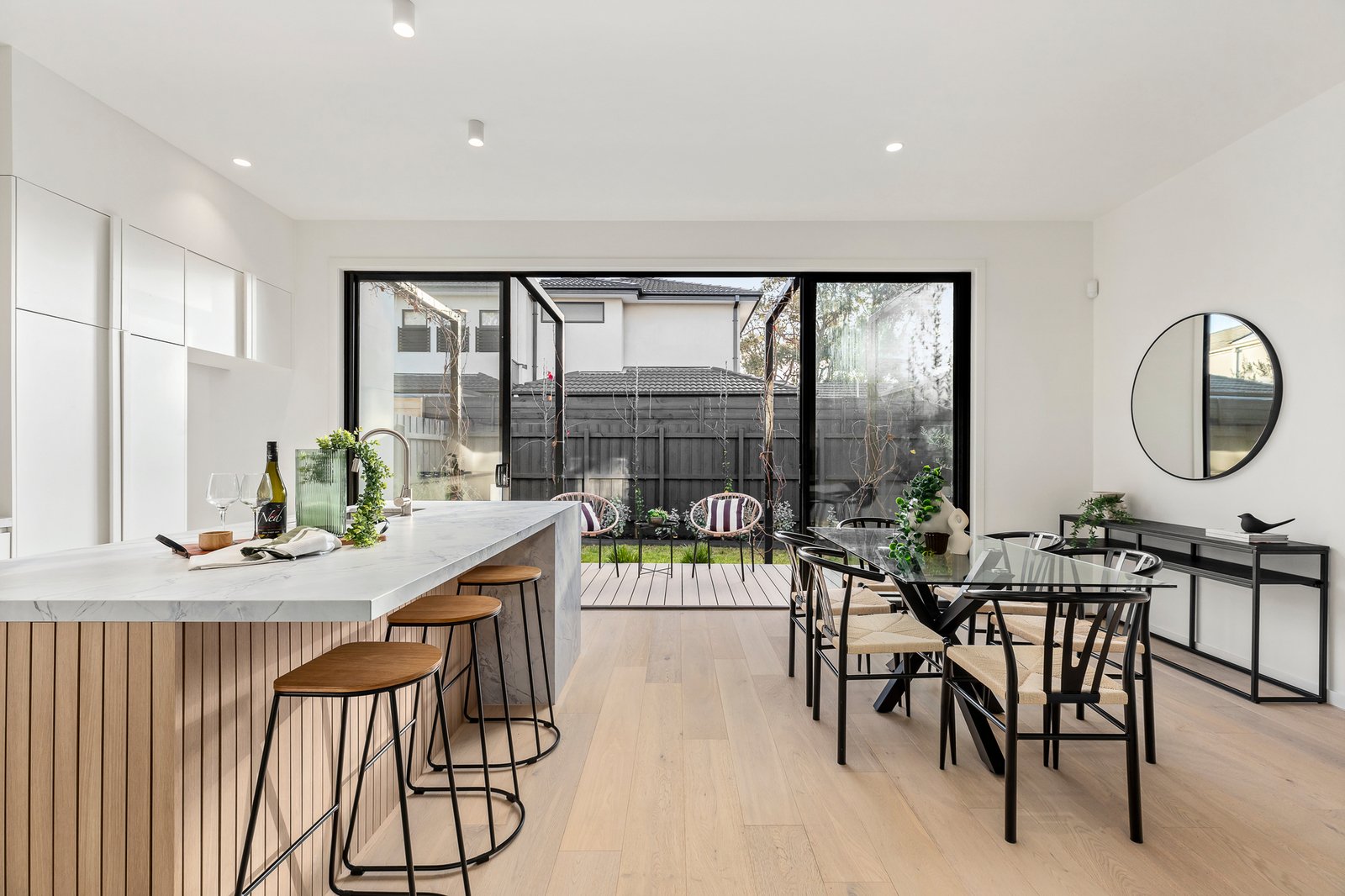 The expansive open-plan living and dining area flows seamlessly into a state-of-the-art kitchen featuring Bosch appliances, stone benchtops, and a grand island bench. Sliding doors lead to a sun-drenched deck and manicured garden, creating a private retreat for entertaining and relaxation.