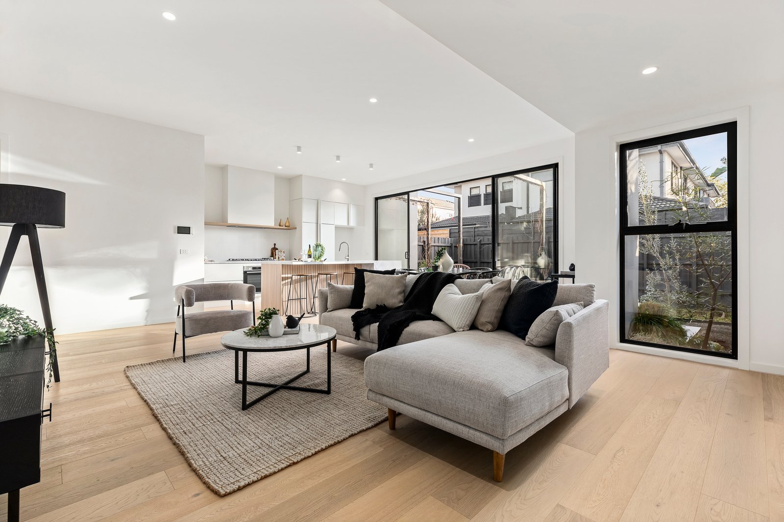 The expansive open-plan living and dining area flows seamlessly into a...