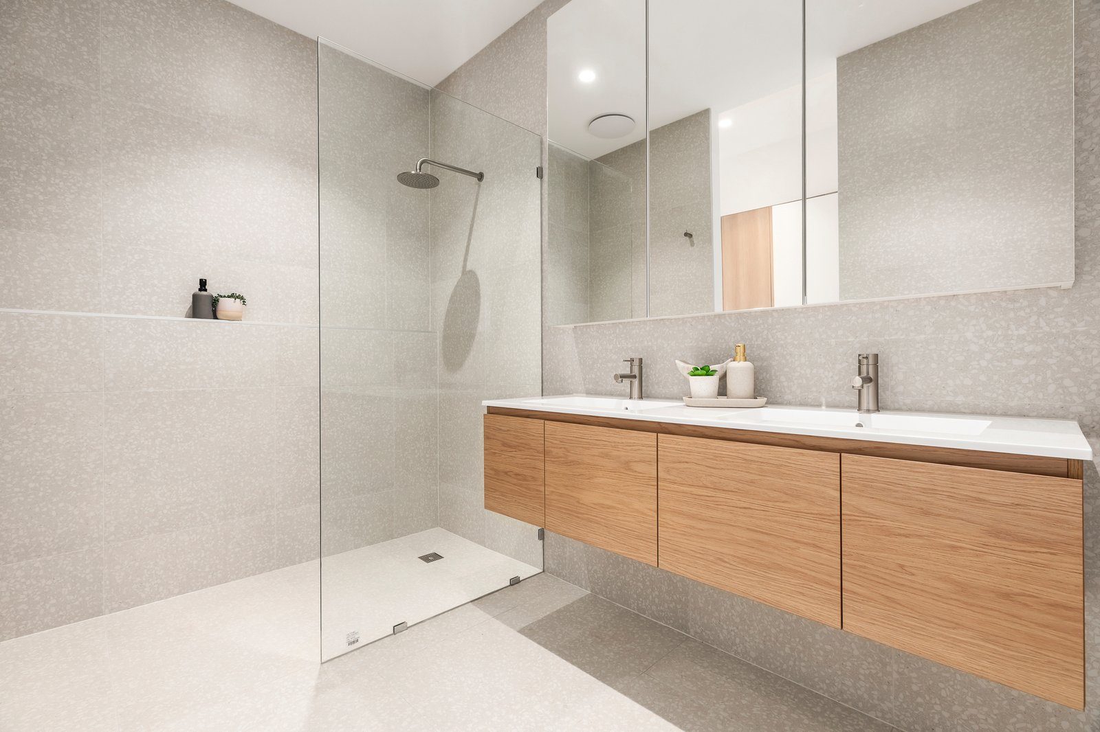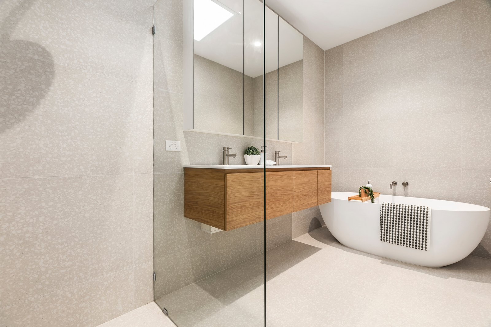 The serene main bedroom boasts garden views, built-in robes, and a luxurious ensuite, while two additional bedrooms share a stylish bathroom with an elliptical bath. A study nook with an Oak desk, skylights, individual climate control in each room, and feature Terrazzo tiles enhance the home's elegance.