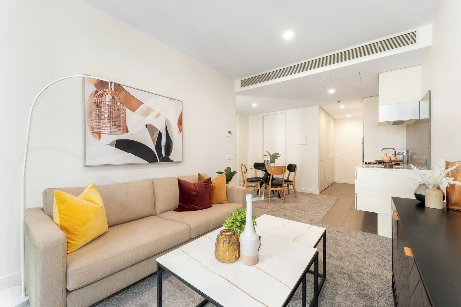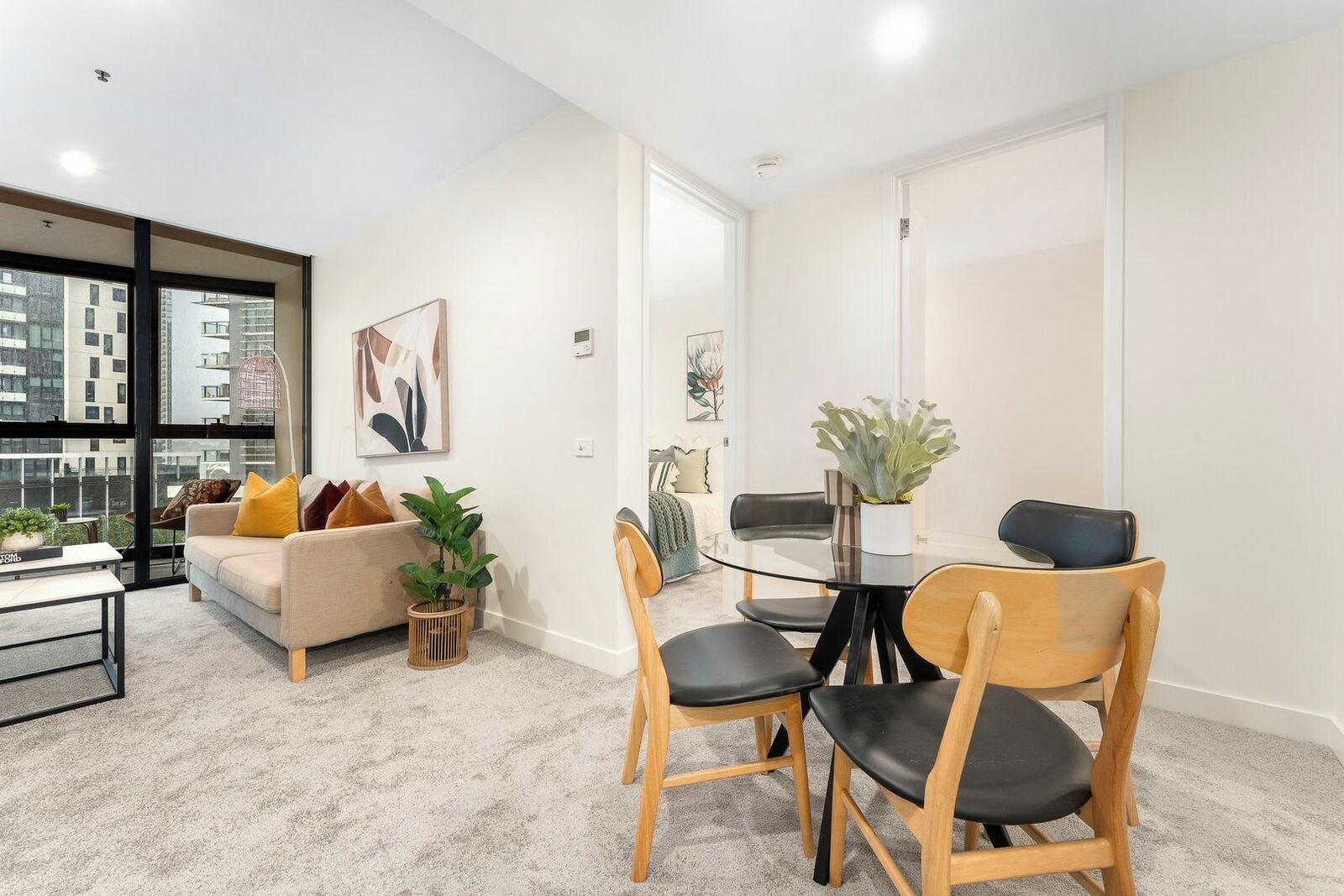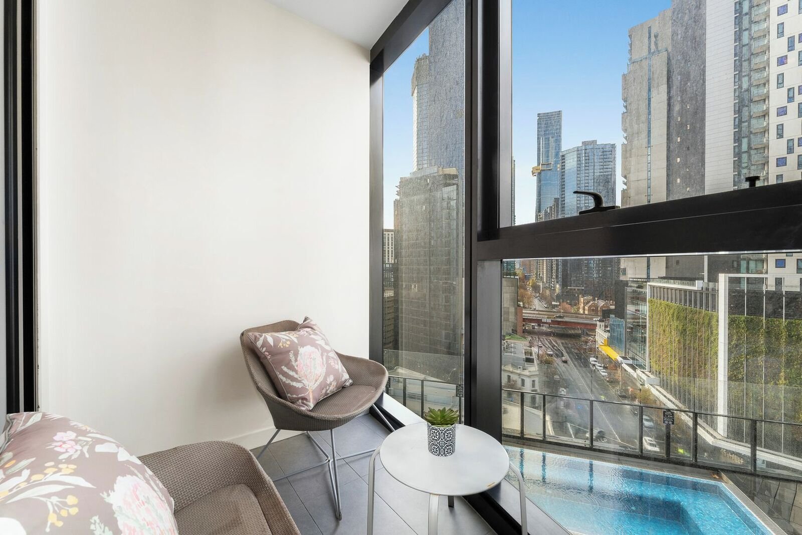 Wake up to breathtaking city views in this elevated two-bedroom apartment, perfectly positioned above vibrant Clarendon Street. Floor-to-ceiling windows flood the spacious living and dining area with natural light, flowing seamlessly to a private balcony ideal for evening drinks.