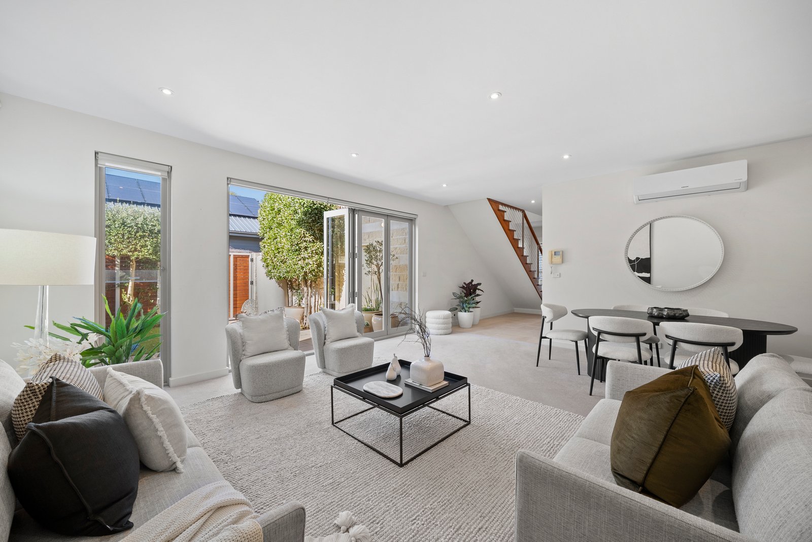 The generous open-plan living and dining domain flows seamlessly through bifold doors to a private northeast-facing courtyard - an effortless extension of the home, perfect for sun-soaked entertaining or relaxation. Here, a paved terrace and lush environs create a sublime outdoor room with just the right balance of space and simplicity.