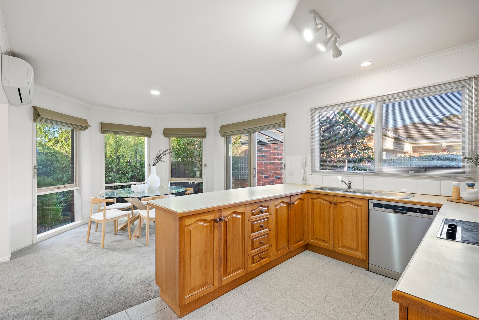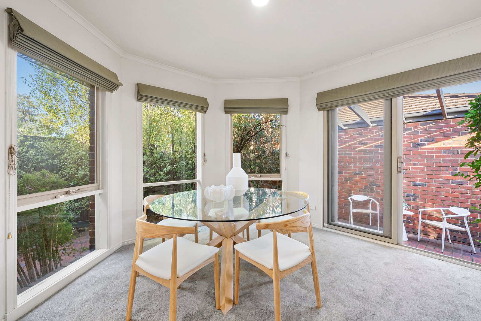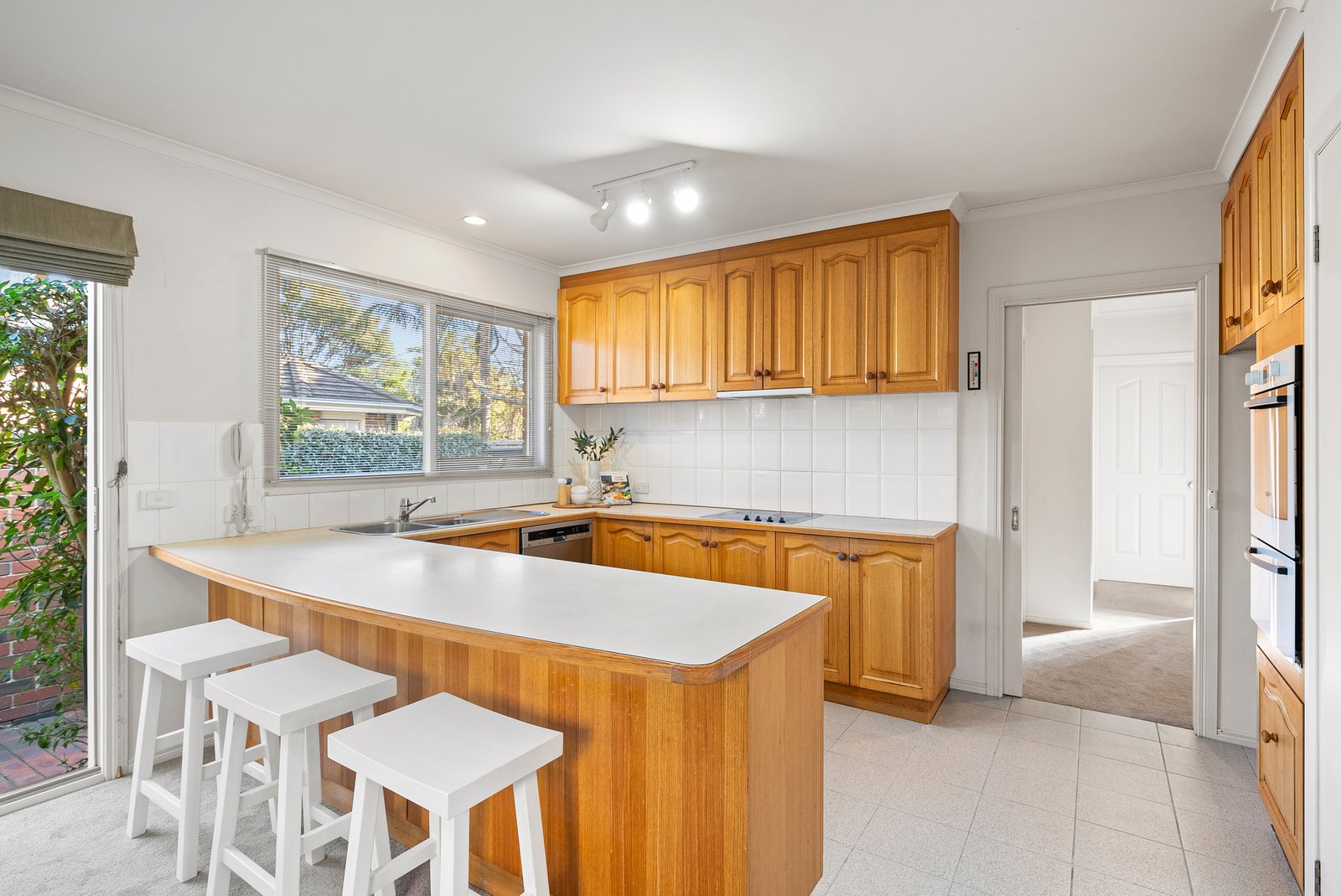 Gentle northern light illuminates the expansive living area that flows seamlessly to the kitchen and dining zone. The dining area, adorned with a bay window, captures leafy vistas, while the kitchen features timber cabinetry, a breakfast bar, and ample storage.