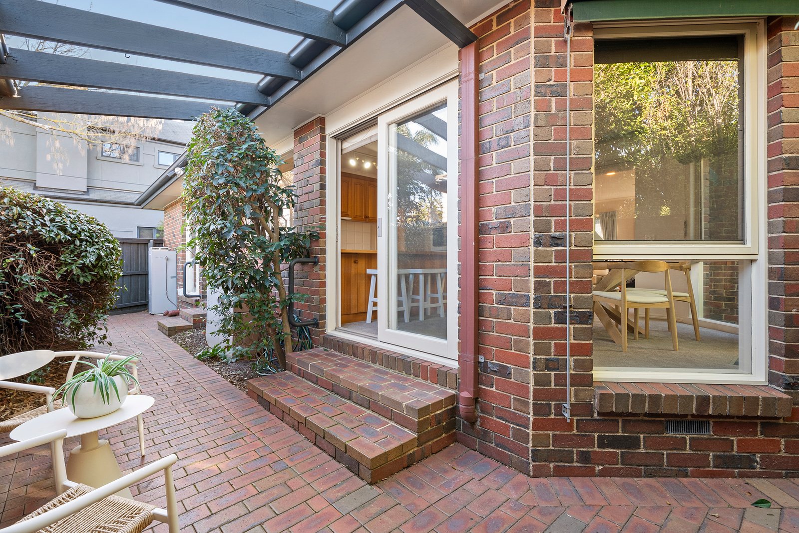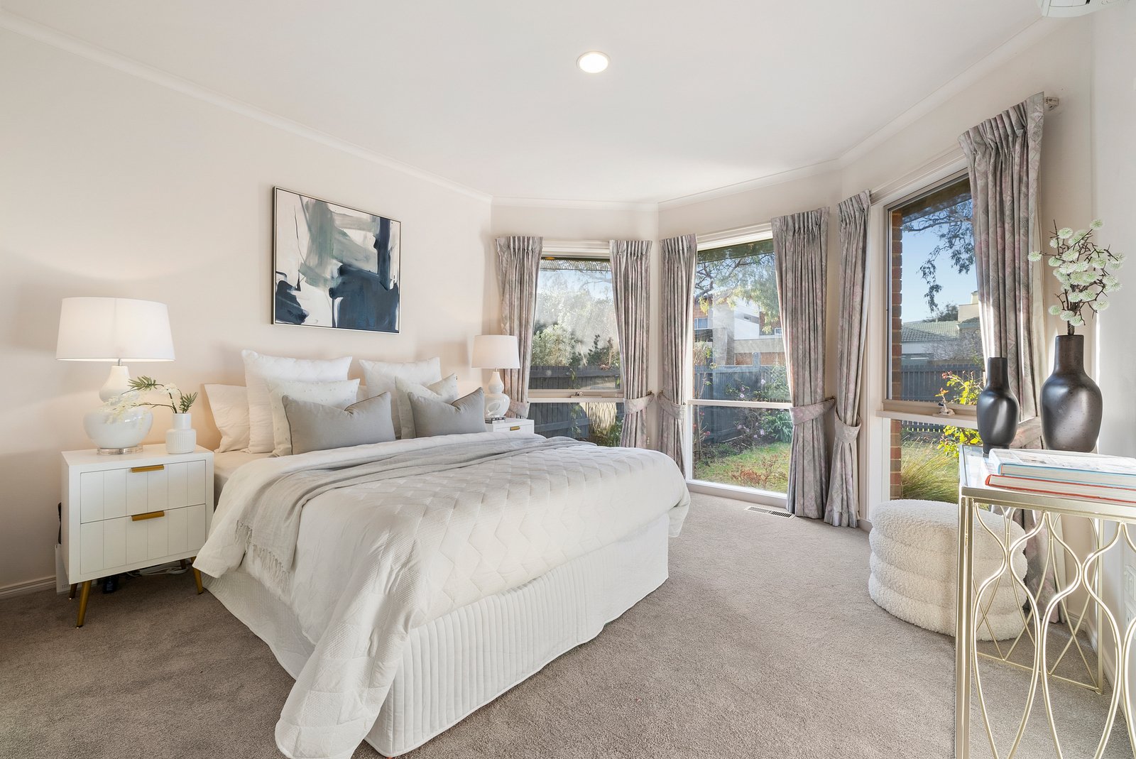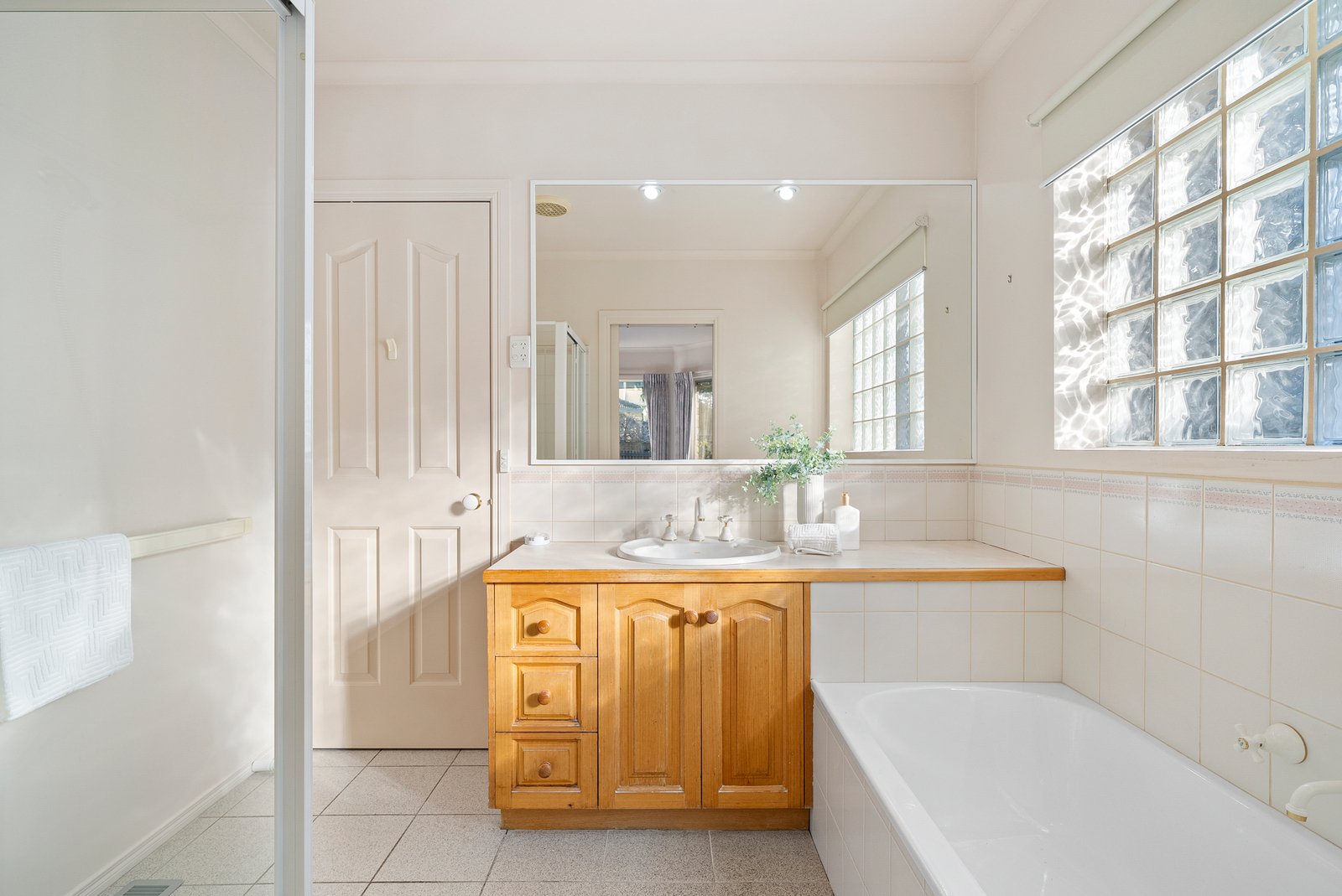 Two spacious bedrooms offer restful privacy. The master suite features a walk-in robe, bay windowed garden views, and direct access to a pristine two-way bathroom with bath and separate shower. The second bedroom, equally welcoming, is appointed with built-in robes.