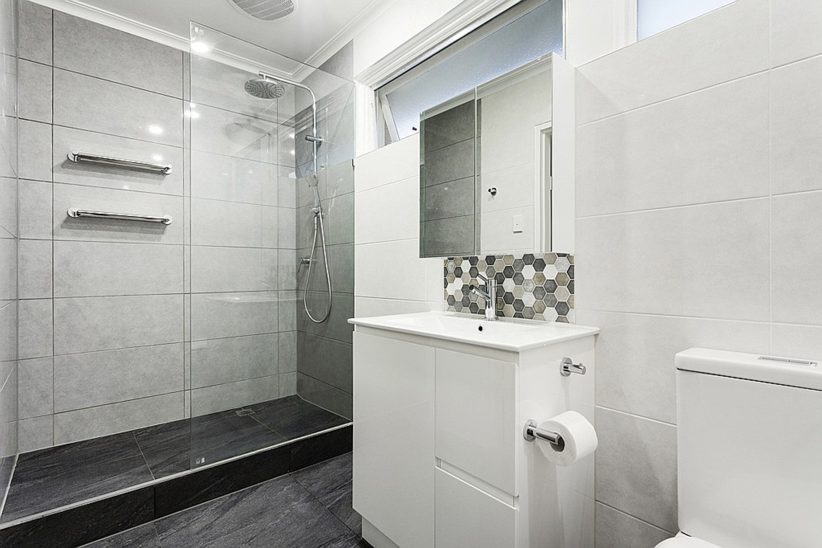 The generous bedroom enjoys a leafy outlook and features built-in robes, along with direct access to a sleek ensuite bathroom showcasing floor-to-ceiling tiling, a drophead shower, and convenient storage under the vanity.