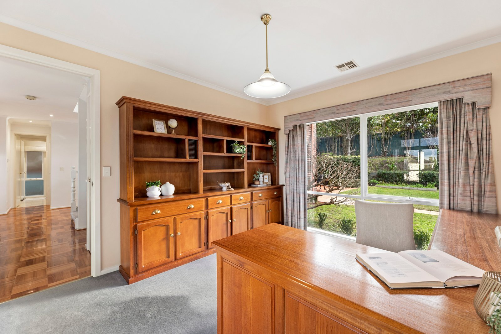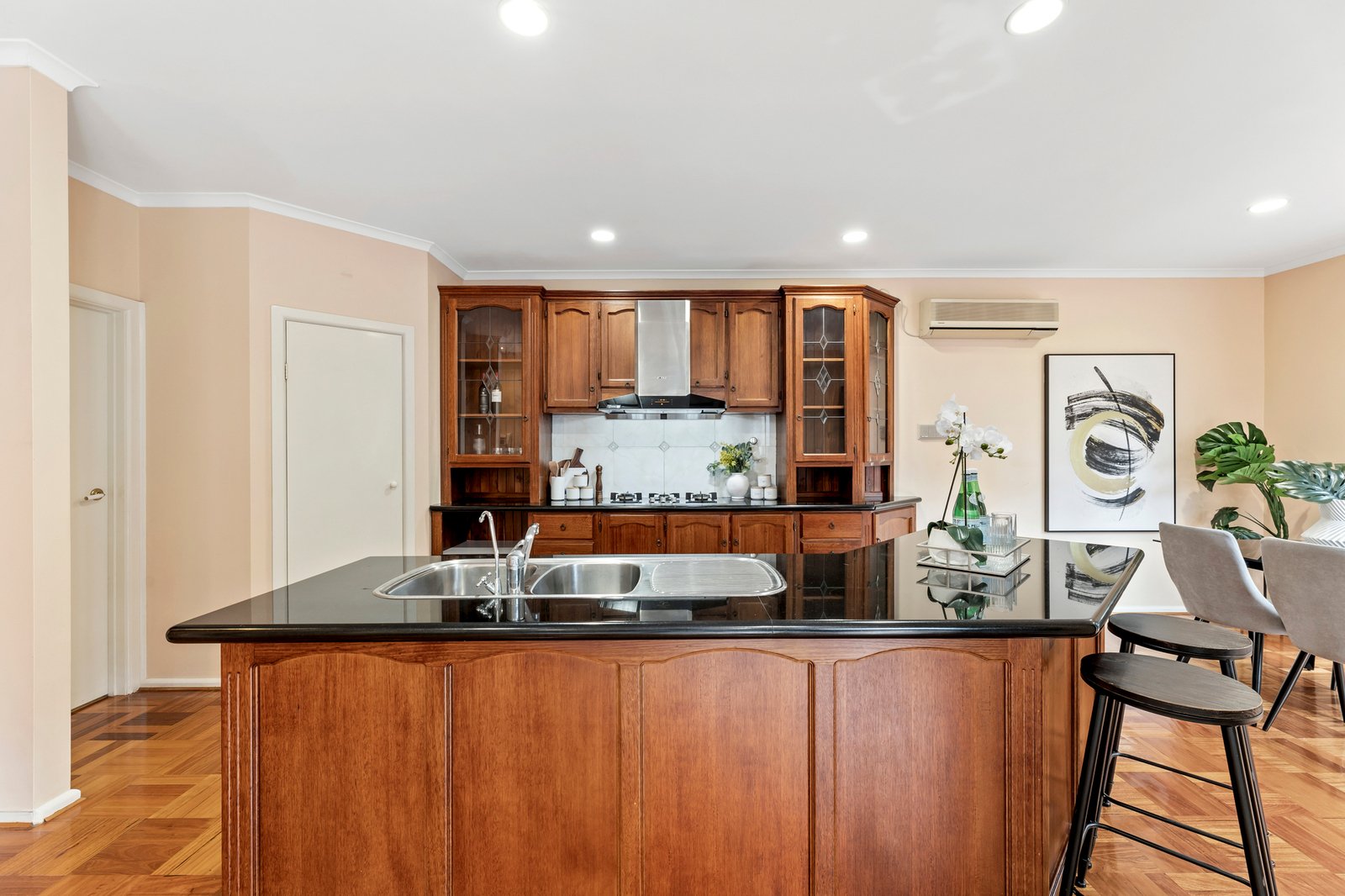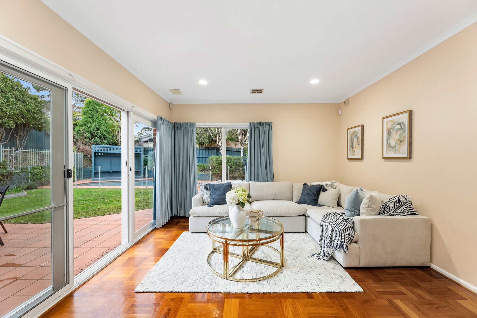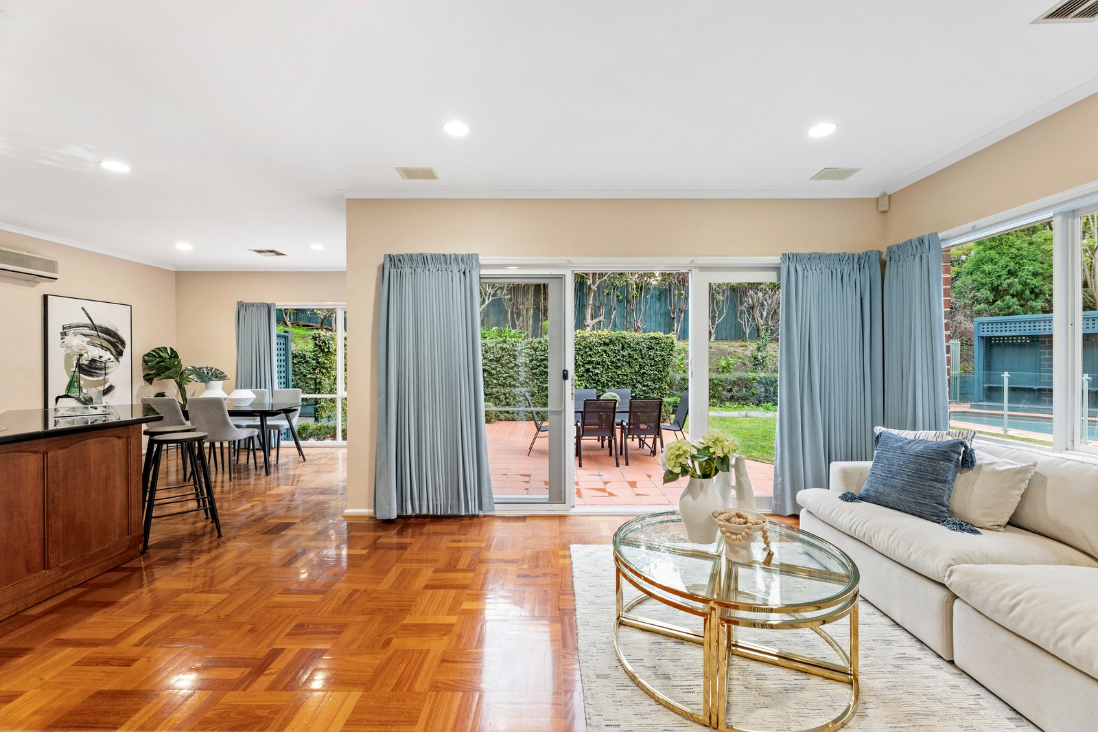 A light-filled open plan kitchen calls the family together for meals, against a lovely garden and pool backdrop. Elegant parquetry floors draw across the main living space, with carpet warming the feet in the bedrooms.