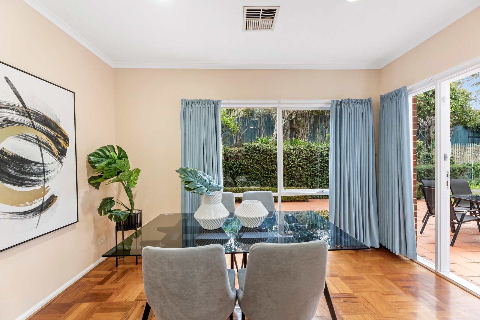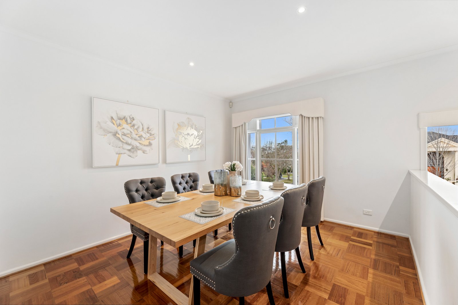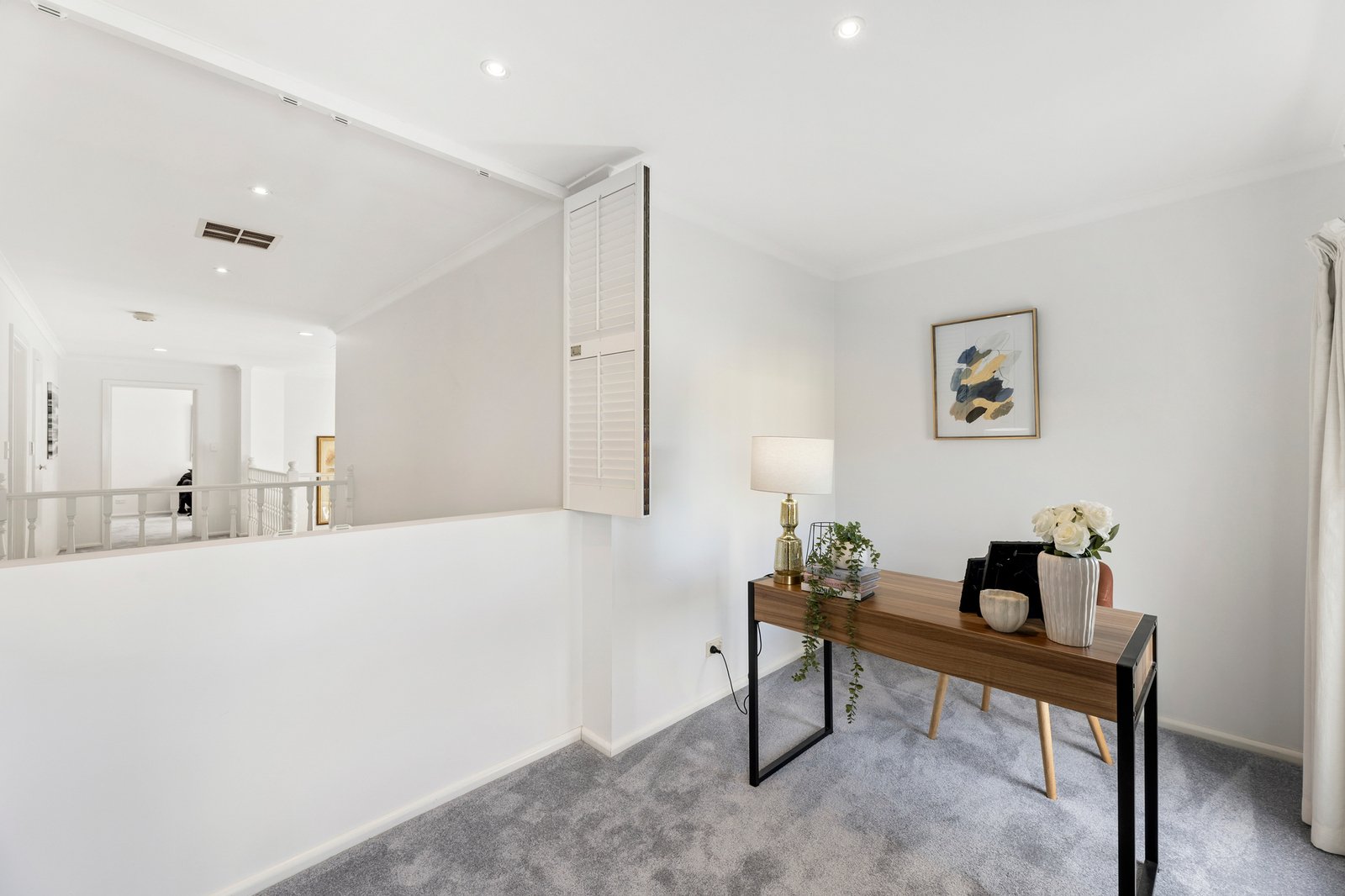 A light-filled open plan kitchen calls the family together for meals, against a lovely garden and pool backdrop. Elegant parquetry floors draw across the main living space, with carpet warming the feet in the bedrooms.