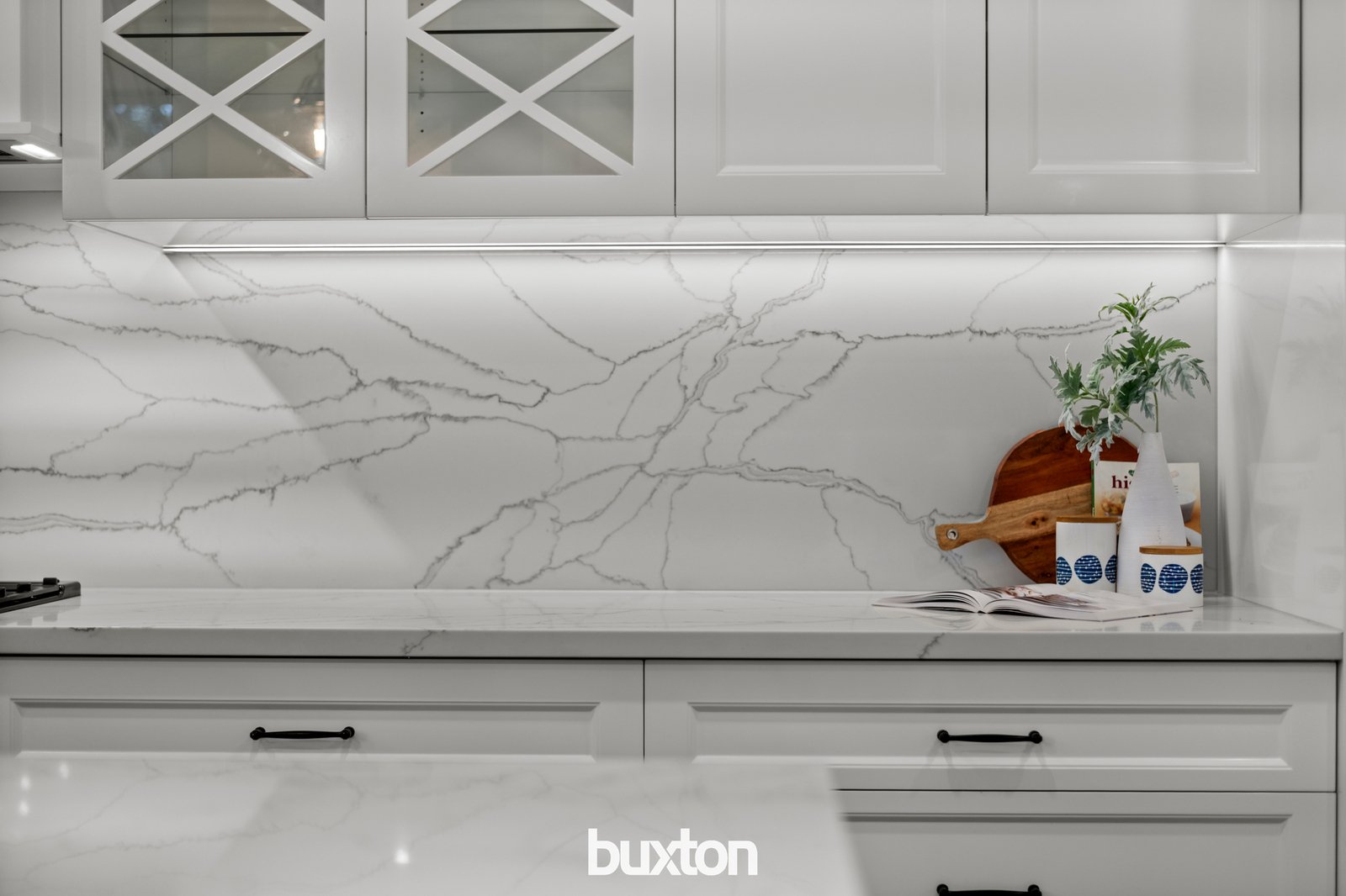A stunning Hamptons entertainer’s kitchen with a prestige British Falcon cooker and elegant Calacatta stonework makes the perfect centrepiece of the cooking quarters, all overlooking the picture-perfect pool and outdoor dance floor.