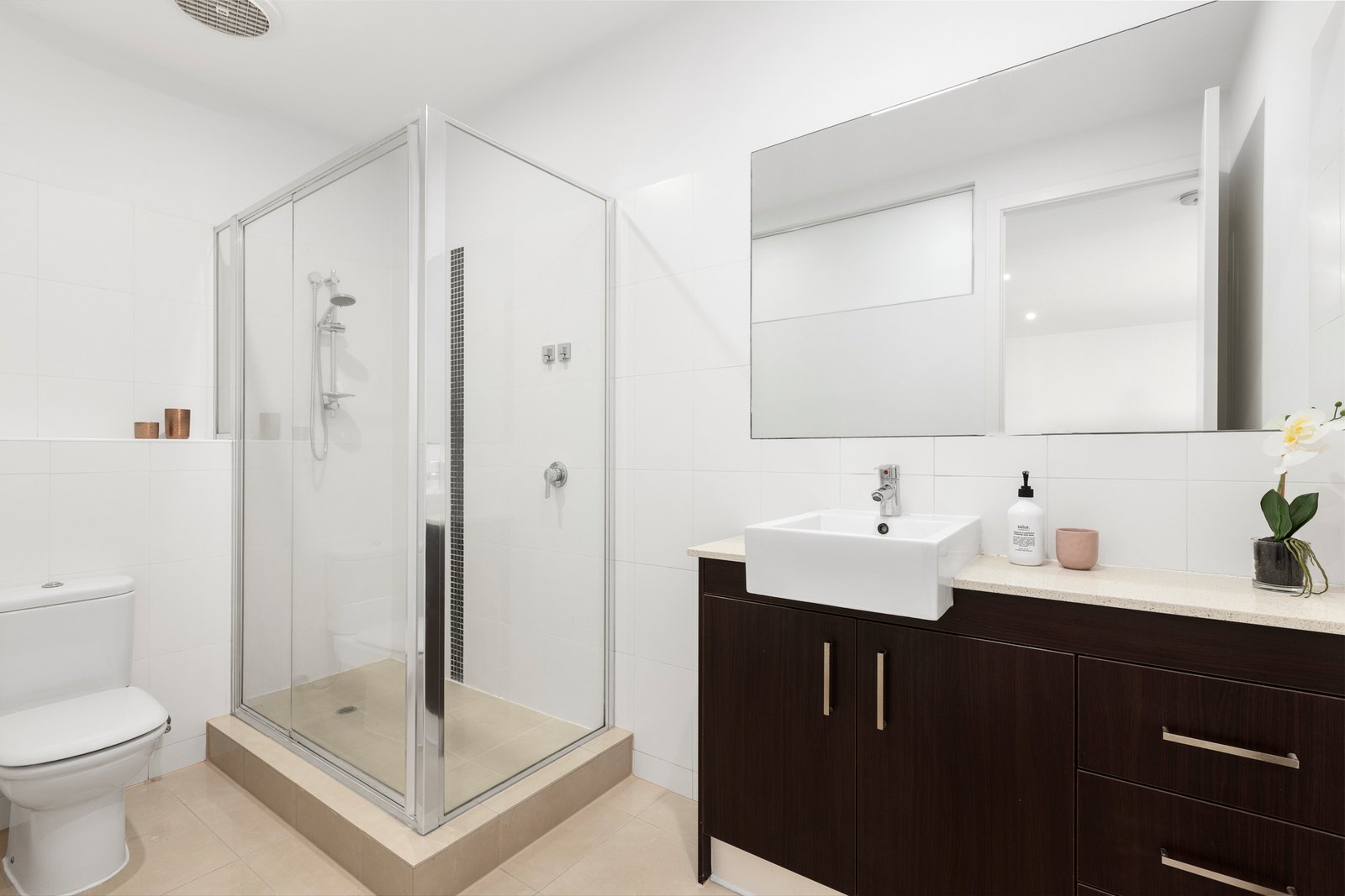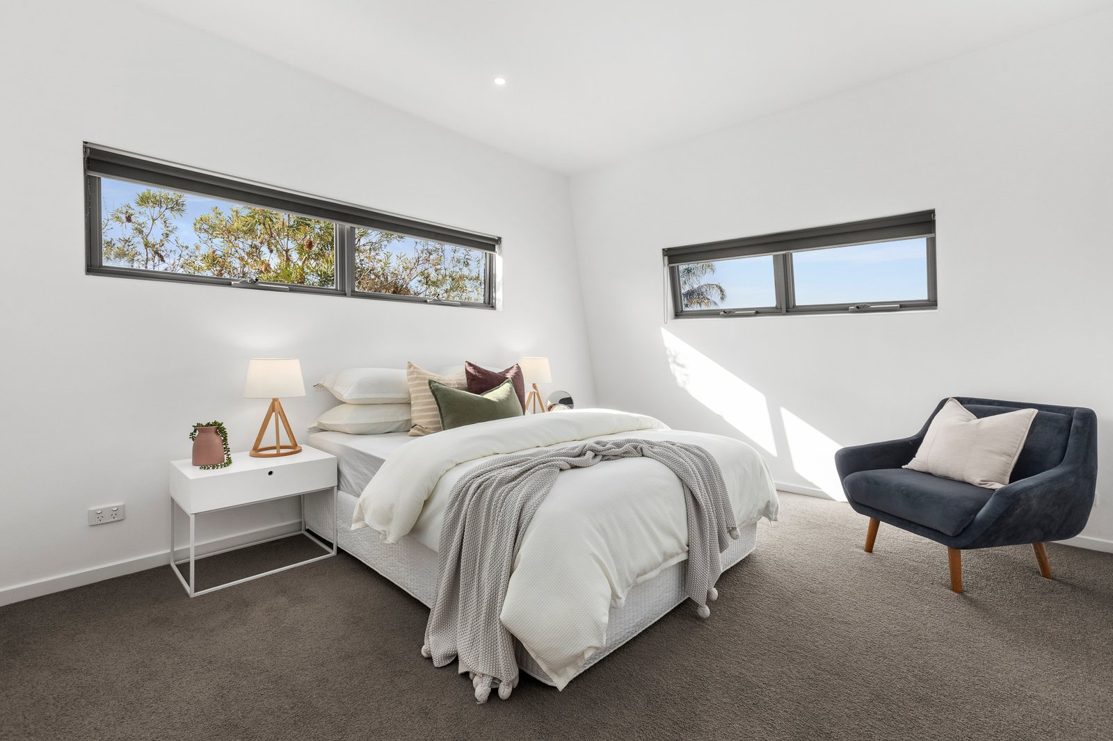 Accommodation is thoughtfully arranged across the first and second floors, with three generously sized bedrooms. Two bedrooms feature built-in robes, one with a walk-in wardrobe, and two opening onto private balconies. Two sleek bathrooms service the layout, with a separate laundry in the garage, further enhancing everyday convenience. A secure lock-up garage provides peace of mind, with intercom entry for added security, and split-system heating/cooling for year-round comfort.