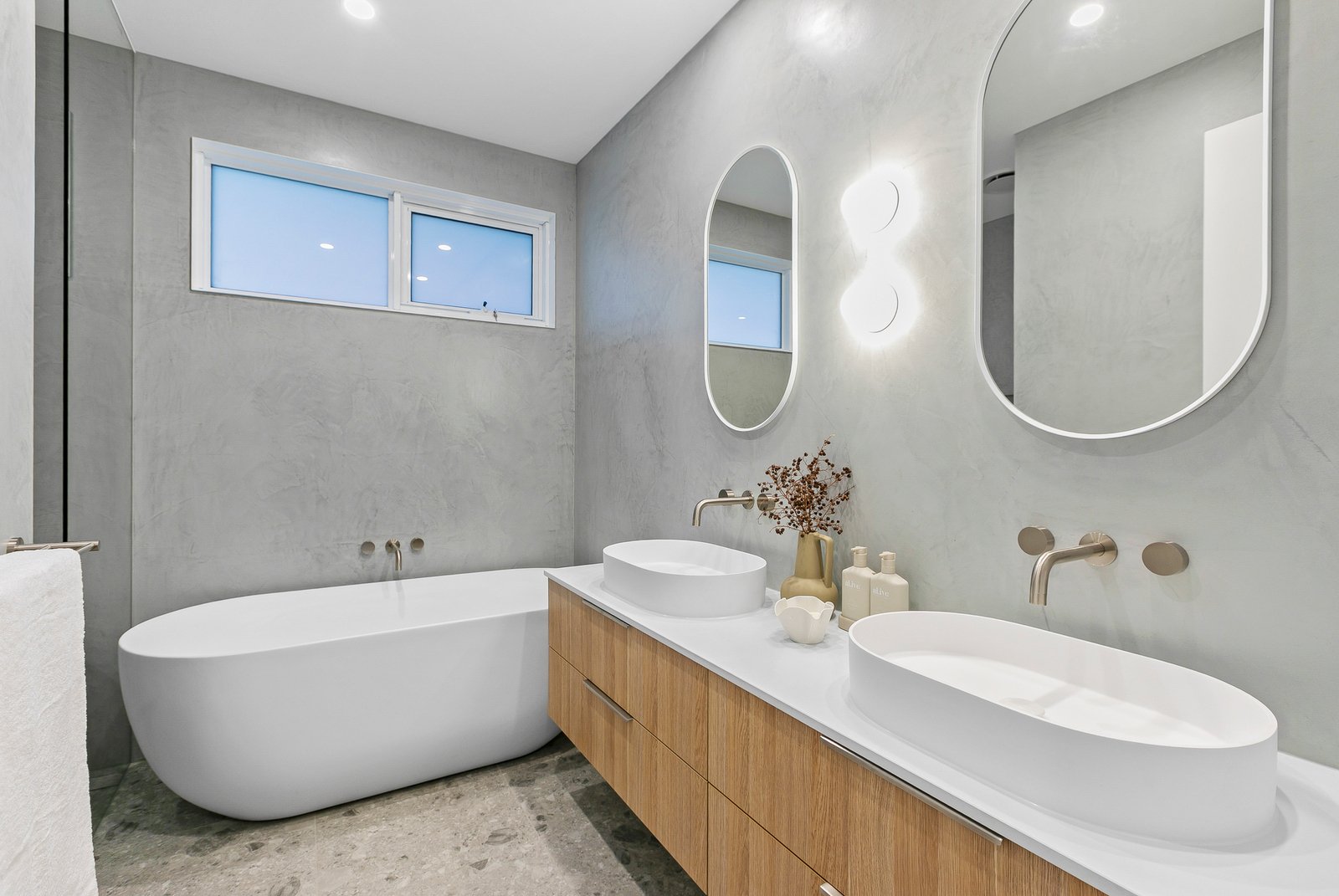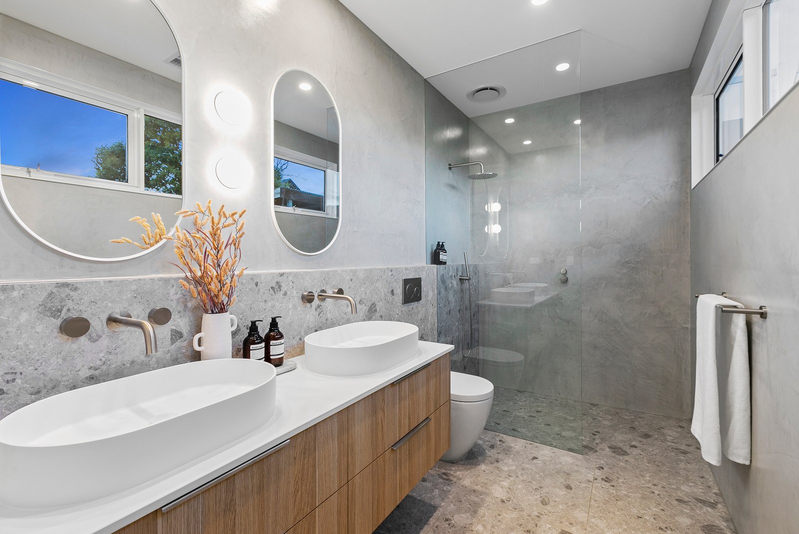 Bathrooms throughout echo the ground floor's design language with matching Veniziana Terrazzo Smoke Matt tiles and dramatic floor-to-ceiling micro cement applications - delivering consistently exceptional finishes across every surface.
