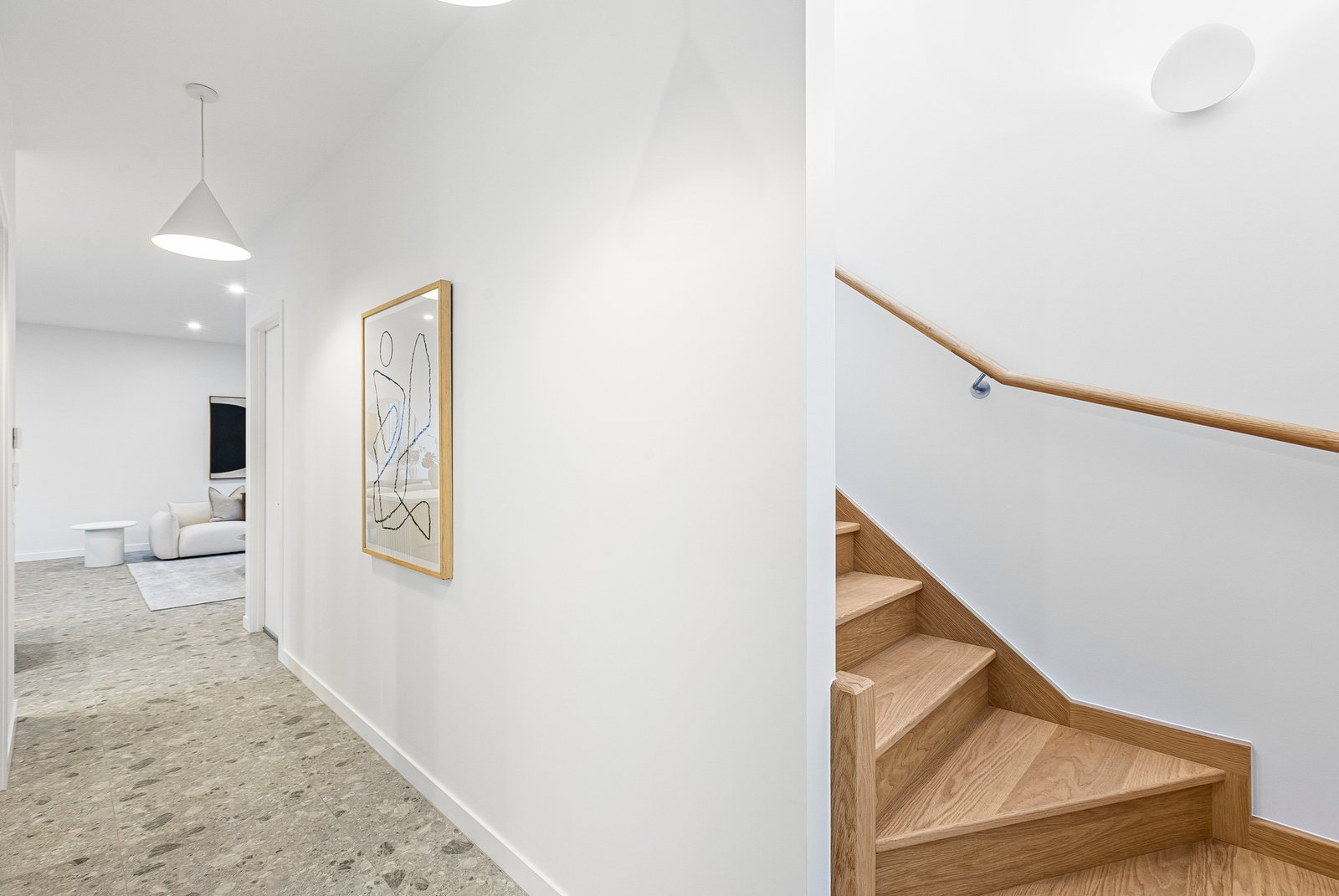 The ground floor's private master retreat offers a sanctuary of calm, featuring bespoke oak timber wardrobes and an opulent ensuite showcasing striking micro cement finishes. A refined guest powder room and oversized double garage with intelligent under-stair storage complete this level.