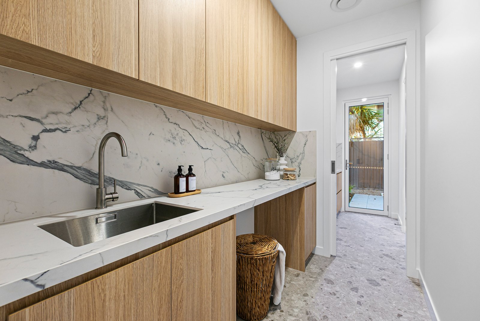 Thoughtful design extends to the dedicated butler's pantry, ensuring seamless functionality behind the scenes. A fully appointed laundry with direct courtyard access maintains the home's effortless flow.
