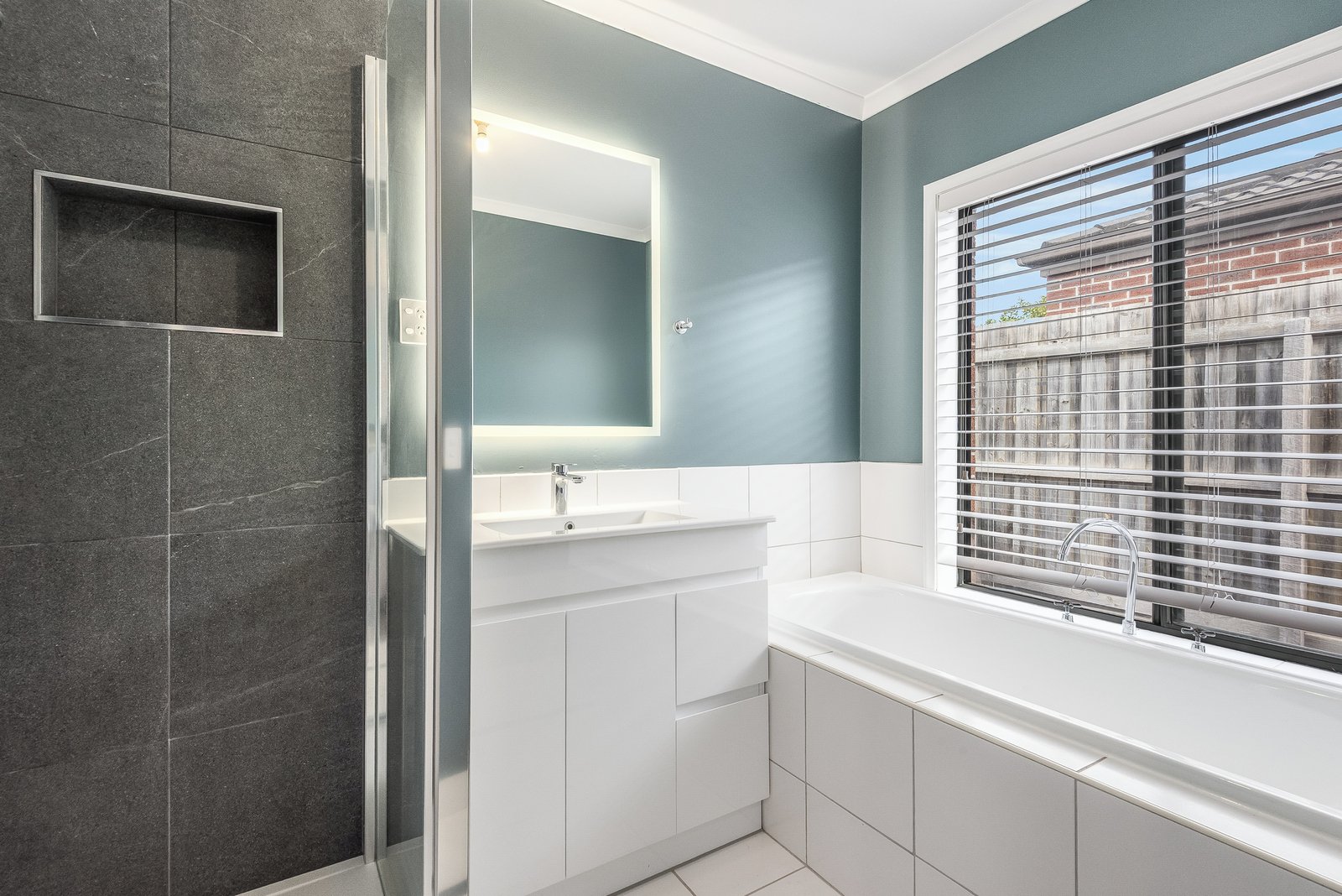 The main bedroom is positioned at the front of the home, featuring split system heating and cooling, walk-in robes and a tastefully presented ensuite. Two additional bedrooms are separately zoned at the rear, both include built-in robes, serviced by a stylish main bathroom with luxurious bath, separate shower and modern vanity with LED mirror lighting. A separate toilet, well-appointed laundry, and walk-in linen storage further contributes to the fantastic functionality of the home.