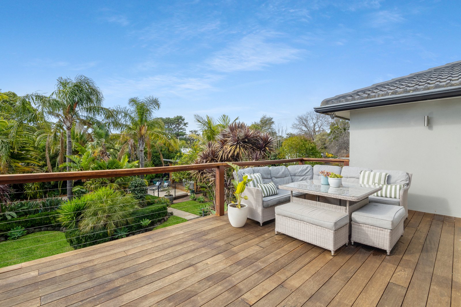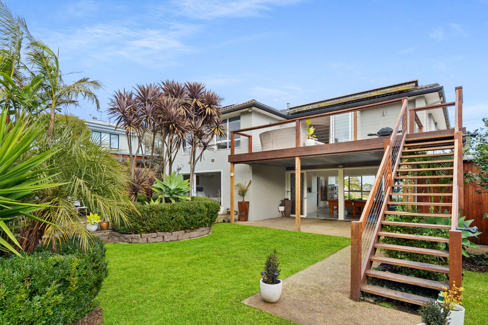 Curvilinear pool edges and a spa are cocooned by towering palms and deep tropical greenery, creating an unmistakable oasis reminiscent of holiday living. A nearby lemon tree is perfectly placed to garnish poolside beverages on demand, while the 1,051 sqm (approx) lush garden setting also features a firepit area, water tank, and a double tandem garage with workshop and solar panels.