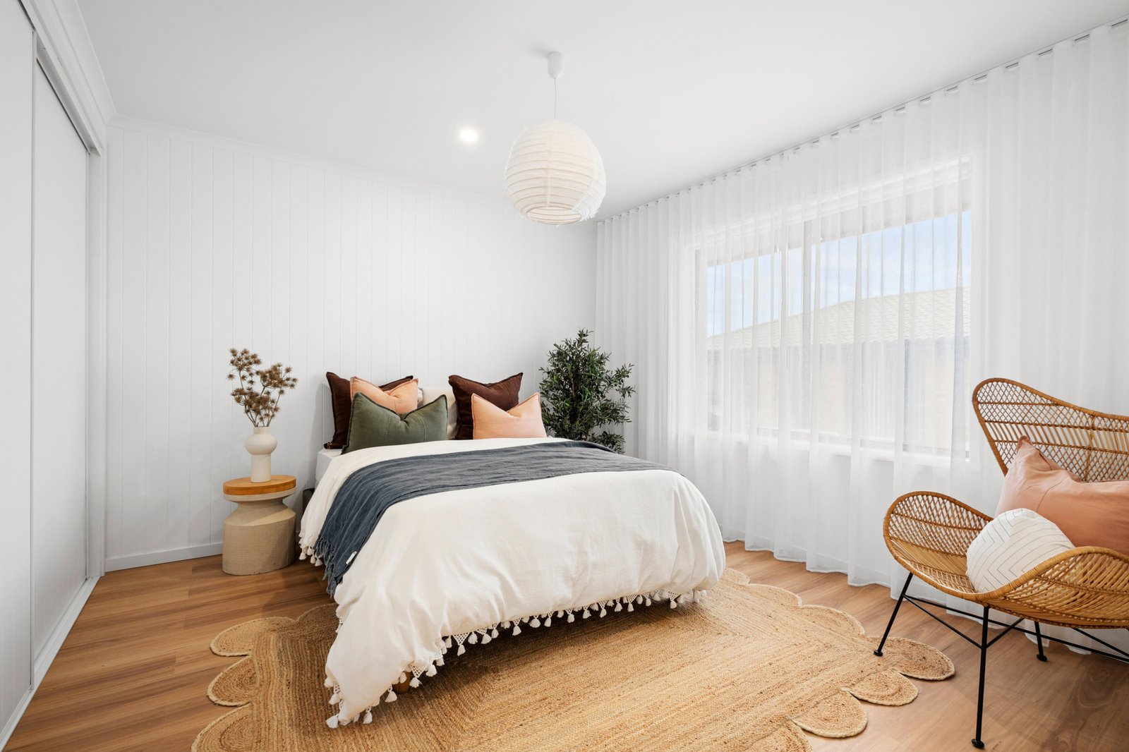 The complex is set amongst established gardens, creating a private and tranquil setting. Entry to the home reveals a light filled open plan kitchen and living area with crisp white interiors, polished timber floors and stylish floor to ceiling sheers. The well-appointed kitchen is equipped with a 600mm oven and cooktop.