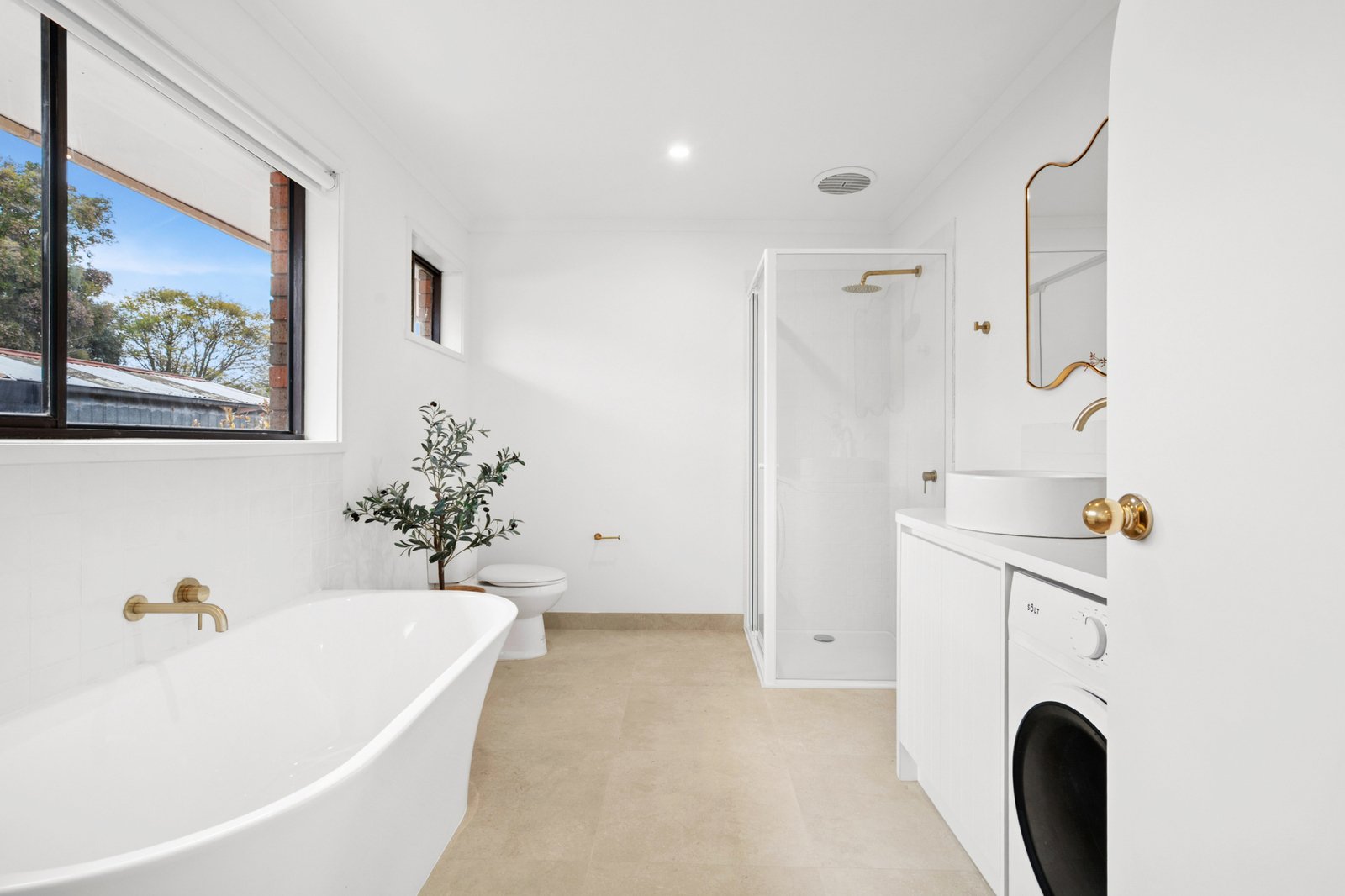 The spacious bedroom includes generous built-in robes, serviced by a bright bathroom, incorporating laundry facilities and linen storage for fantastic functionality.