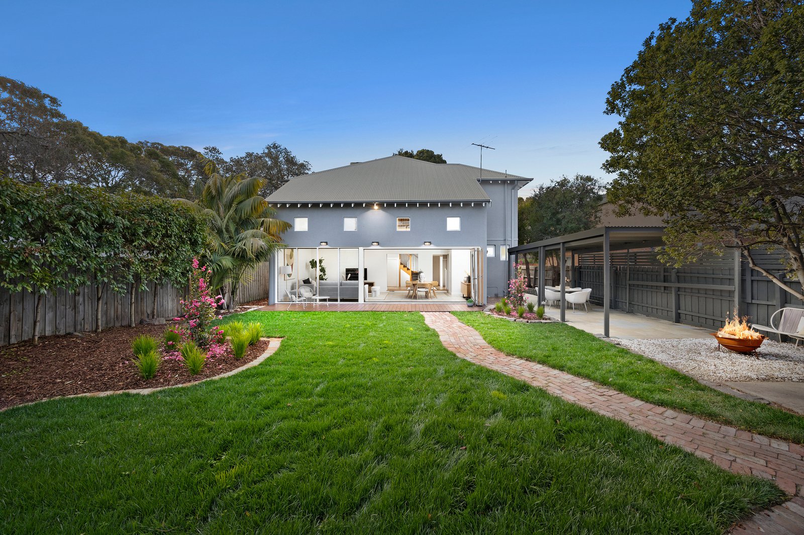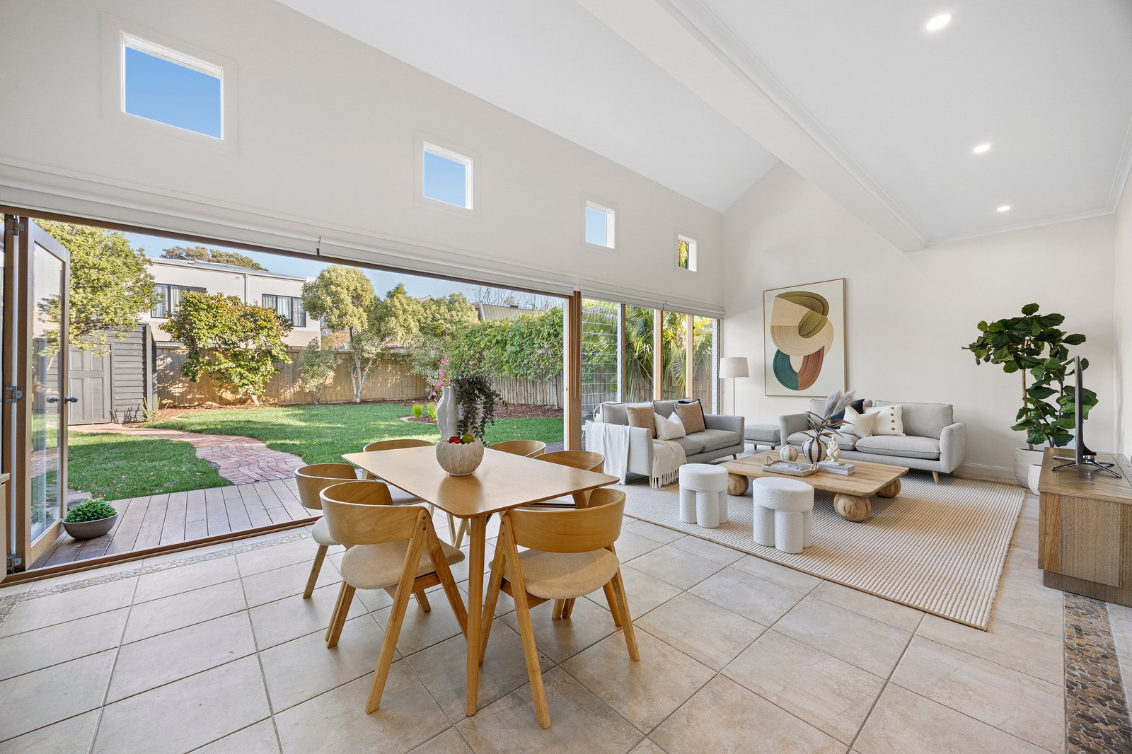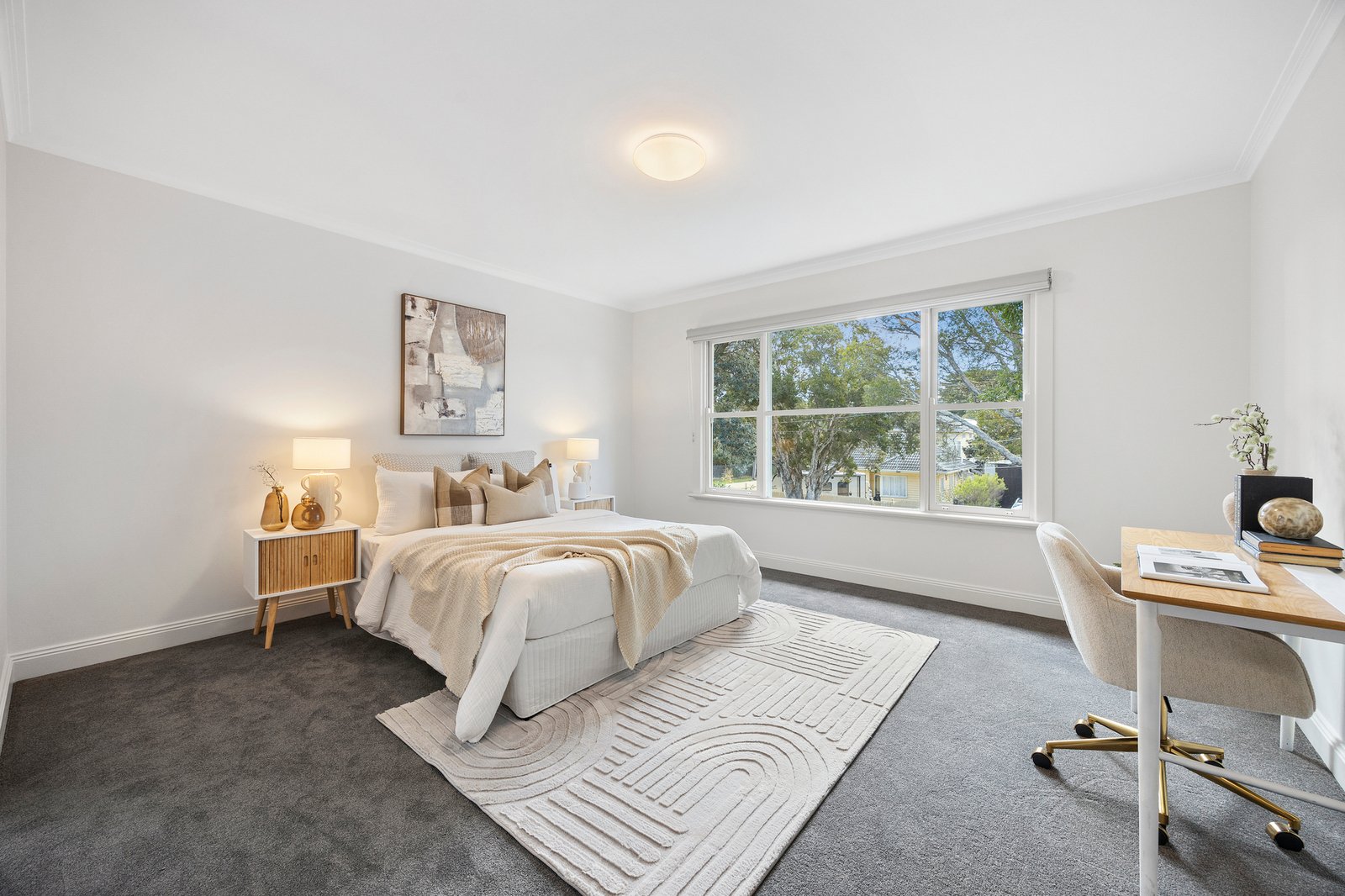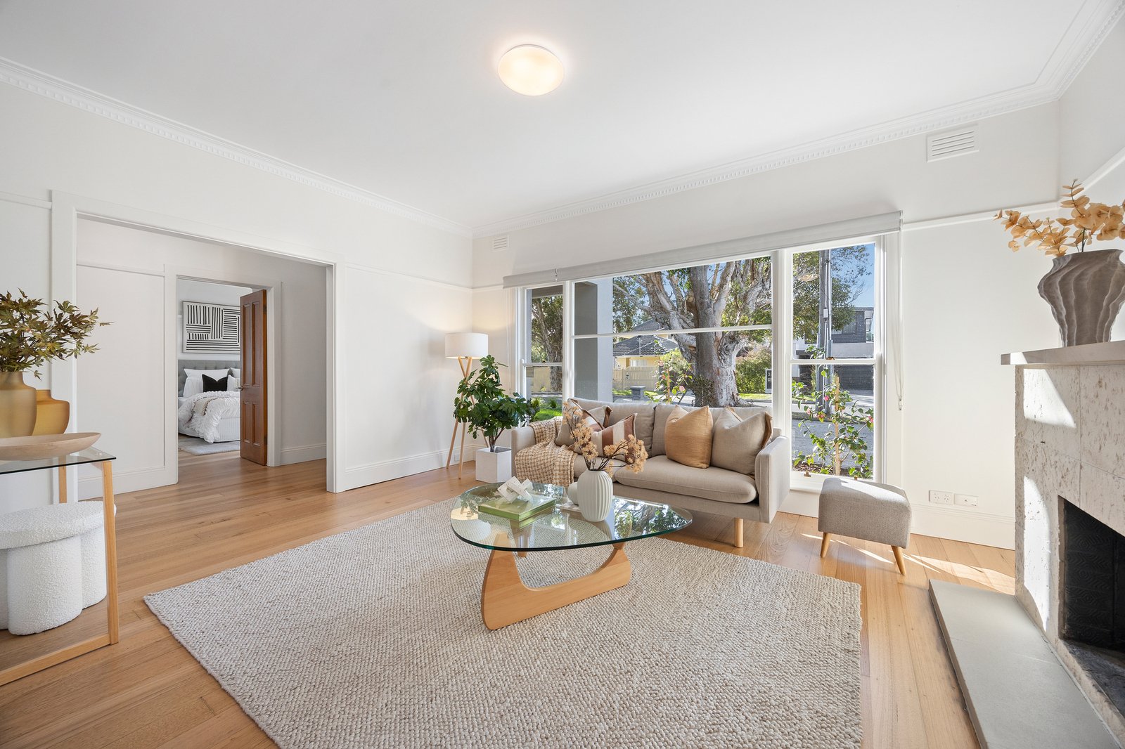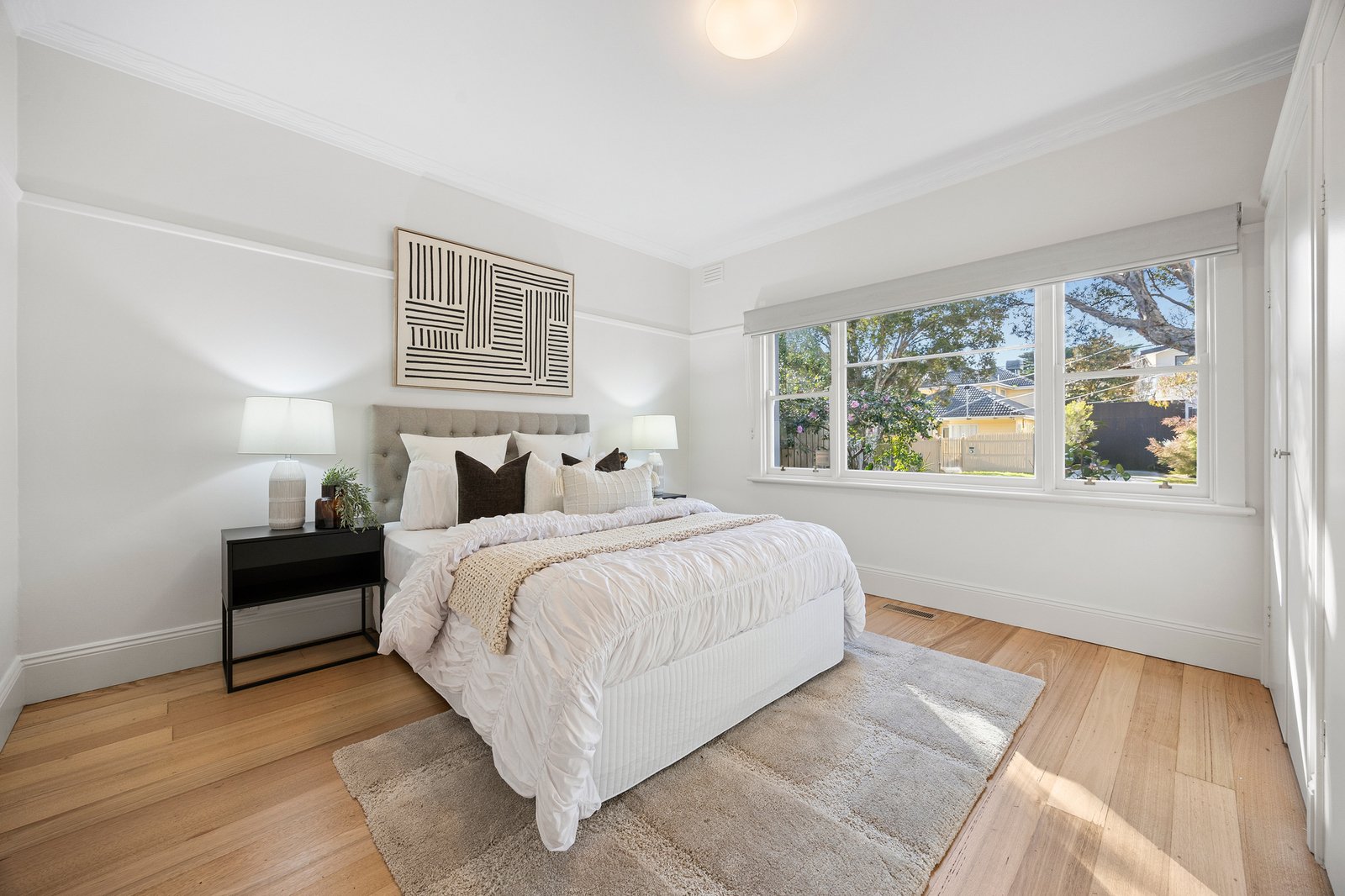 Beyond an elegant soft grey rendered façade, the refreshed interiors feature lofty ceilings and original hardwood floors that have been newly polished to reveal chic pale oak – these flow from the entrance hall to the formal lounge where a huge picture window soaks up northern sunshine. At the heart of the layout, the modern stone kitchen boasts stainless steel appliances, while the wonderful family & dining zone stretches wide beneath a soaring cathedral ceiling. Bi-fold doors can be thrown back to connect the interiors with a deck, a generous lawn, and a sheltered alfresco patio.
