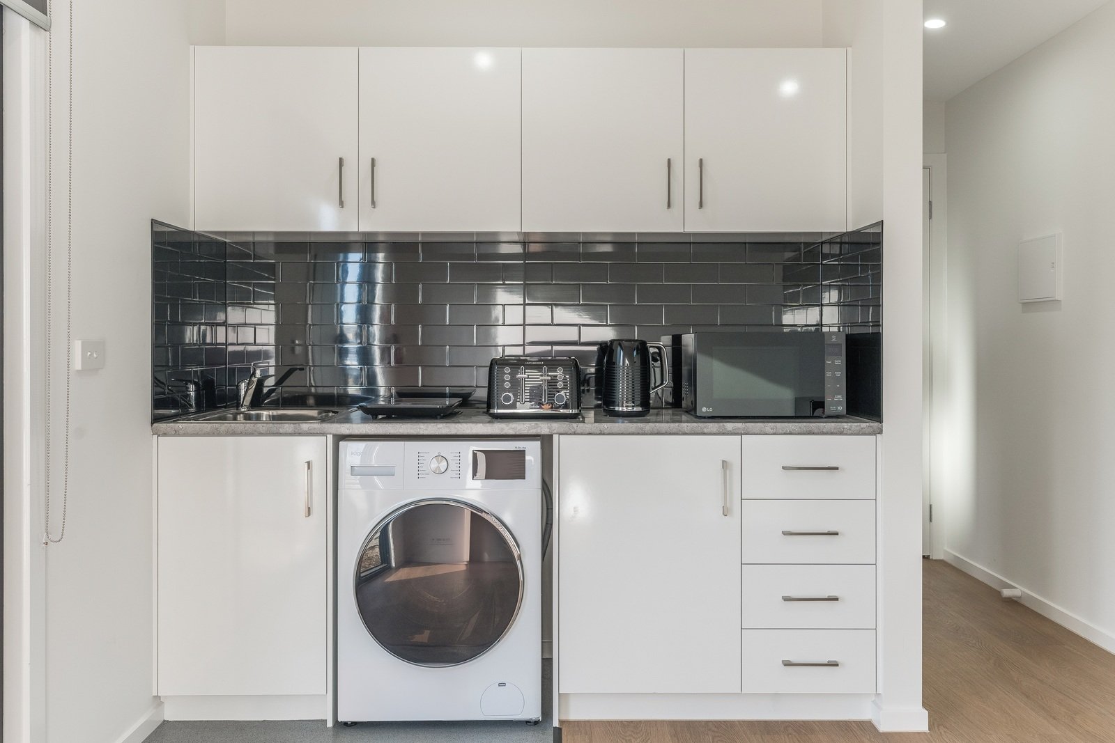 The kitchenette boasts sleek and stylish fixtures, and offers a European style laundry including a washer and dryer combined in one.