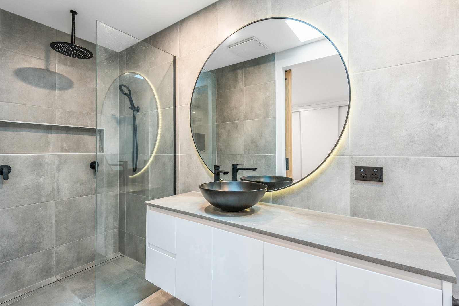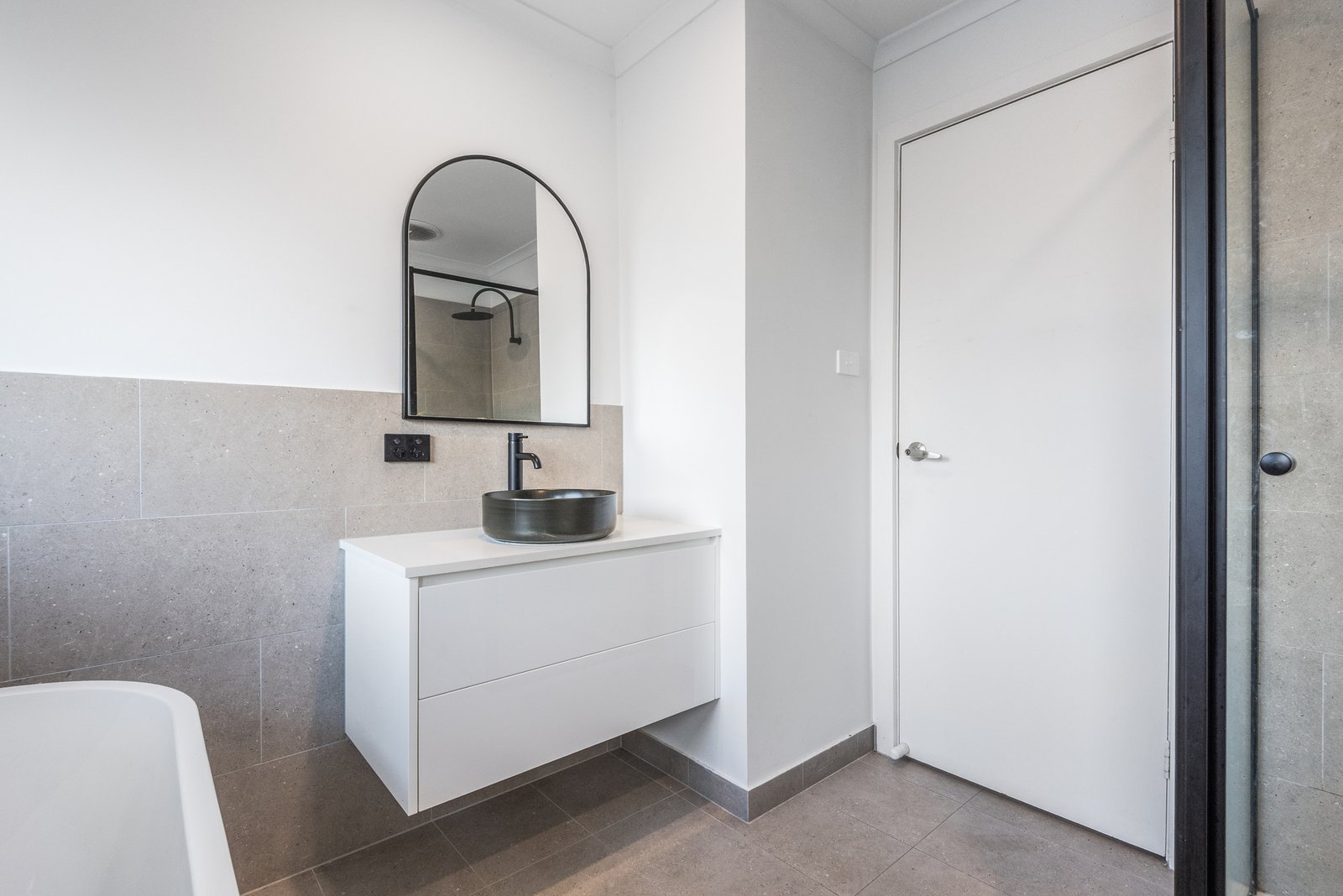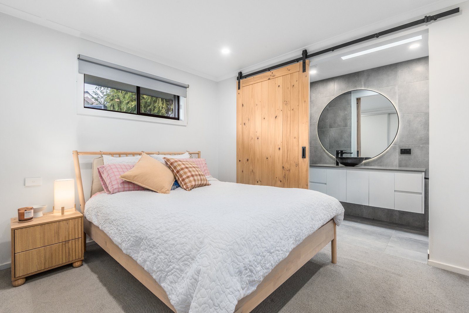 The main bedroom features split system heating and cooling, generous built-in robes, and a stunning barn door leading to the luxurious ensuite, finished in floor to ceiling tiles, with frameless glass walk-in shower, dual shower heads, modern vanity, and chic black tapware. Two additional bedrooms include built-in robes, serviced by a stylish main bathroom with freestanding bath and separate shower.