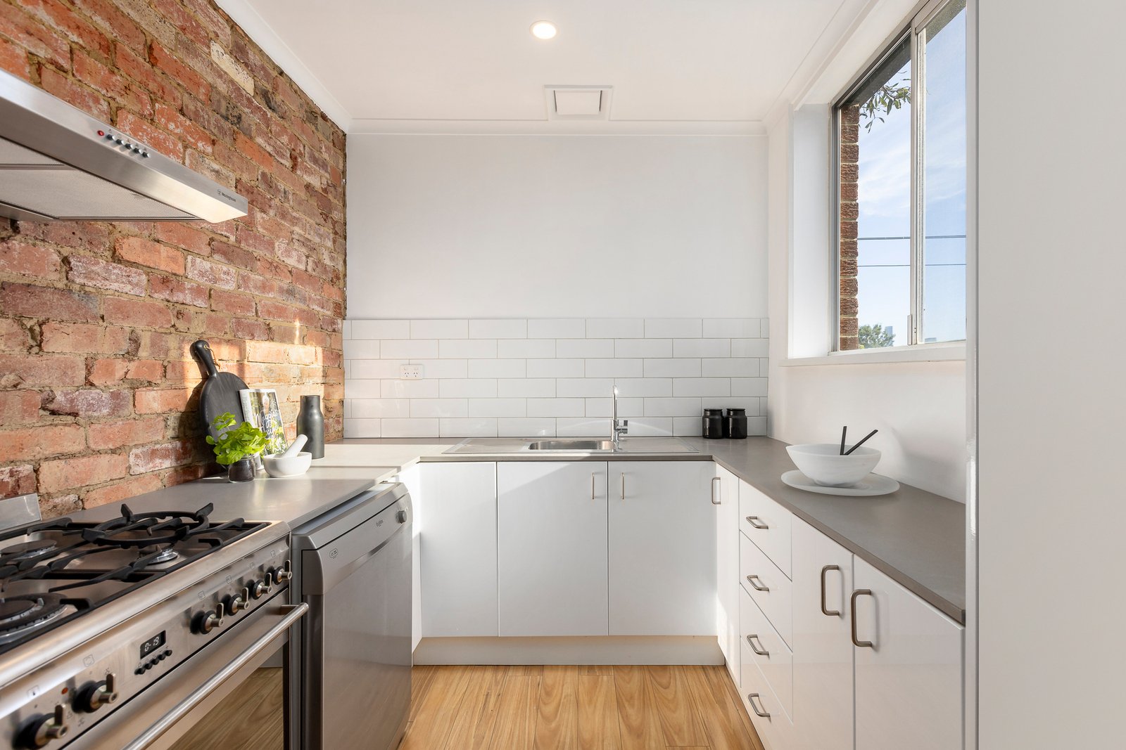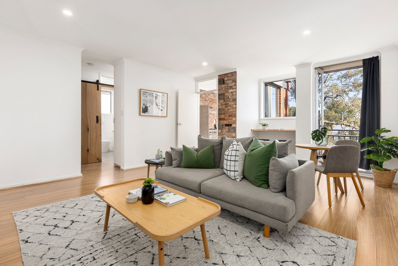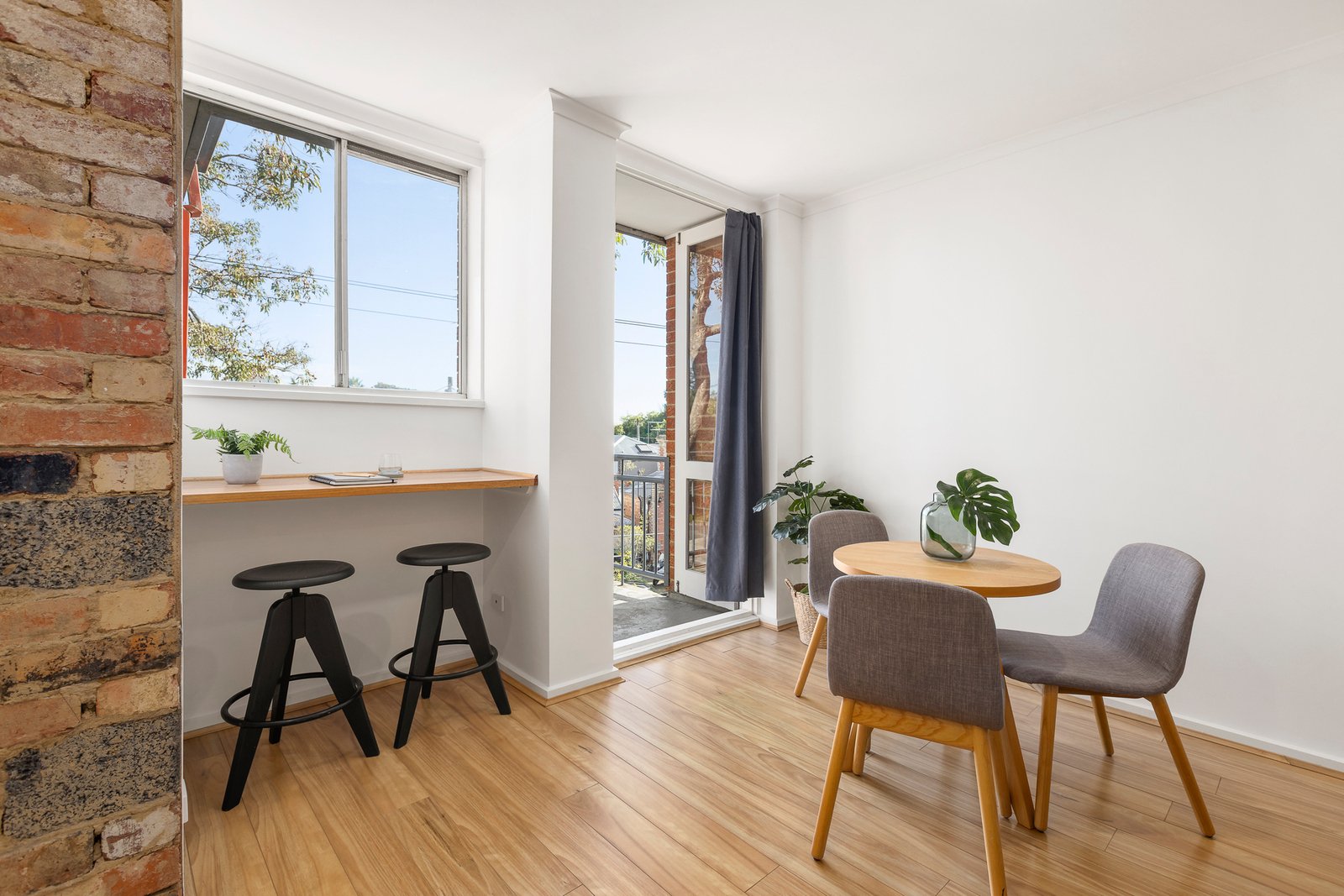 The sunlit living and dining area showcases engineered timber floors, an exposed brick feature wall and split-system air conditioning.