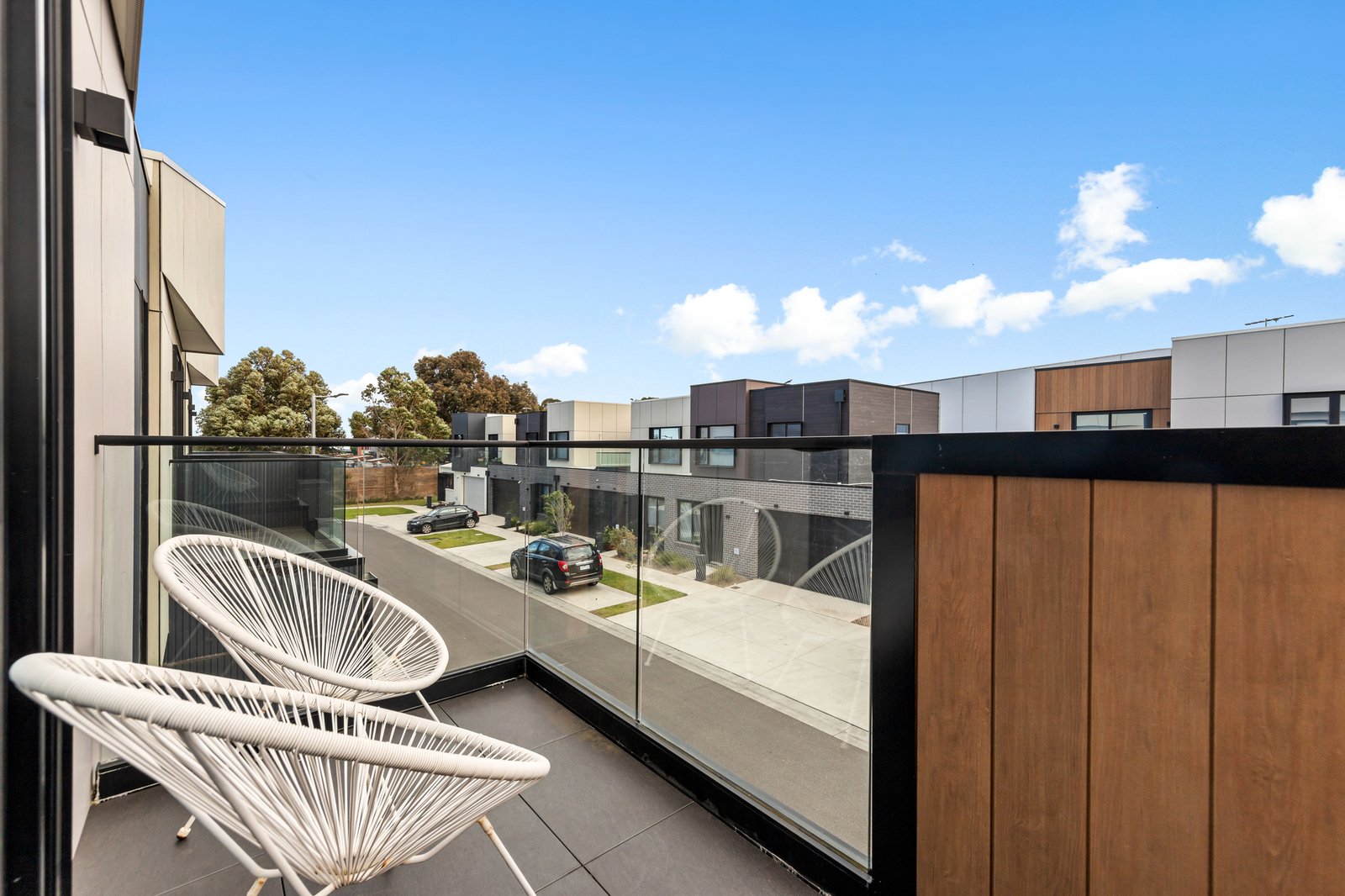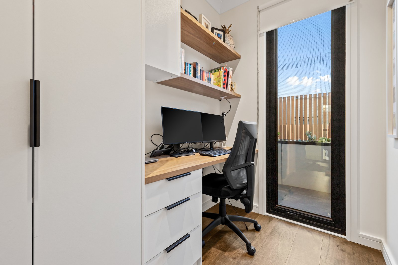 Upstairs features a dedicated study area, while the master bedroom offers direct access to the front balcony, a built-in robe, and a generously sized ensuite that also functions as a central bathroom for the second bedroom via a separate entrance. The second bedroom includes its own built-in robe and opens to the rear balcony, enhancing the home's bright and airy feel.