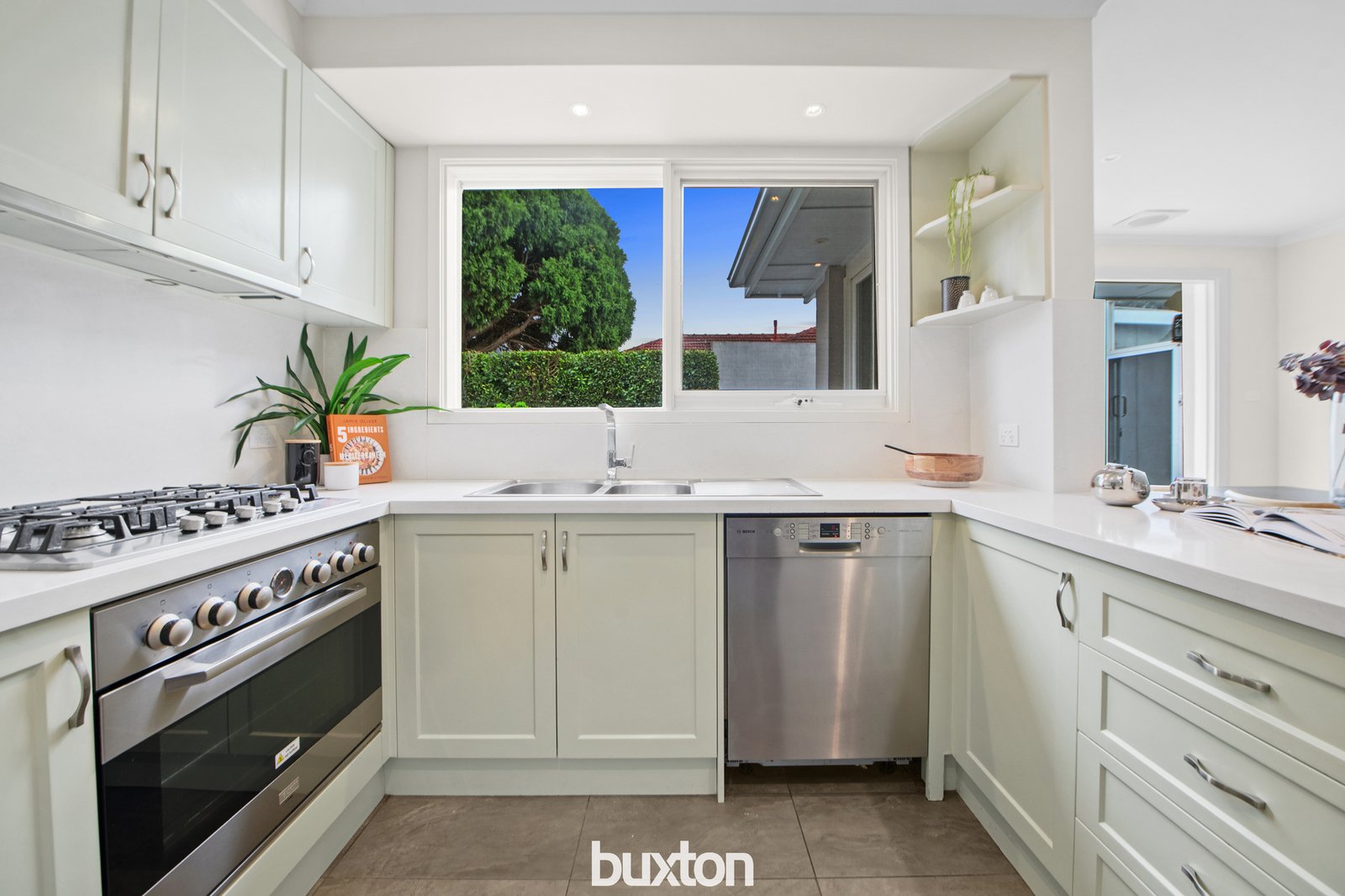 A contemporary kitchen delights with sleek stone benches, a Neil Perry oven, Bosch dishwasher, appliance cupboard and beautiful views across the European-inspired terrace.