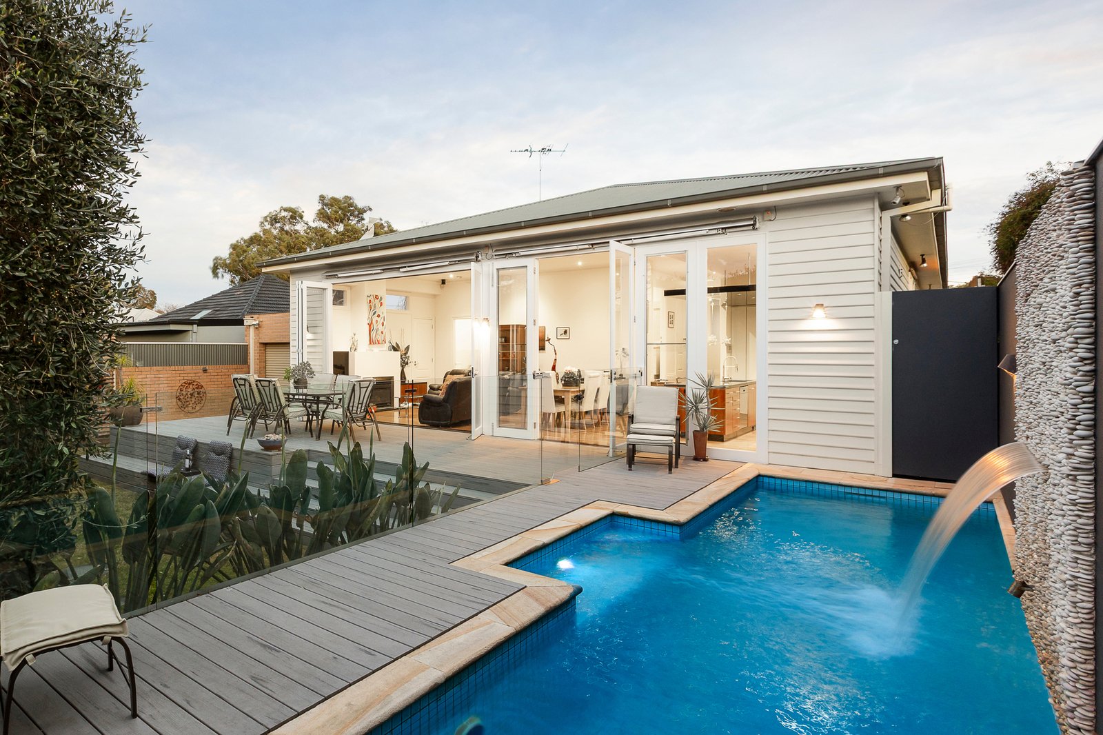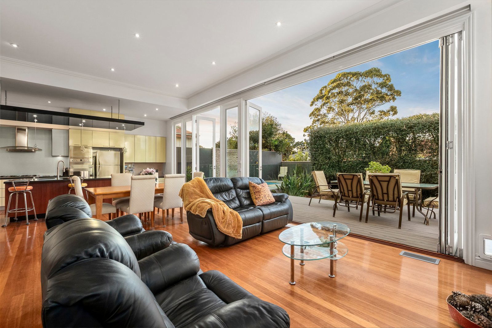 Beyond a securely gated front fence and a beautifully manicured front garden, discover a peaceful indoor-outdoor oasis that has been designed to cater to every stage of family living with effortless ease. Upon entry, a central Blue Gum foyer welcomes guests inside and leads past the four bedrooms - or three and an additional living room/home office – to the rear living/dining area. Seamlessly connected to its surroundings via banks of bi-fold doors, this breathtaking space is crowned by soaring ceilings and basks in glorious northerly sunshine, whilst taking in views of the sparkling fully-tiled pool with serene water feature.