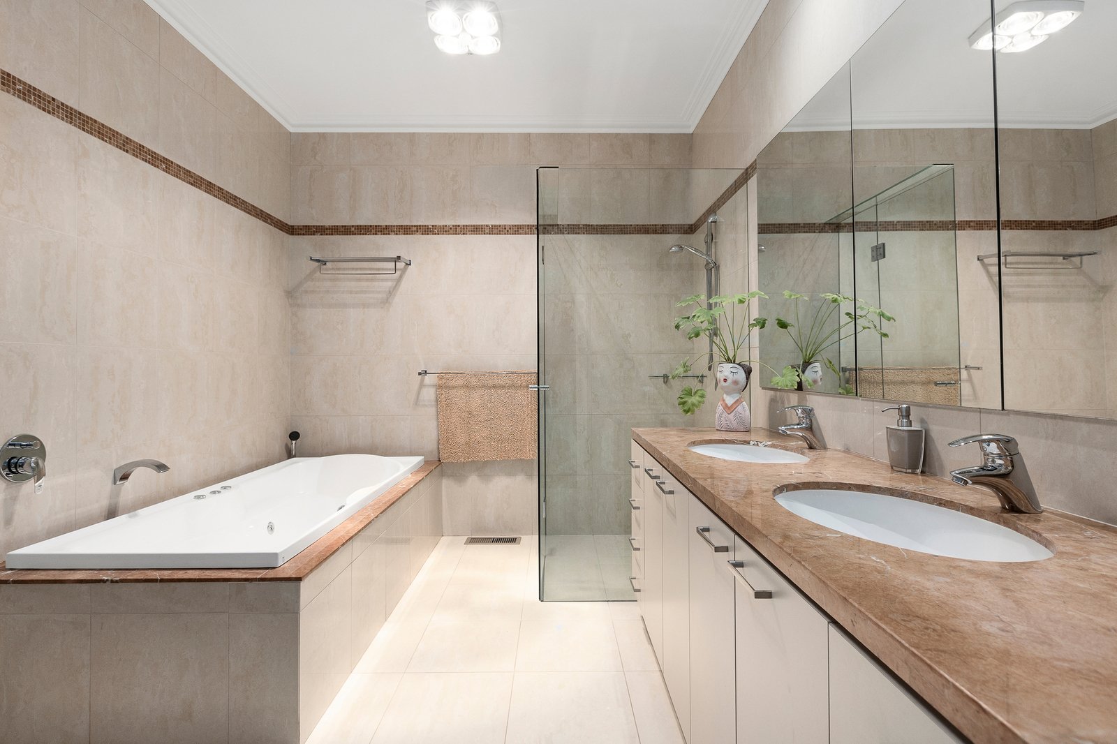 With the luxury of two bathrooms – including the sumptuous master ensuite with double shower – among the home’s additional standout features are a basement theatre with wet bar, a wine cellar, spa bath, gas ducted heating, refrigerated cooling, full laundry, auto blinds & retractable awnings. There is also a double auto garage with ample storage, sink, rear roller door access and handy shopper’s entrance.