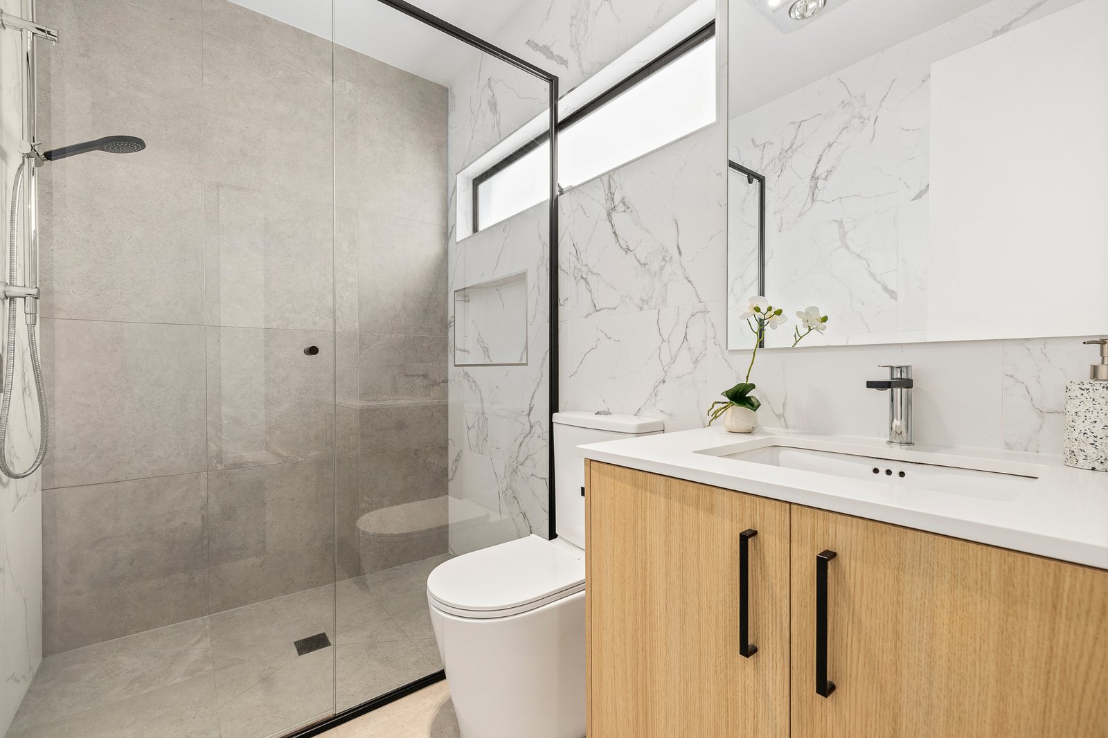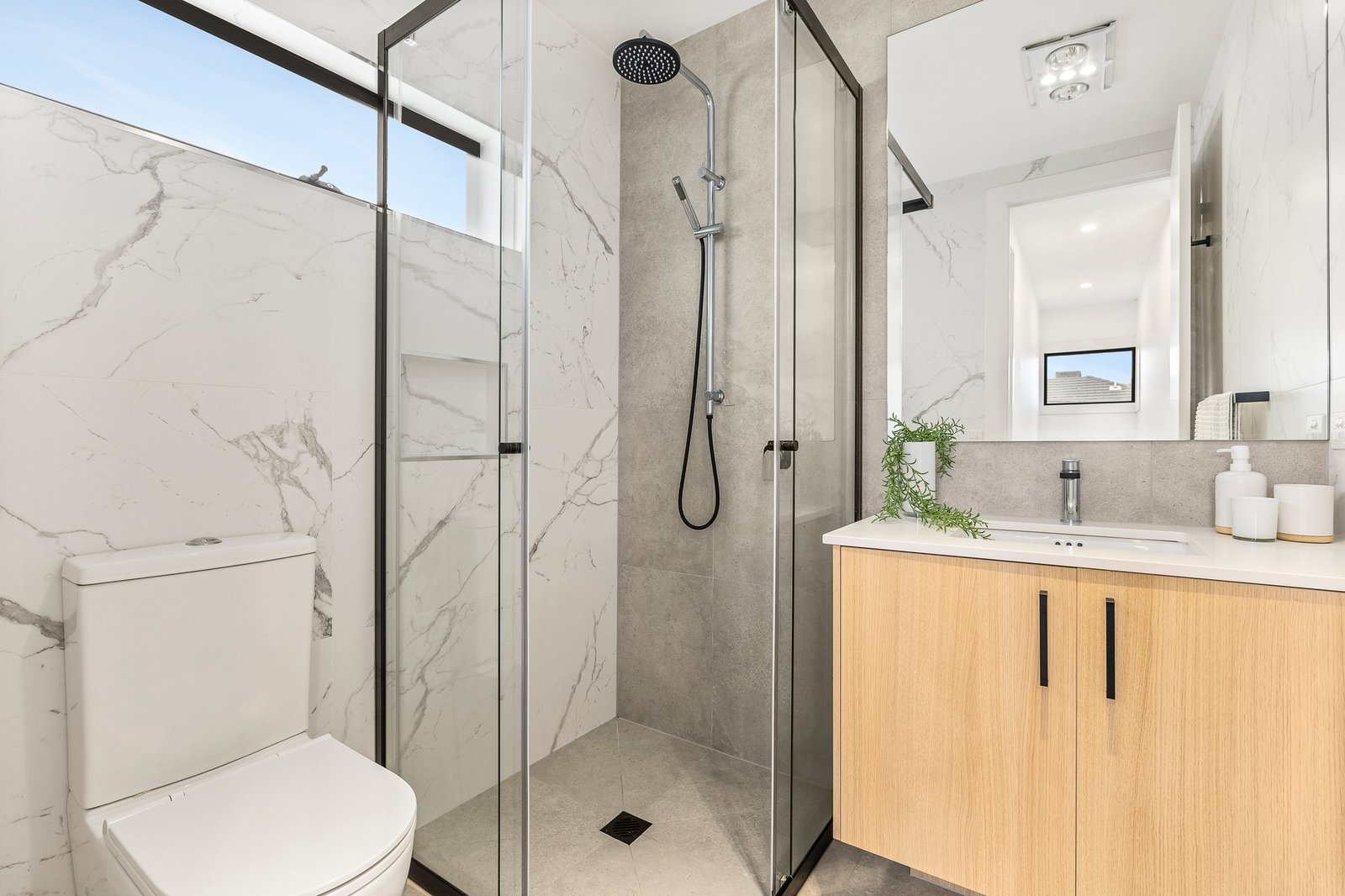 Upstairs, you'll find three generous bedrooms with built-in robes (main with luxe ensuite), while a chic powder room, Euro laundry, and understair storage enhance functionality. Every detail has been finished to perfection—Carrera marble-look tiling, black and chrome finishes, individual room split-system heating/cooling, a video doorbell linked to your phone, security alarm system and a water tank.