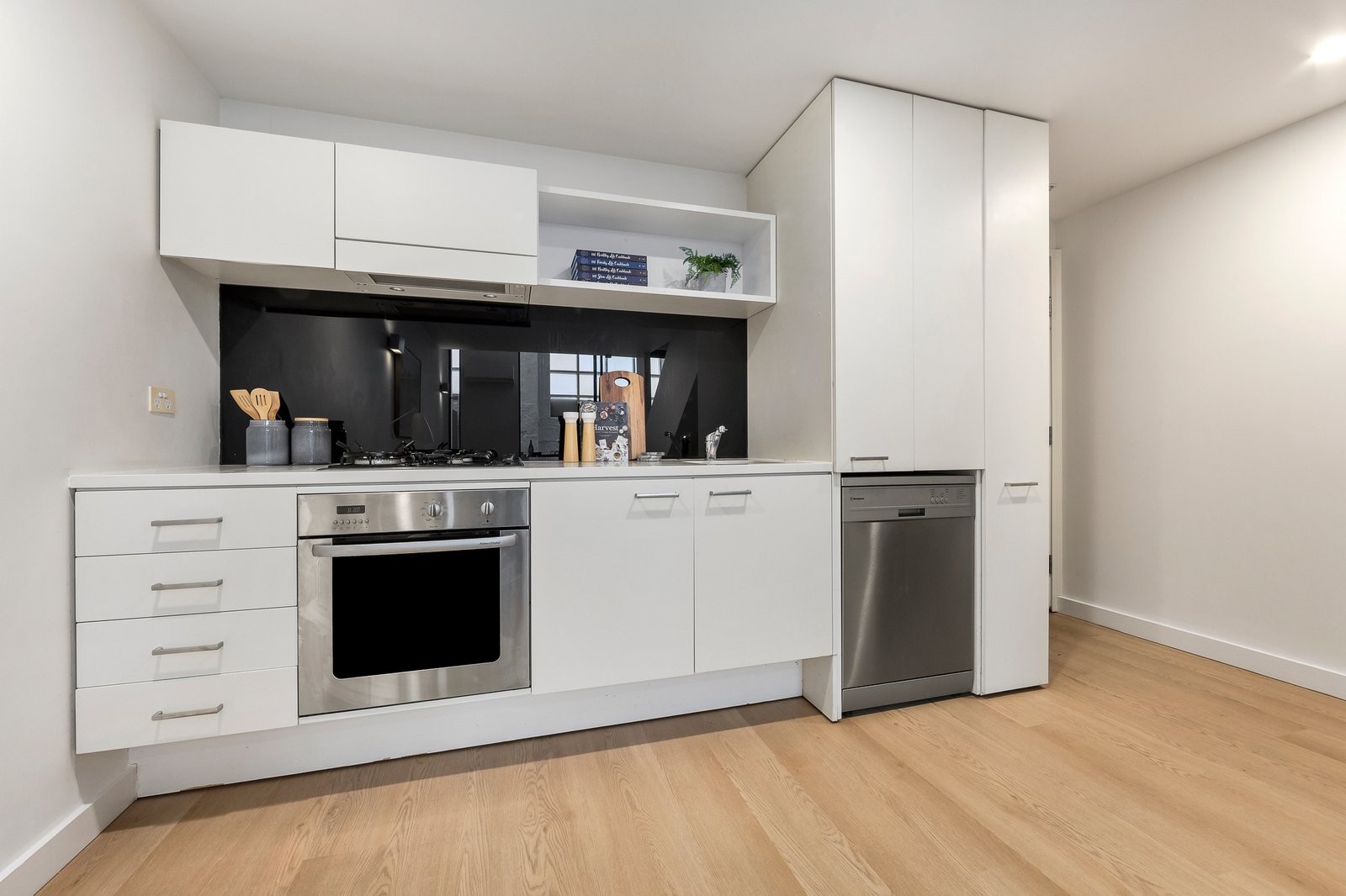 The sleek kitchen is appointed with stone benchtops, stainless steel appliances, and gas cooking.